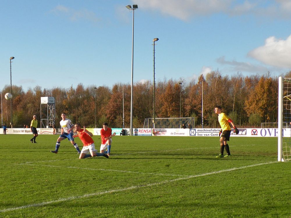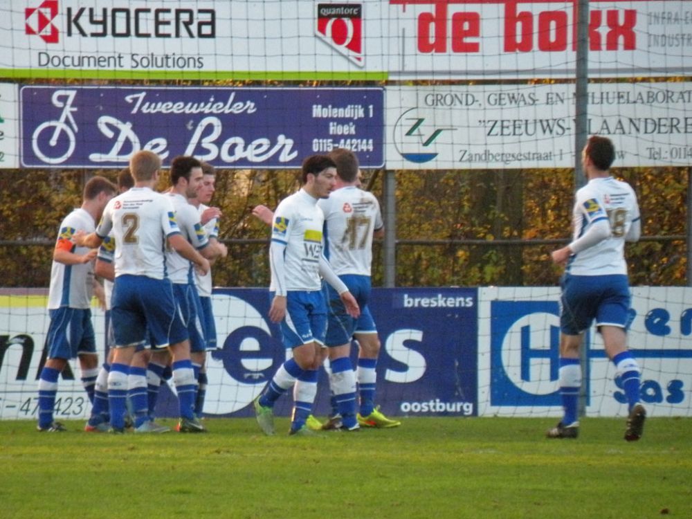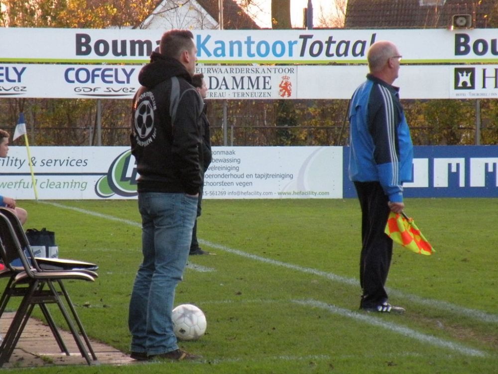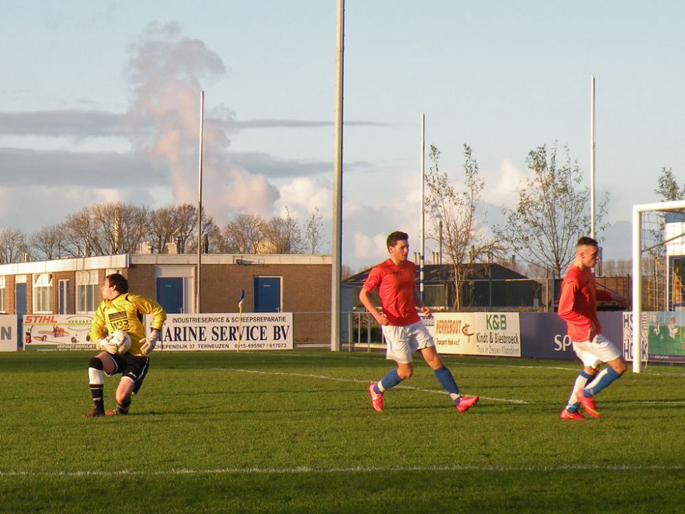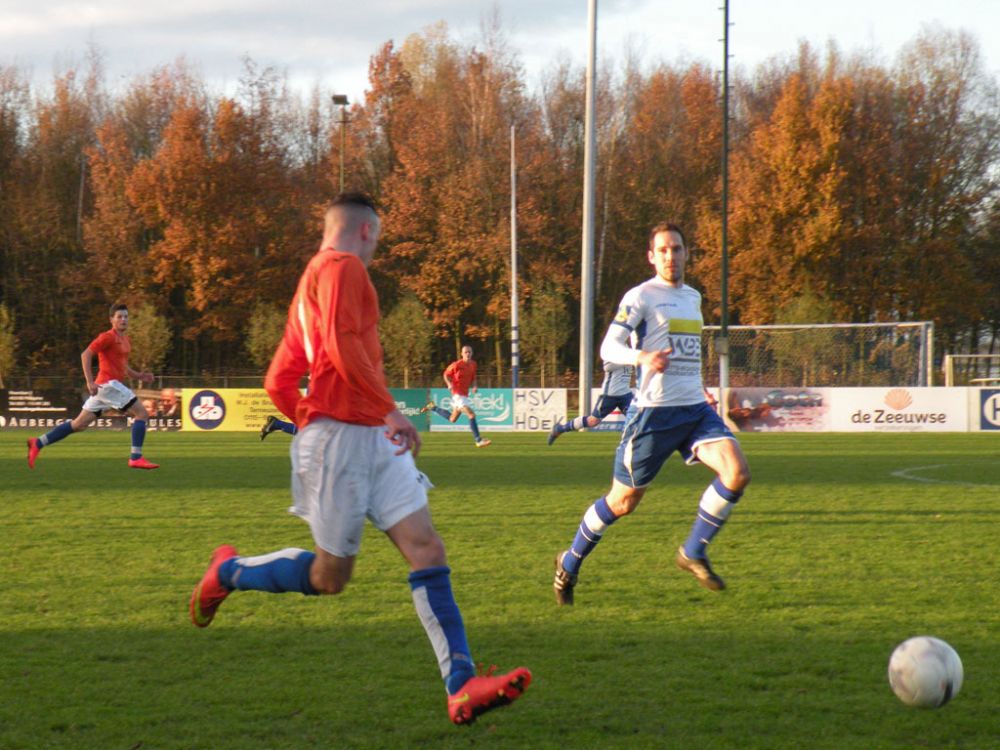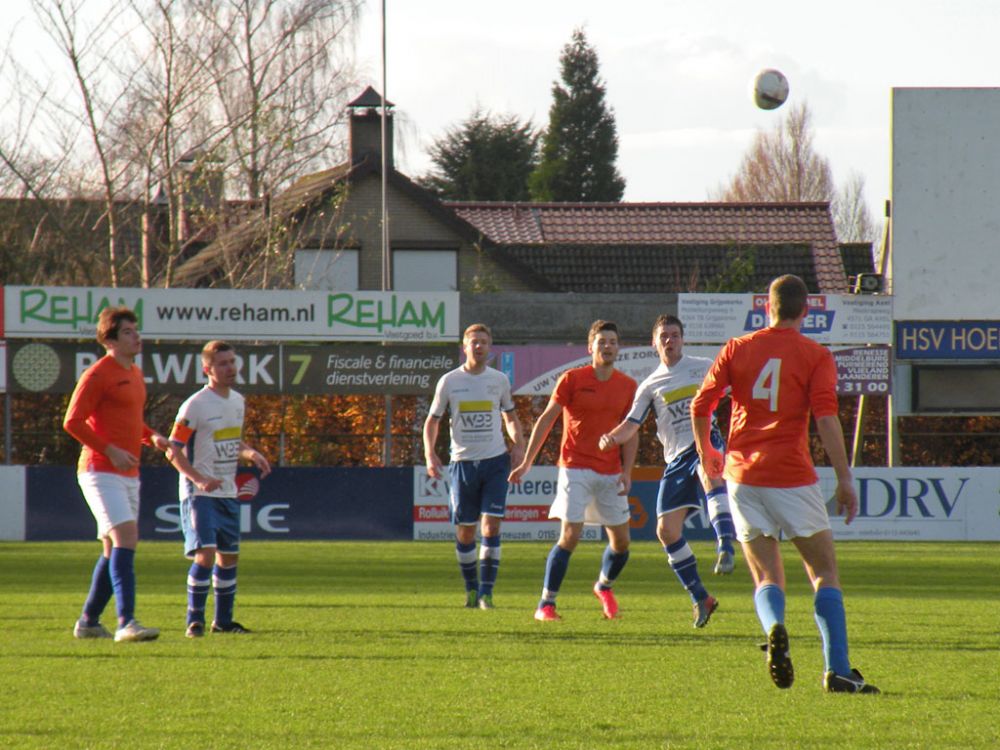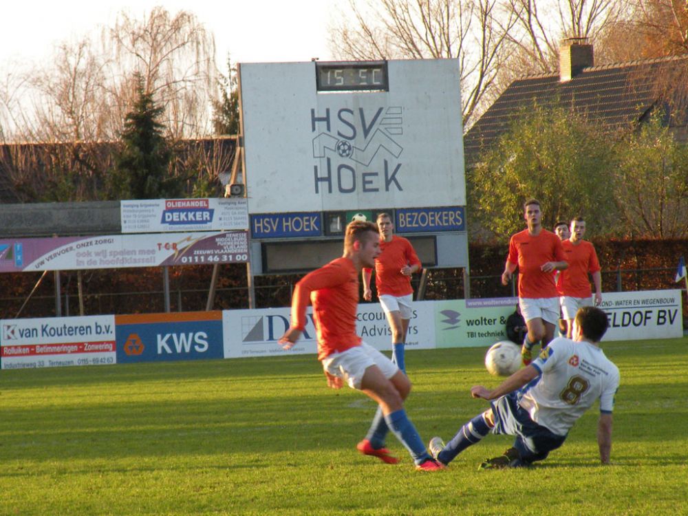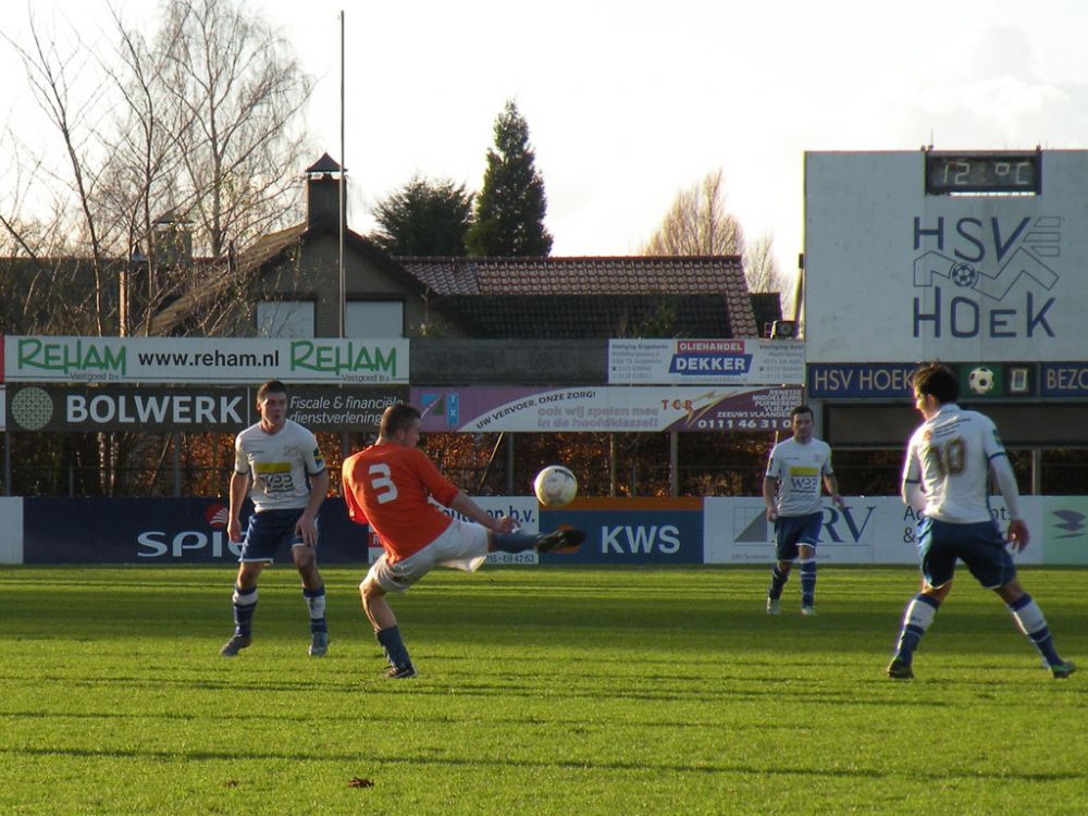 De donkere dagen voor kerst naderen en dat heeft meestal ook effect op de spelers, pijntjes worden in deze fase meestal nog net iets pijnlijker. Gelukkig kon Hoek 2 toch weer met een 14 koppige selectie toewerken naar het duel met het puntloze GPC Vlissingen 2. De ploeg die afgelopen seizoen uit de reserve Hoofdklas degradeerde zou volgens de bronnen helemaal niet zo'n slechte ploeg hebben. Dat zou in het verloop van de wedstrijd ook blijken want het bezorgde Hoek 2 een lastige middag. Hoek 2 begon wel fel aan de wedstrijd en leverde in de begin minuten gelijk wat corners op, ook de bezoekers speelden binnen 10 minuten al wat corners bij elkaar. De wedstrijd ging zijn gang maar plots was daar schrik als na een klein kwartiertje Pepijn van Gansbeke aangeeft niet meer verder te kunnen. De sympathieke blonde van Gansbeke heeft wederom last van de knie gekregen waar hij net van leek hersteld, en moet zwaar teleurgesteld het veld verlaten. Het lijkt of het zijn weerslag krijgt op Hoek 2 want waar de openingsfase fel was lukt daarna werkelijks niets meer. Hoek 2 moddert wat aan en het is zowaar GPC Vlissingen 2 dat na een minuut of 20 zelf de beste kans krijgt. Met nog een minuut of 10 op de klok ontworsteld Hoek 2 zich toch wat uit de malaise en zet de bezoekers onder druk. Uit een corner lijkt Brian van Hoorn aan de 2e paal de openingstreffer te kunnen binnen schieten maar zijn inzet gaat hoog over, een paar minuten later is van Hoorn weer gevaarlijk maar als zijn voorzet of schot rakelings overzeilt. Het lijkt vanaf de zijkant zelfs of de bal in het doel ploft gezien het opspringen van het publiek op de tribune maar de bal ging toch echt over. Ook Tijn Tielemans is dicht bij een treffer maar zijn lobje gaat wel over de keeper, maar ook naast het doel.Hoek 2 verdiend in deze fase een doelpunt en zal er ook komen. Het is Marco Doens die zich door de defensie heen worstelt en met een puntertje de bal binnen schiet, 1-0. In de laatste minuut nog een vrije trap op een gevaarlijke plaats recht voor het doel. Het is Arjen Schieman die via de muur de keeper dwingt tot een puike redding. De laatste tien minuten geven Hoek 2 houvast voor de 2e helft. Ook in de 2e helft gaat Hoek 2 op het zelfde elan als de laatste 10 minuten van de 1e helft. In de beginfase schiet tot 2x Ibrahim Eyruyk rakelings naast en staat bij Tijn Tielemans ook het vizier net niet scherp en ook zijn schot gaat rakelings naast. Na een klein kwartier een uitbraak van Hoek 2 met 3 tegen 1 is Hoek 2 in een overtal situatie. Maar hoe dit word uitgespeeld geeft aan dat Hoek 2 deze zaterdag niet in zijn beste vorm verkeerd. En dat is vragen om problemen die dan ook komen. Uit een corner van GPC Vlissingen 2 kan aan de 2e paal een speler simpel binnen koppen en staat het plots gewoon 1-1. Het publiek begint te morren want wat Hoek 2 nu voorschotelt is niet best. Toch proberen de mannen van trainer de Smet het tij te keren en dat ging zowaar nog lukken ook. Het is Arjen Schieman die over de linkerkant opkomt en een harde hoge voorzet geeft. De voorzet lijkt op niets uit te lopen maar daar is Brian van Hoorn die er wel brood in ziet en met een rake kopbal de bal snoeihard in het kruis kopt, 2-1. Hoek 2 moet nog een dik kwartier tegen houden om de 3 punten binnenboord te houden. Maar dan slaat wederom het angst om de Hoek 2 harten als Marco Doens kermend van de pijn op de grond ligt. In een onschuldig duel lijkt Doens zwaar geblesseerd aan de knie te zijn geraakt en is hij de 2e speler van de middag die van het veld moet worden gedragen. De blessuretijd tikt maar door en kijkt iedereen naar scheidsrechter Bruinooghe die een prima partij floot hoe lang het nog duurt. Hoek 2 is er immers niet gerust op, maar daar lijkt dan de bevrijdende 3-1 te komen als de voor Marco Doens Joel Mieras vrij voor doel word gezet. Waar het makkelijker lijkt om de bal binnen te krijgen tikt tot ontzetting van hemzelf Mieras de bal op de paal. Niet veel later volgt dan het bevrijdende eindsignaal en kan Hoek 2 opgelucht ademhalen en gewoon 3 punten bijschrijven. Hoek 2 beleefde vorig seizoen ook zo'n fase en verloor toen 2 punten aan het destijds laag geklasseerde LRC 3 waar het nu dus gewoon de punten heeft. Volgende week wacht Kapelle 2 dan aan een sterke reeks bezig is dus zal Hoek 2 waakzaam en scherp moeten zijn om hier geen averij op te lopen.