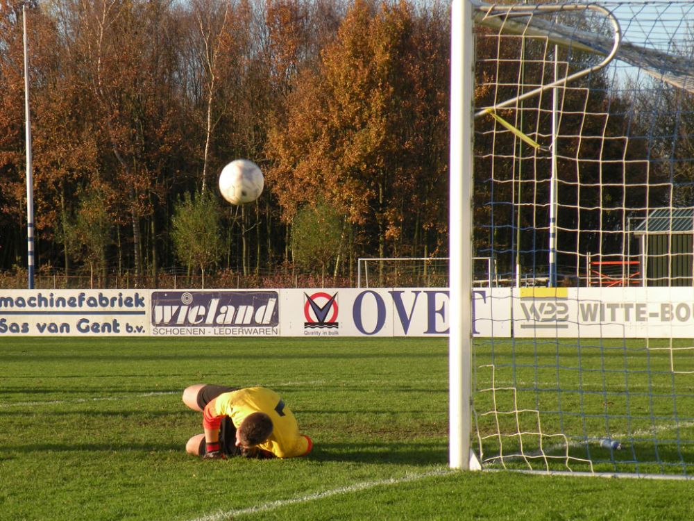 Komt de keeper van GPC nu wel of niet. De verdediger van GPC durft het niet te riskeren en trapt de bal in het wilde weg weg.