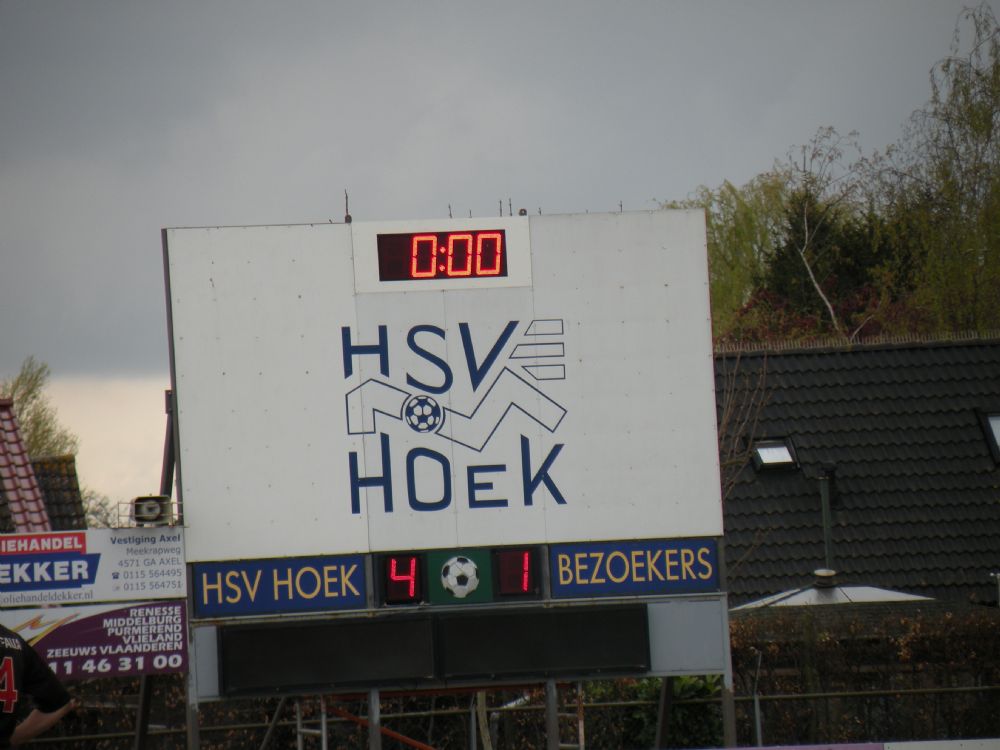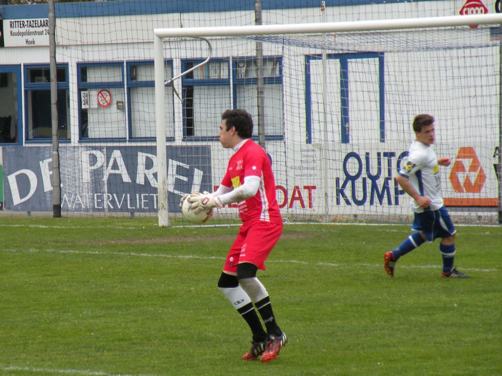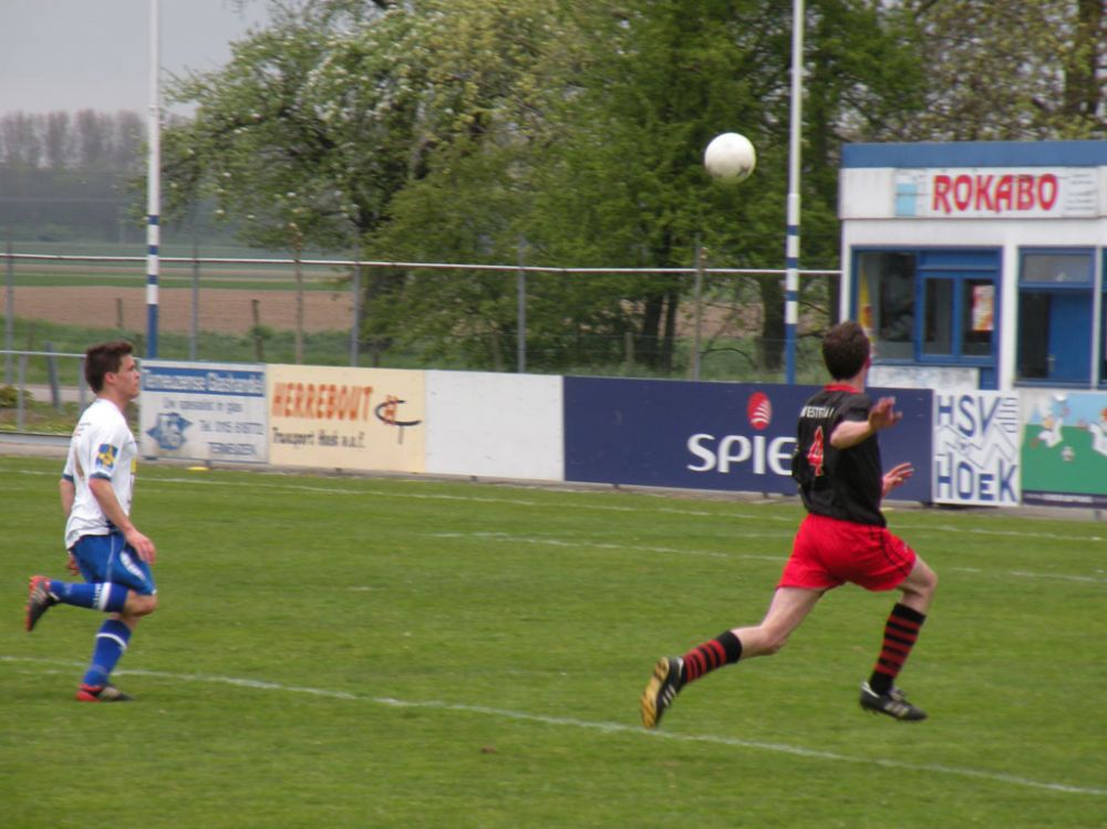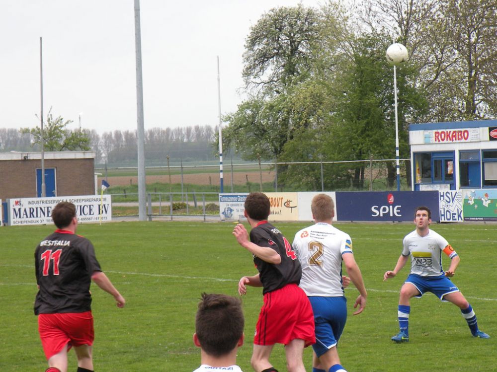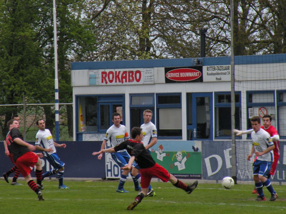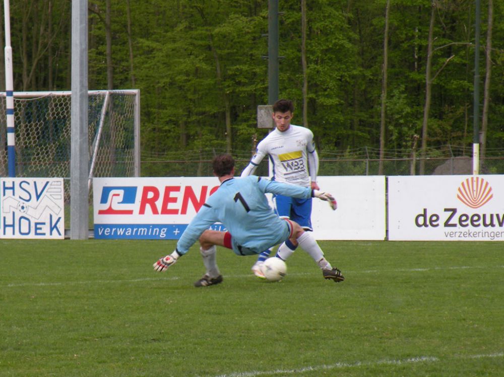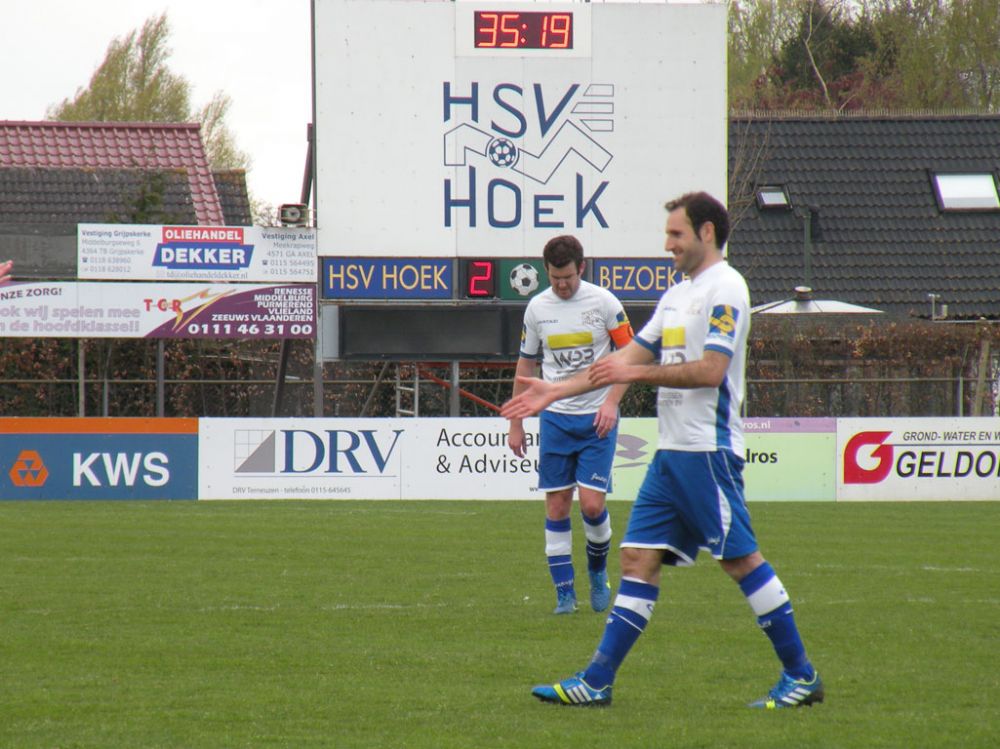 Hoek 2 en Papendrecht 2 maakten er in de openingswedstrijd van het seizoen destijds een onvergetelijk treffen van. Een uitslag van 4-4 waar het met rust minstens 0-5 had moeten staan, maar waar Hoek 2 ook met lege handen had kunnen staan als men in de slotfase niet een 4-2 achterstand had omgebogen. Kortom een heerlijk spektakelstuk wat 2 bevriende trainers zou opleveren. Je zou dus zaterdag handjeklap verwachten want waar voor Hoek 2 uit kampioenschap uit zicht lijkt stond er voor de bezoekers nog een ticket voor de nacompetitie op het spel. In de 1e minuut leek het toch verdacht veel op een weggegeven wedstrijd als Tiago Barros en Marco Hamelink allebei vrij voor doel staan. Wie haalt de trekker over wie schiet de bal binnen.....niemand en zo komen de bezoekers wel erg goed weg. Niet veel later weer een kans voor de Portugees in Hoekse dienst maar ook nu houd de doelman zijn doel schoon. De bezoekers zijn van de schrik bekomen en komen ook gevaarlijk voor het Hoek 2 doel wat na een kleine 10 minuten een treffer op levert als Rhoudy Diamant een voorzet binnenkopt, 0-1. Nog geen minuut later ontkomt Hoek 2 aan een volgende treffer als de lat redding brengt. Het Hoek 2 doel lijkt wel een schiettent, 5x schieten voor een euro. Gelukkig is doelman Kevin Wissel wel wakker en doet waar hij voor staat de ballen tegenhouden. De scheidsrechter wil dan Hoek 2 een handje helpen als voor een lichte overtreding voor strafschop word gefloten. De ijverige Thomas Vanderhaegen zet zich achter de bal maar zijn vizier staat dan nog niet scherp en schiet de strafschop naast. Toch geeft het Hoek 2 wat frisse moed en word het weer wat gevaarlijker. Zo lijkt Ibrahim Eryruk op weg naar de gelijkmaker als hij vanaf de middenlijn alleen op doel af mag gaan. Maar de vlag gaat naar boven voor buitenspel wat hoogst twijfelachtig was, weg kans. Het houd de moed erin bij Papendrecht 2 en mogen zich beklagen als de paal vlak voor rust een 2e treffer in de weg staat. Ruim in blessuretijd nog een aanval van Hoek 2 met een voorzet van Thomas Vanderhaegen die over alles en iedereen heen gaat maar via de binnenkant van de paal wel binnen caramboleert, 1-1. Dat is toch wel een gevoelig tikkie voor de bezoekers en neem daar de messcherpe 2e helft van Hoek 2 bij dan heb je een mooi eind resultaat. Hoek 2 begint de 2e helft met 6 corners op rij en volle druk op het Papendrecht 2 doel. Na een minuut of 8 in de 2e helft komt dan de beloning met een 2e treffer. Een voorzet van Mathieu Voet kan door de goed storende Bart Corstanje niet worden gepakt door de doelman en zo kan de alerte Sander de Haas de bal binnen schieten, 2-1. Een paar minuten later is het weer raak, nu is het Tiago Barros die met een geplaatst schot de doelman verschalkt, 3-1. Hoek 2 is los, voetbalt lekker en laat af en toe aardige dingen zien. Zo verdient de puntgave voorzet van Thomas Vanderhaegen een doelpunt maar Brian van Hoorn kan de bal net niet genoeg snelheid meegeven om ook zijn doelpuntje mee te pikken en ziet de doelman redding brengen. Het eindsignaal nadert en lijkt Hoek 2 het wel goed te vinden. Het levert Papendrecht 2 zowaar nog een kansje op in de 2e helft, gelukkig is doelman Wissel attent en tikt de bal corner. Dat lijkt het deze middag wel allemaal te zijn maar de scheidsrechter van dienst geniet blijkbaar van deze middag en laat nog vrolijk door spelen als de klok al ruim op 90 minuten staat. Hoek 2 zal er niet om malen want het levert zowaar nog een treffer op. Thomas Vanderhaegen en Bart Corstanje verschijnen beiden vrij voor het doel maar zoals een echte spits beaamd gaat Vanderhaegen voor eigen succes als hij de doelman heeft omspeelt. De bal kan dan worden breed gespeeld maar Vanderhaegen schiet zelf binnen, 4-1. Een dik verdiende treffer voor de sympathieke Belg die in het Hoek 2 shirt niet verzaakt. Hoek 2 wint op basis van de 2e helft verdiend met 4-1 en heeft met nog 2 wedstrijden voor de boeg de kans om het puntentotaal van vorig seizoen te overtreffen. Dan zal wel de horde GPC Vlissingen 2 met succes moeten worden genomen. De nummer laatst lijkt eindelijk zijn adem de hebben gevonden want met 4 punten uit de laatste 2 duels vechten de Vlissingers tot de laatste snik dus is het voor Hoek 2 nog geen uit gemaakte zaak.