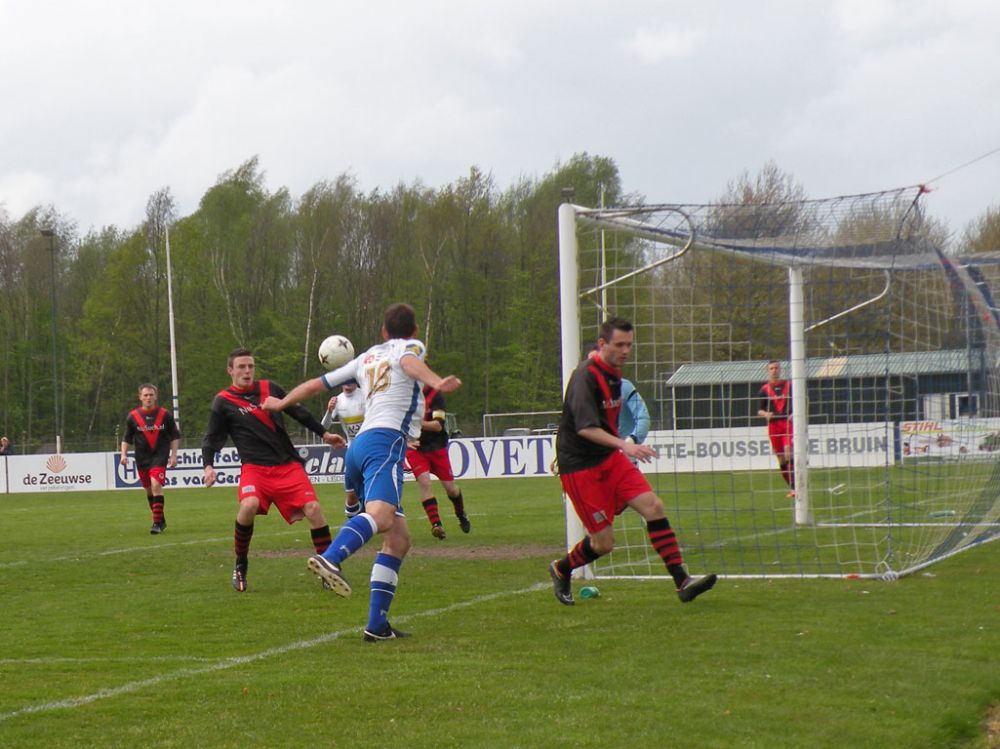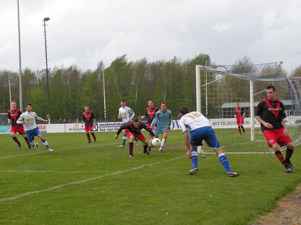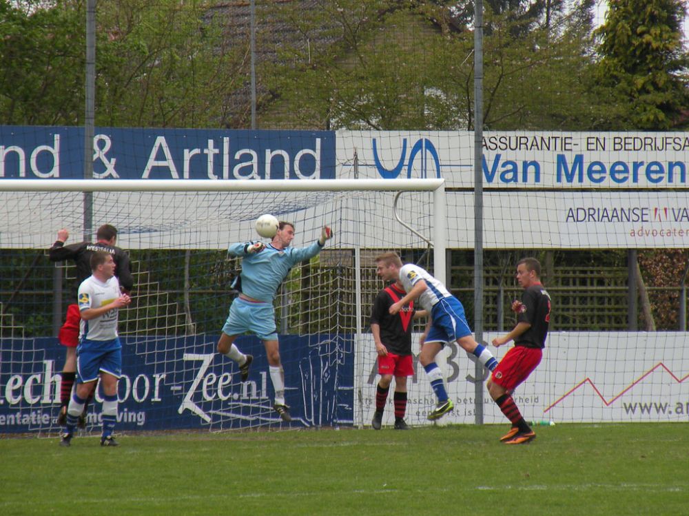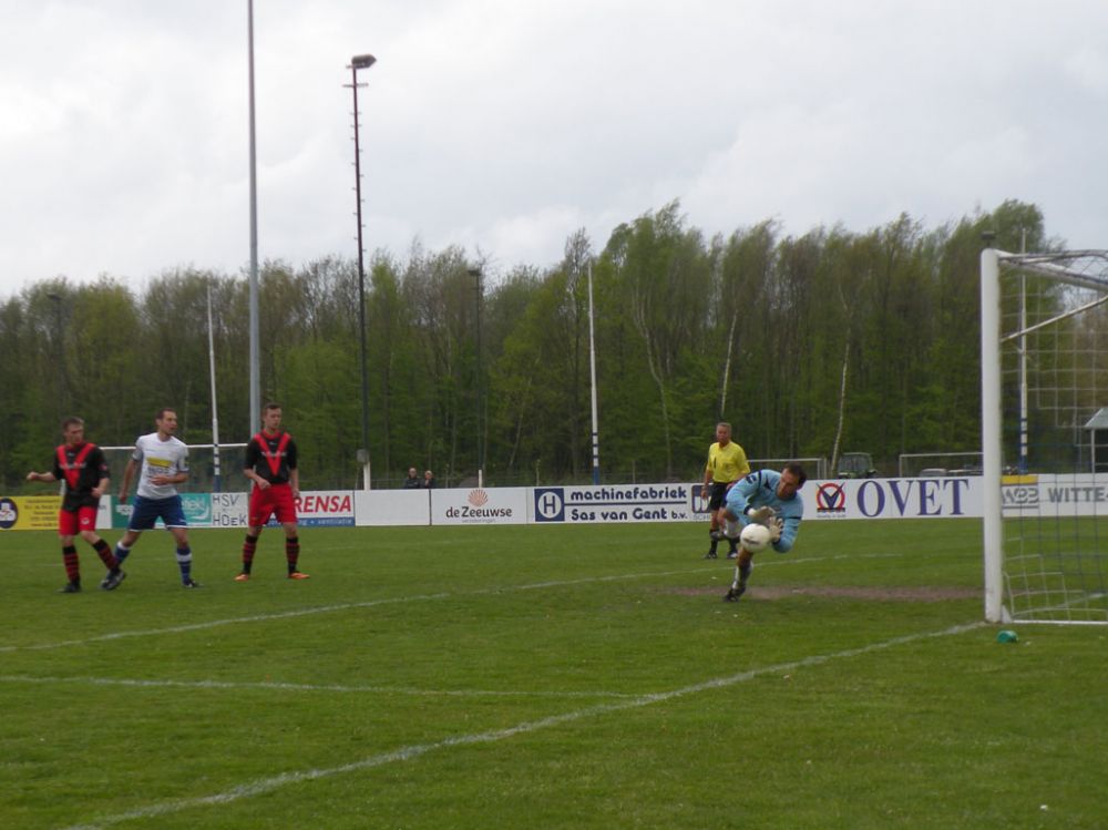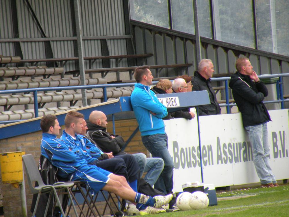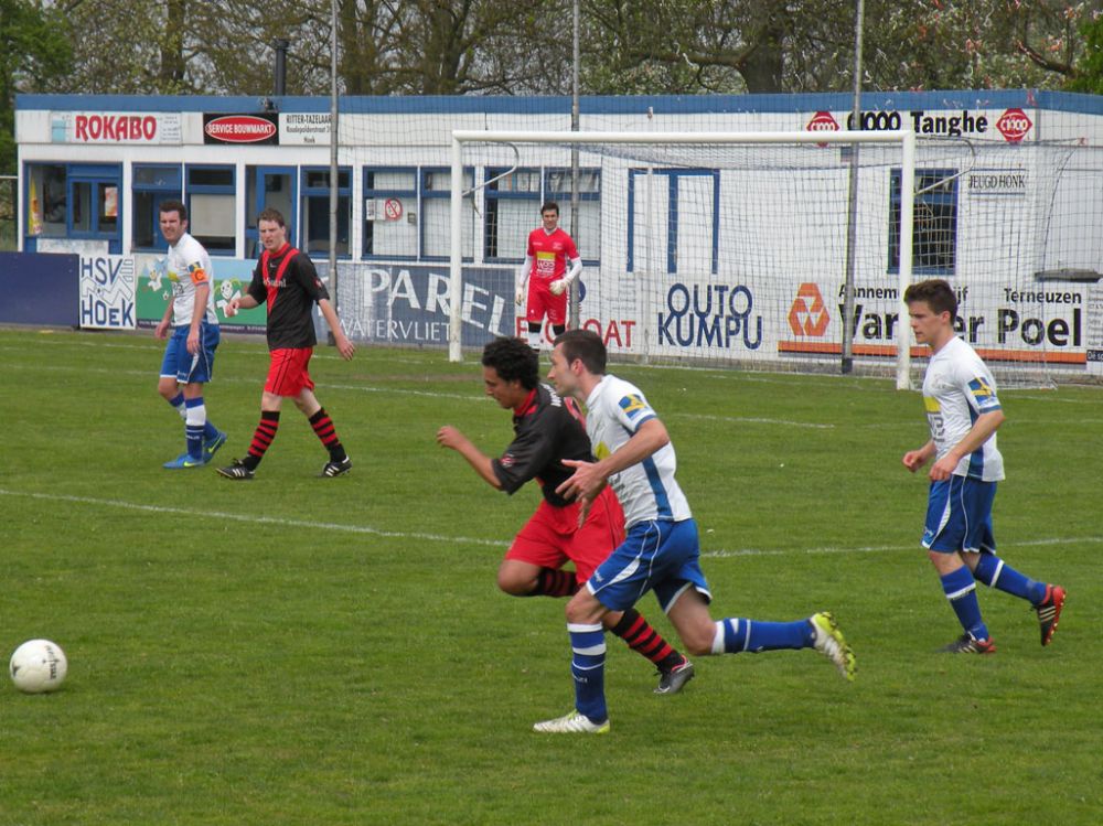 Hoek 2 en Papendrecht 2 maakten er in de openingswedstrijd van het seizoen destijds een onvergetelijk treffen van. Een uitslag van 4-4 waar het met rust minstens 0-5 had moeten staan, maar waar Hoek 2 ook met lege handen had kunnen staan als men in de slotfase niet een 4-2 achterstand had omgebogen. Kortom een heerlijk spektakelstuk wat 2 bevriende trainers zou opleveren. Je zou dus zaterdag handjeklap verwachten want waar voor Hoek 2 uit kampioenschap uit zicht lijkt stond er voor de bezoekers nog een ticket voor de nacompetitie op het spel. In de 1e minuut leek het toch verdacht veel op een weggegeven wedstrijd als Tiago Barros en Marco Hamelink allebei vrij voor doel staan. Wie haalt de trekker over wie schiet de bal binnen.....niemand en zo komen de bezoekers wel erg goed weg. Niet veel later weer een kans voor de Portugees in Hoekse dienst maar ook nu houd de doelman zijn doel schoon. De bezoekers zijn van de schrik bekomen en komen ook gevaarlijk voor het Hoek 2 doel wat na een kleine 10 minuten een treffer op levert als Rhoudy Diamant een voorzet binnenkopt, 0-1. Nog geen minuut later ontkomt Hoek 2 aan een volgende treffer als de lat redding brengt. Het Hoek 2 doel lijkt wel een schiettent, 5x schieten voor een euro. Gelukkig is doelman Kevin Wissel wel wakker en doet waar hij voor staat de ballen tegenhouden. De scheidsrechter wil dan Hoek 2 een handje helpen als voor een lichte overtreding voor strafschop word gefloten. De ijverige Thomas Vanderhaegen zet zich achter de bal maar zijn vizier staat dan nog niet scherp en schiet de strafschop naast. Toch geeft het Hoek 2 wat frisse moed en word het weer wat gevaarlijker. Zo lijkt Ibrahim Eryruk op weg naar de gelijkmaker als hij vanaf de middenlijn alleen op doel af mag gaan. Maar de vlag gaat naar boven voor buitenspel wat hoogst twijfelachtig was, weg kans. Het houd de moed erin bij Papendrecht 2 en mogen zich beklagen als de paal vlak voor rust een 2e treffer in de weg staat. Ruim in blessuretijd nog een aanval van Hoek 2 met een voorzet van Thomas Vanderhaegen die over alles en iedereen heen gaat maar via de binnenkant van de paal wel binnen caramboleert, 1-1. Dat is toch wel een gevoelig tikkie voor de bezoekers en neem daar de messcherpe 2e helft van Hoek 2 bij dan heb je een mooi eind resultaat. Hoek 2 begint de 2e helft met 6 corners op rij en volle druk op het Papendrecht 2 doel. Na een minuut of 8 in de 2e helft komt dan de beloning met een 2e treffer. Een voorzet van Mathieu Voet kan door de goed storende Bart Corstanje niet worden gepakt door de doelman en zo kan de alerte Sander de Haas de bal binnen schieten, 2-1. Een paar minuten later is het weer raak, nu is het Tiago Barros die met een geplaatst schot de doelman verschalkt, 3-1. Hoek 2 is los, voetbalt lekker en laat af en toe aardige dingen zien. Zo verdient de puntgave voorzet van Thomas Vanderhaegen een doelpunt maar Brian van Hoorn kan de bal net niet genoeg snelheid meegeven om ook zijn doelpuntje mee te pikken en ziet de doelman redding brengen. Het eindsignaal nadert en lijkt Hoek 2 het wel goed te vinden. Het levert Papendrecht 2 zowaar nog een kansje op in de 2e helft, gelukkig is doelman Wissel attent en tikt de bal corner. Dat lijkt het deze middag wel allemaal te zijn maar de scheidsrechter van dienst geniet blijkbaar van deze middag en laat nog vrolijk door spelen als de klok al ruim op 90 minuten staat. Hoek 2 zal er niet om malen want het levert zowaar nog een treffer op. Thomas Vanderhaegen en Bart Corstanje verschijnen beiden vrij voor het doel maar zoals een echte spits beaamd gaat Vanderhaegen voor eigen succes als hij de doelman heeft omspeelt. De bal kan dan worden breed gespeeld maar Vanderhaegen schiet zelf binnen, 4-1. Een dik verdiende treffer voor de sympathieke Belg die in het Hoek 2 shirt niet verzaakt. Hoek 2 wint op basis van de 2e helft verdiend met 4-1 en heeft met nog 2 wedstrijden voor de boeg de kans om het puntentotaal van vorig seizoen te overtreffen. Dan zal wel de horde GPC Vlissingen 2 met succes moeten worden genomen. De nummer laatst lijkt eindelijk zijn adem de hebben gevonden want met 4 punten uit de laatste 2 duels vechten de Vlissingers tot de laatste snik dus is het voor Hoek 2 nog geen uit gemaakte zaak.