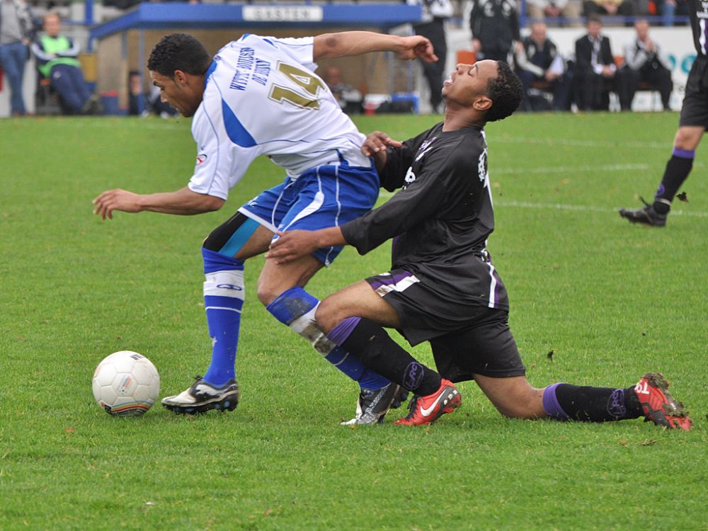Regilio Pinas ontkomt aan een duel met Rupertho Dorethea van LRC Leerdam.