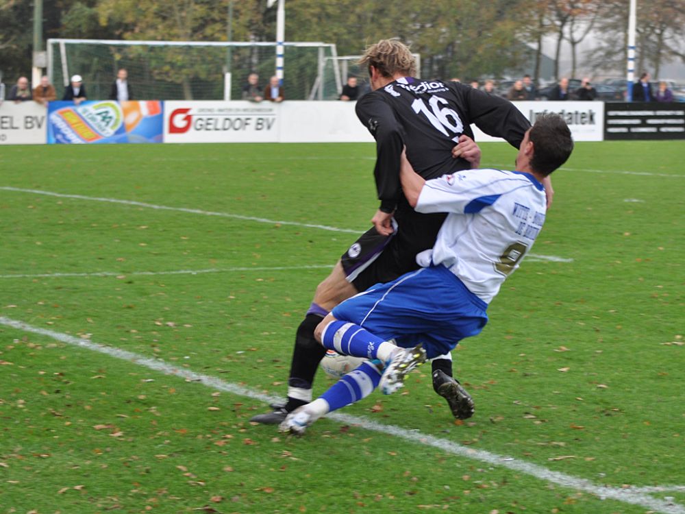 Marvin van Westerduin kijkt op een afstand naar het duel van Raymond Wolff met in zijn rug Danny van Steijn.