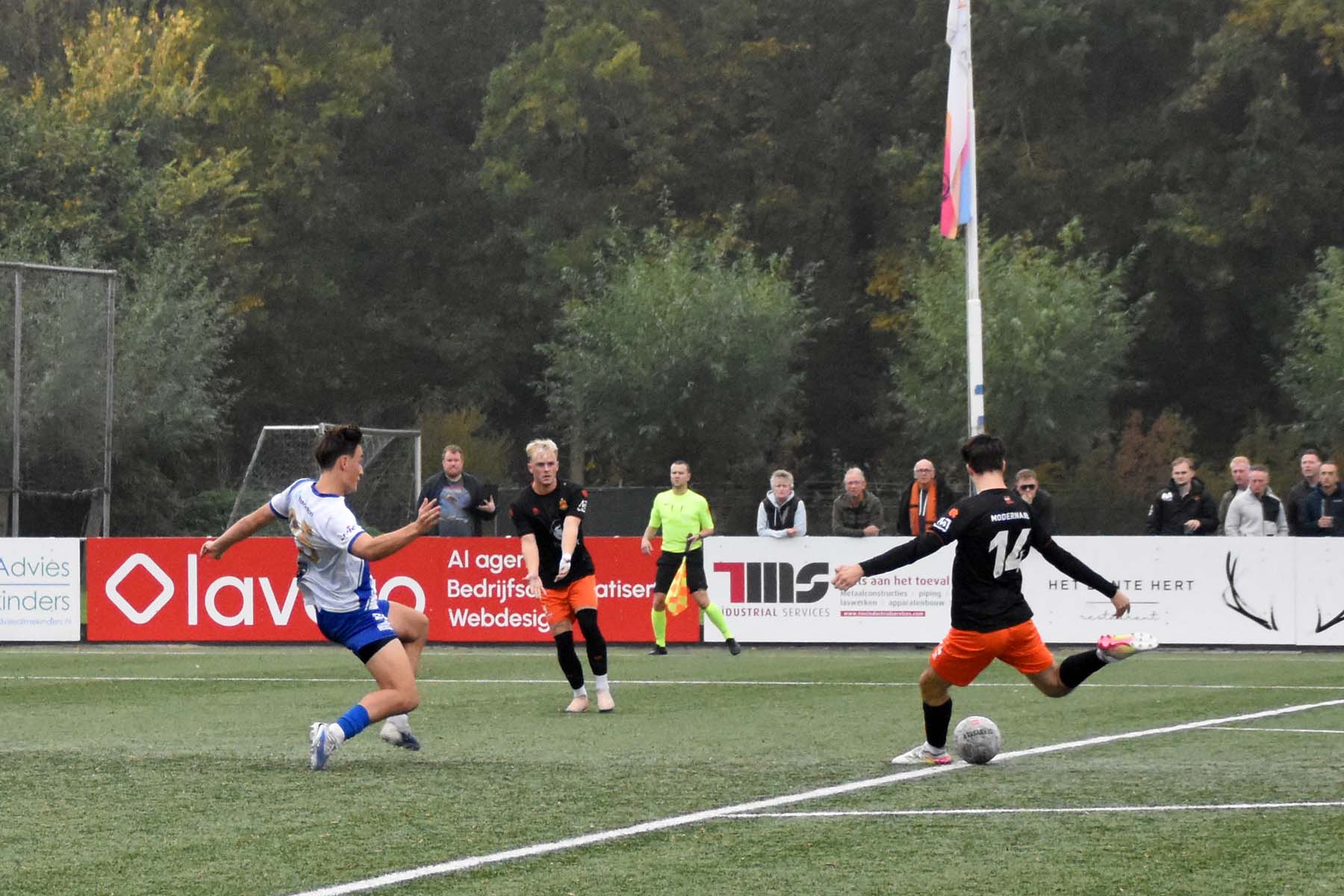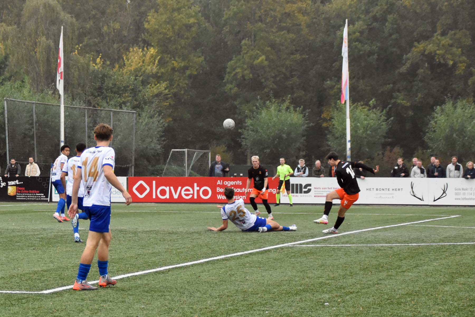 de spits van HHC Hardenberg krijgt zijn voet nog onder de bal voordat hij over de achterlijn gaat. Is het nu een voorzet op schot op doel?..