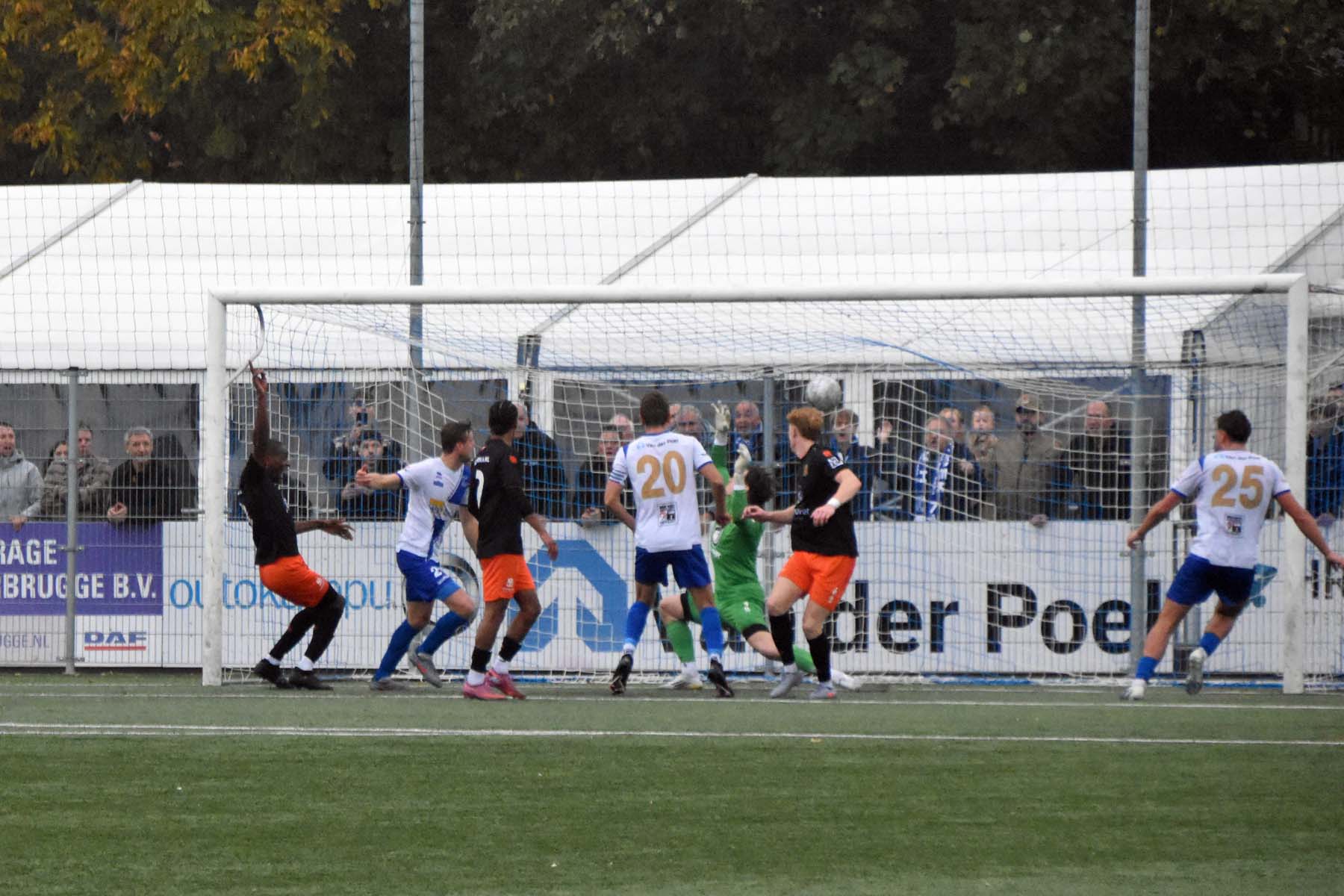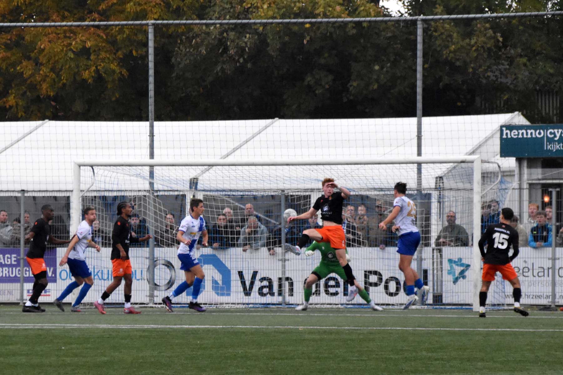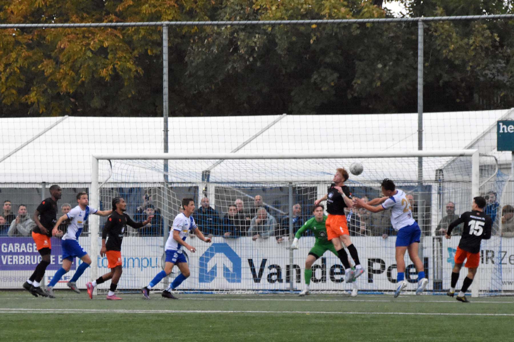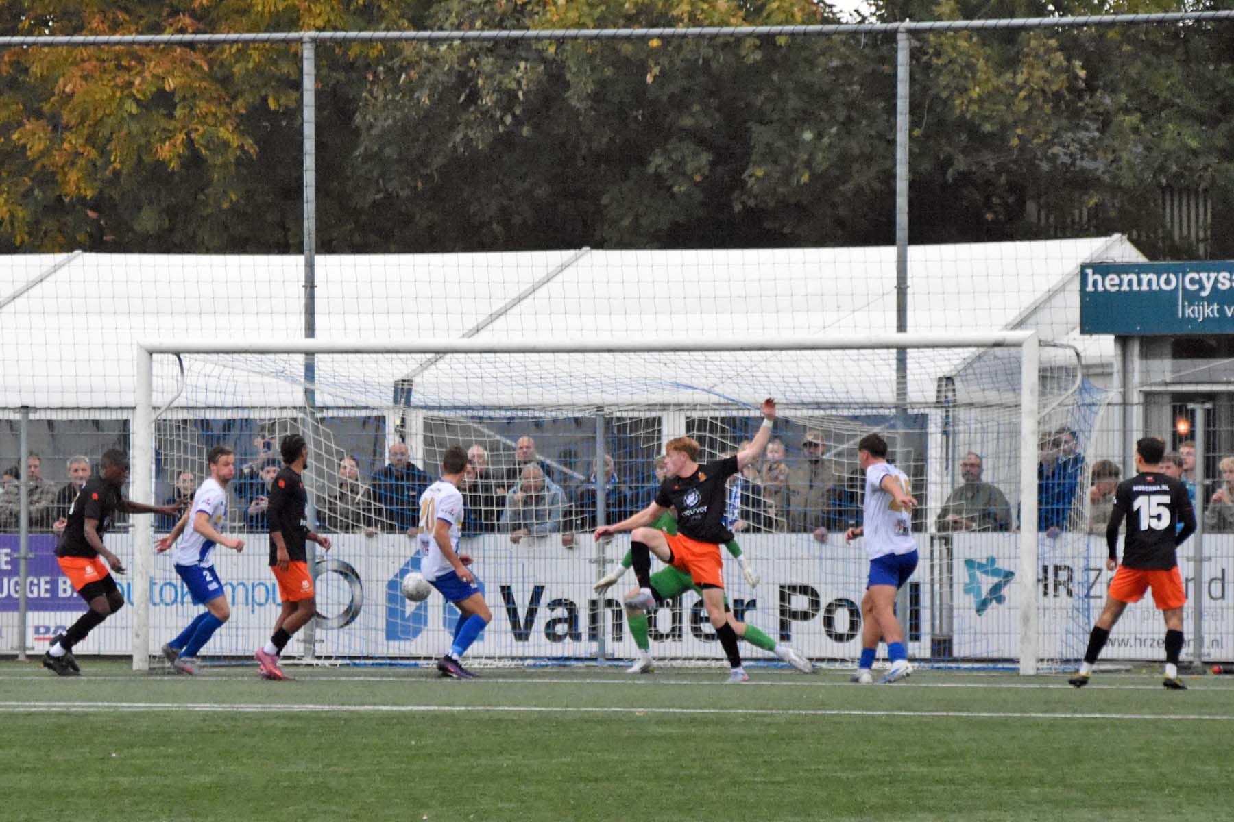 Robbie van Hauter. GertJan Martens zoekt zijn plek weer op voor het doel. Robbie van Hauter geeft voor..