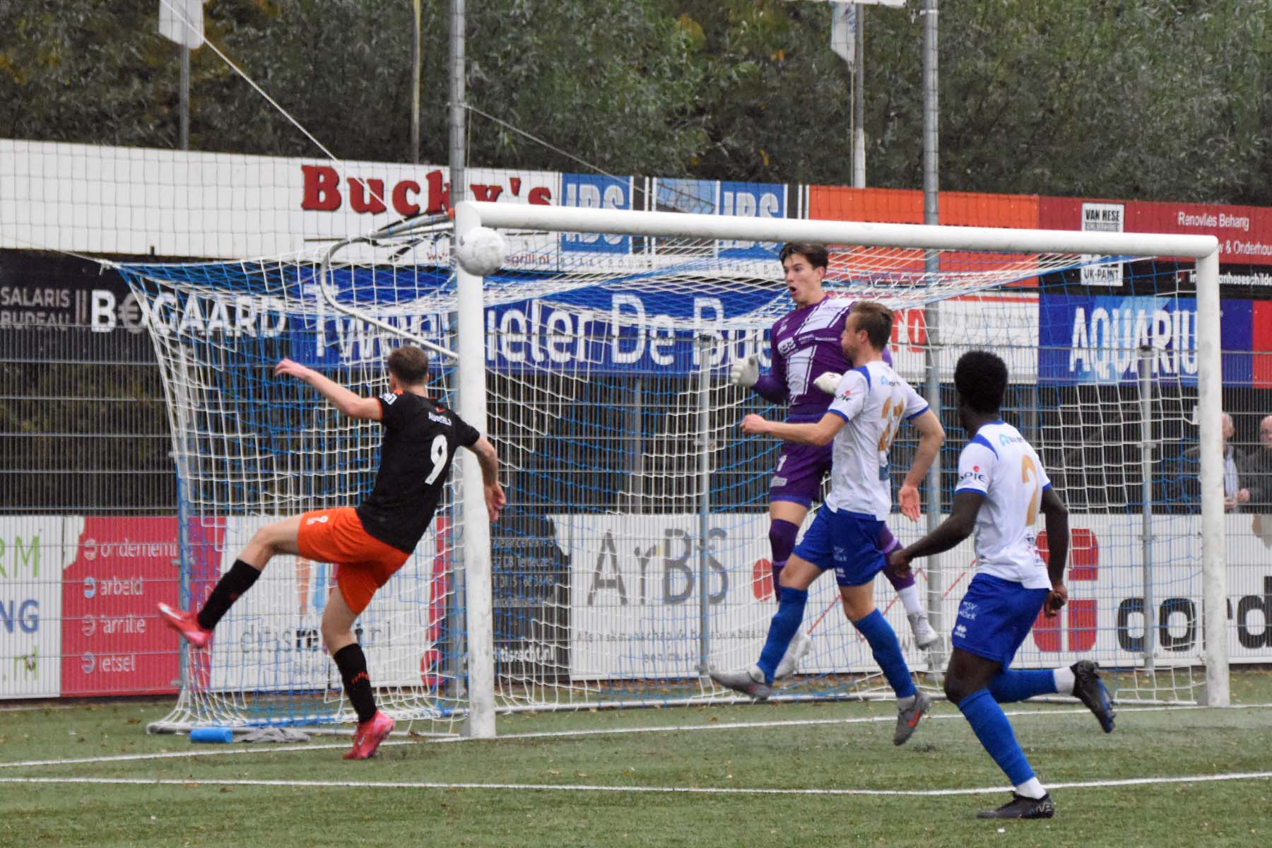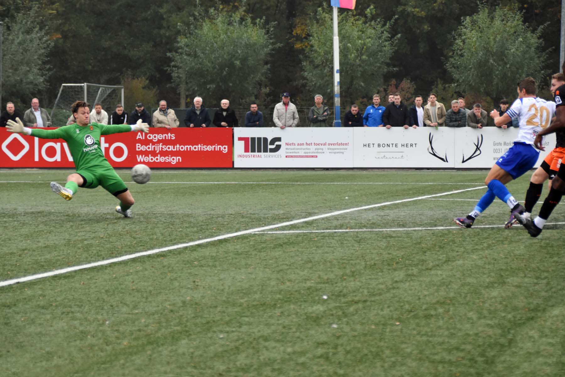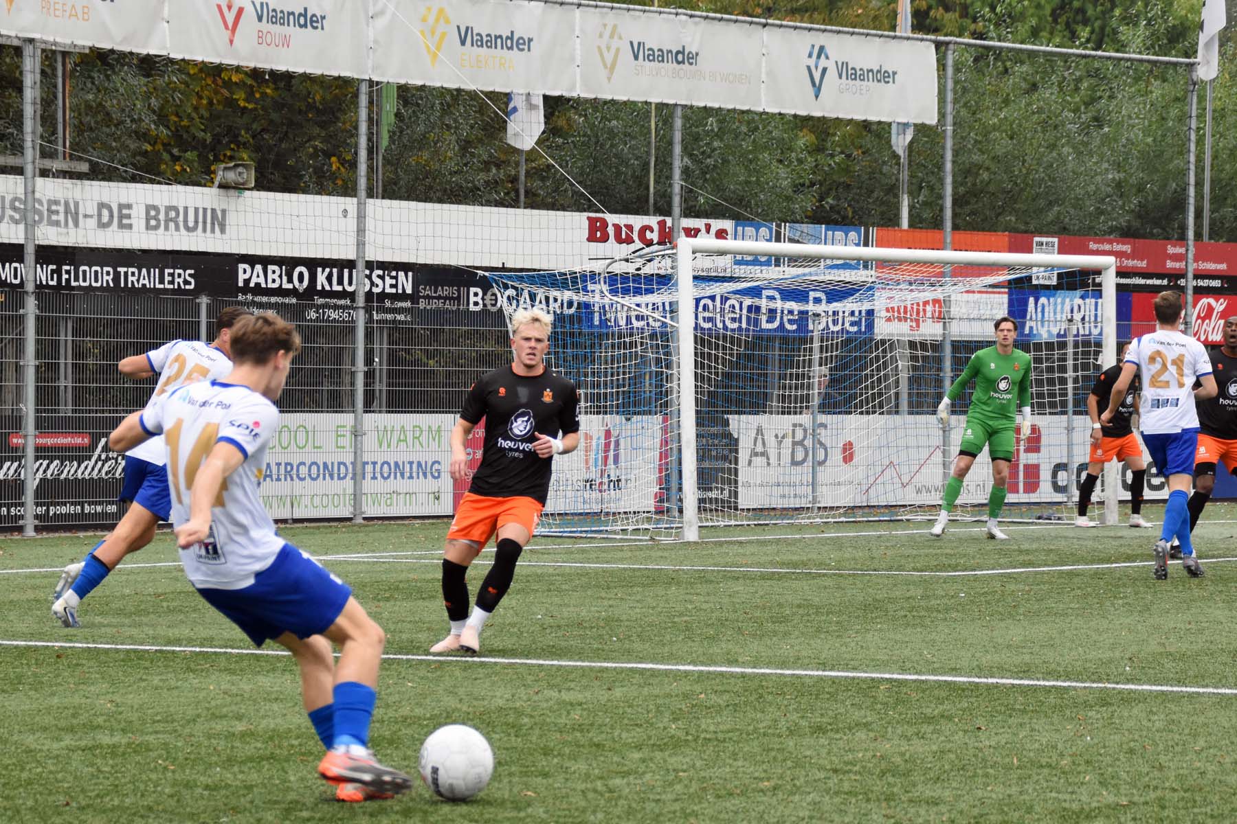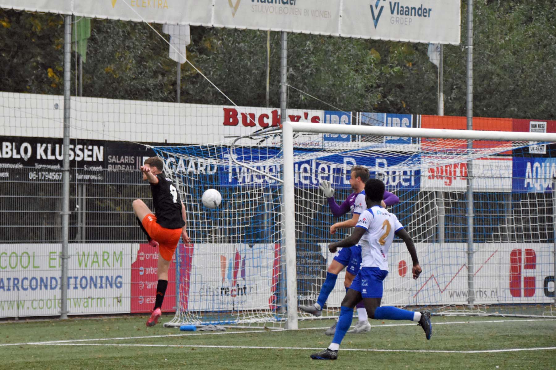 Robbie van Hauter. GertJan Martens zoekt zijn plek weer op voor het doel. Robbie van Hauter geeft voor..