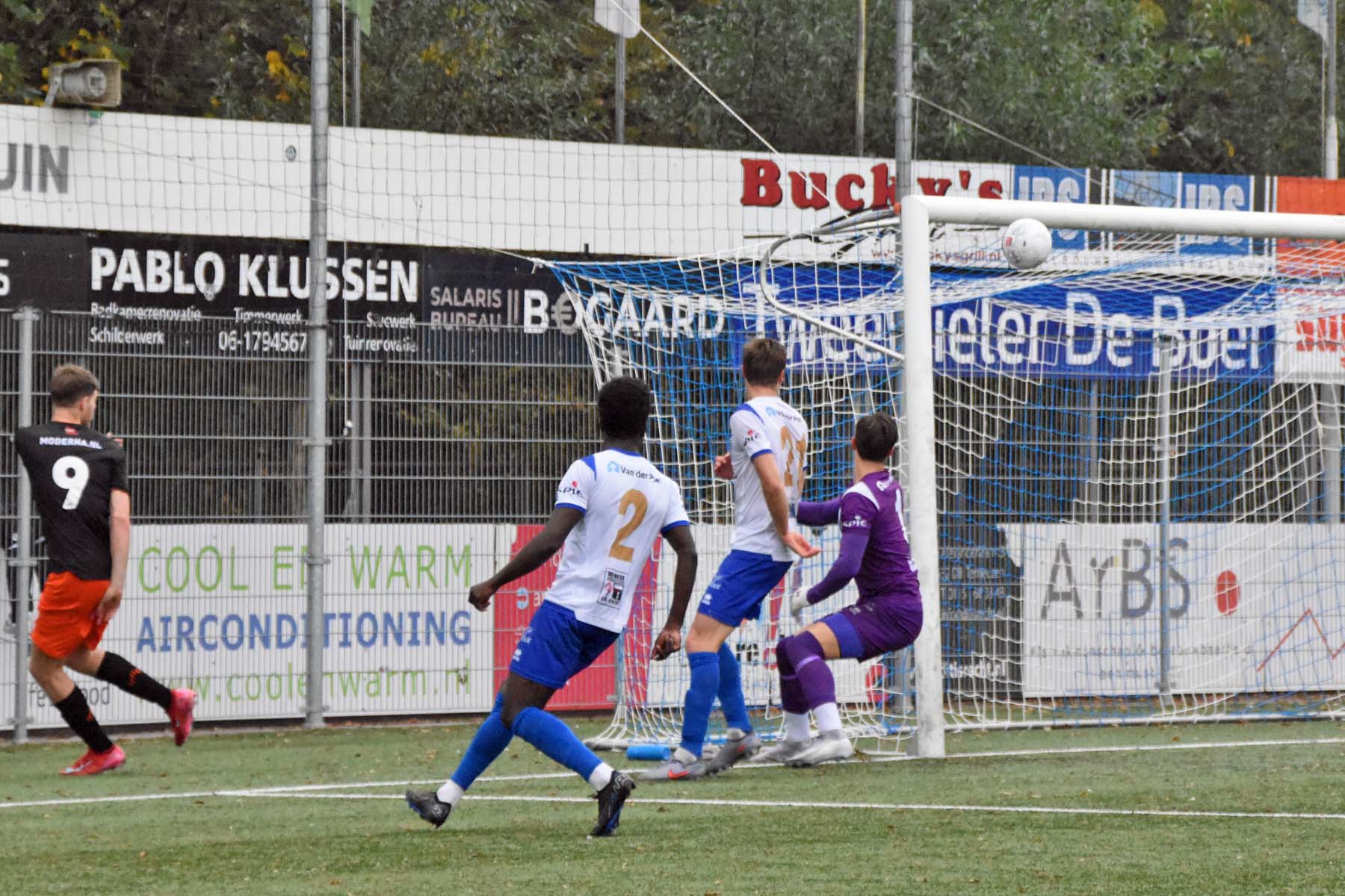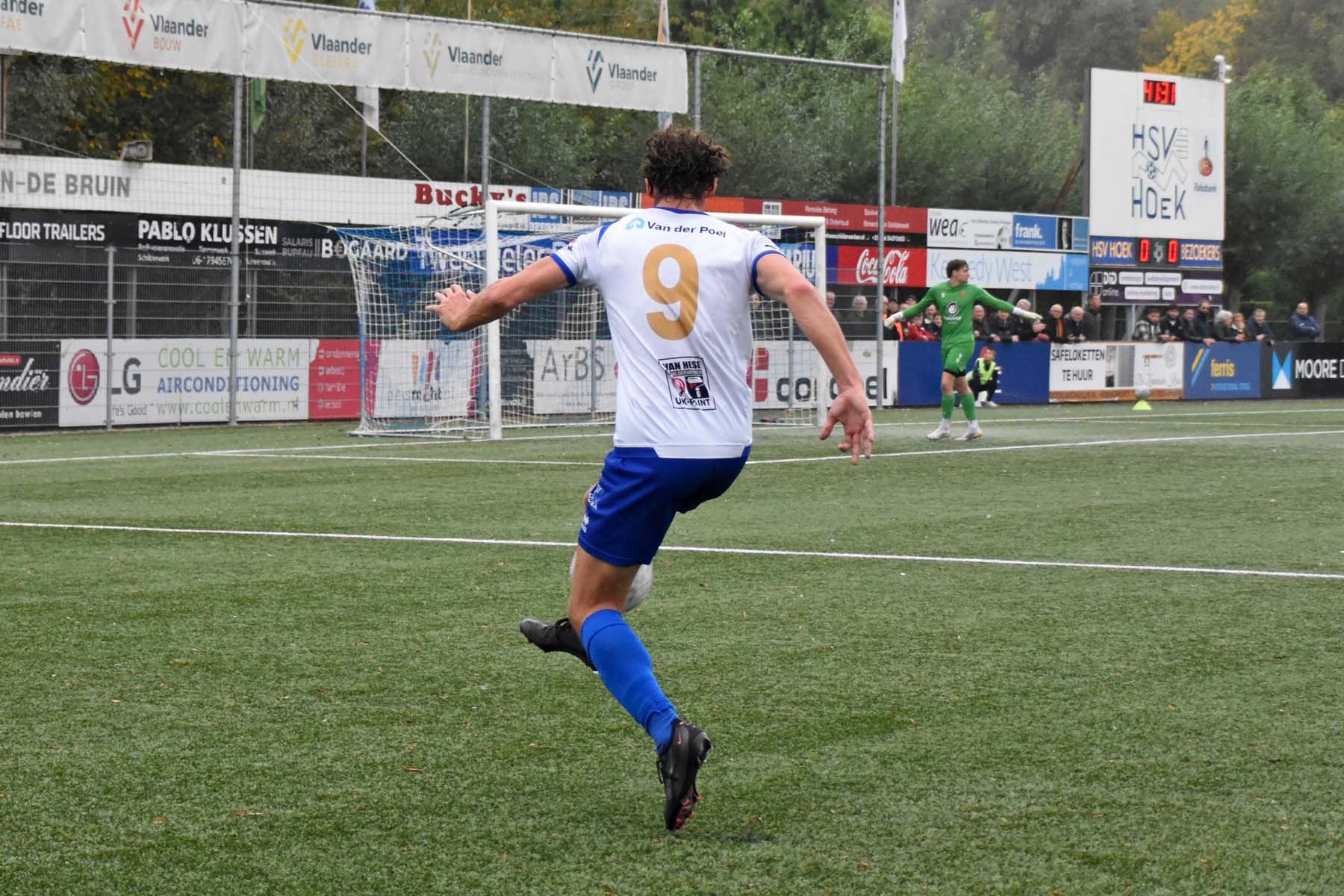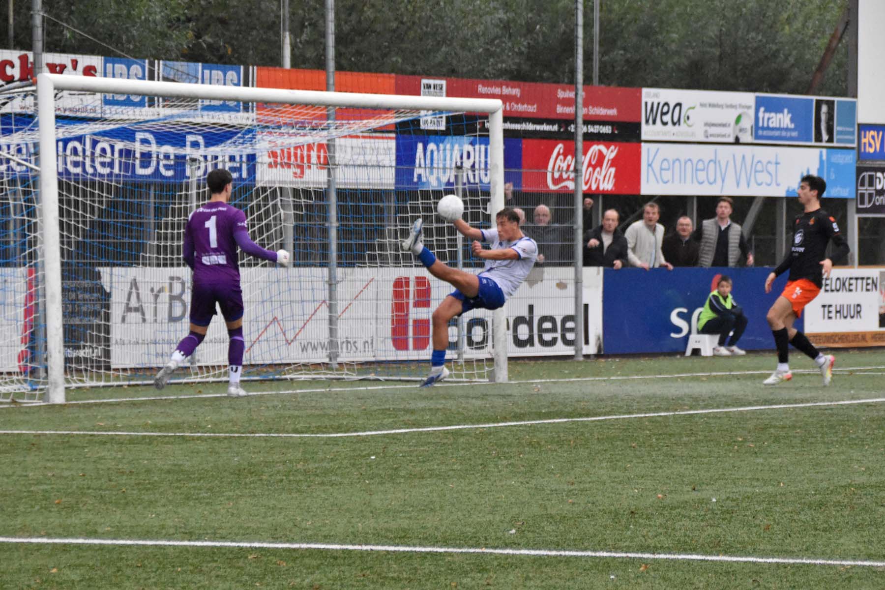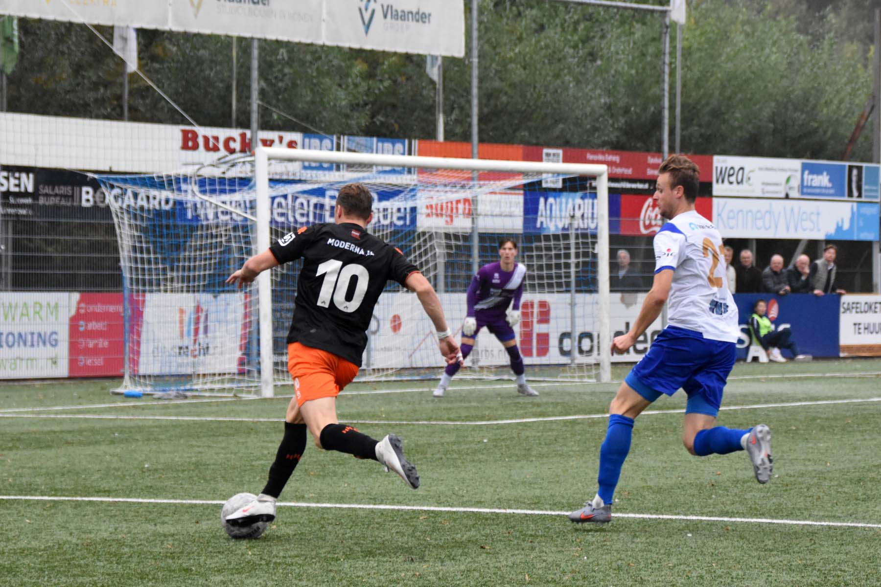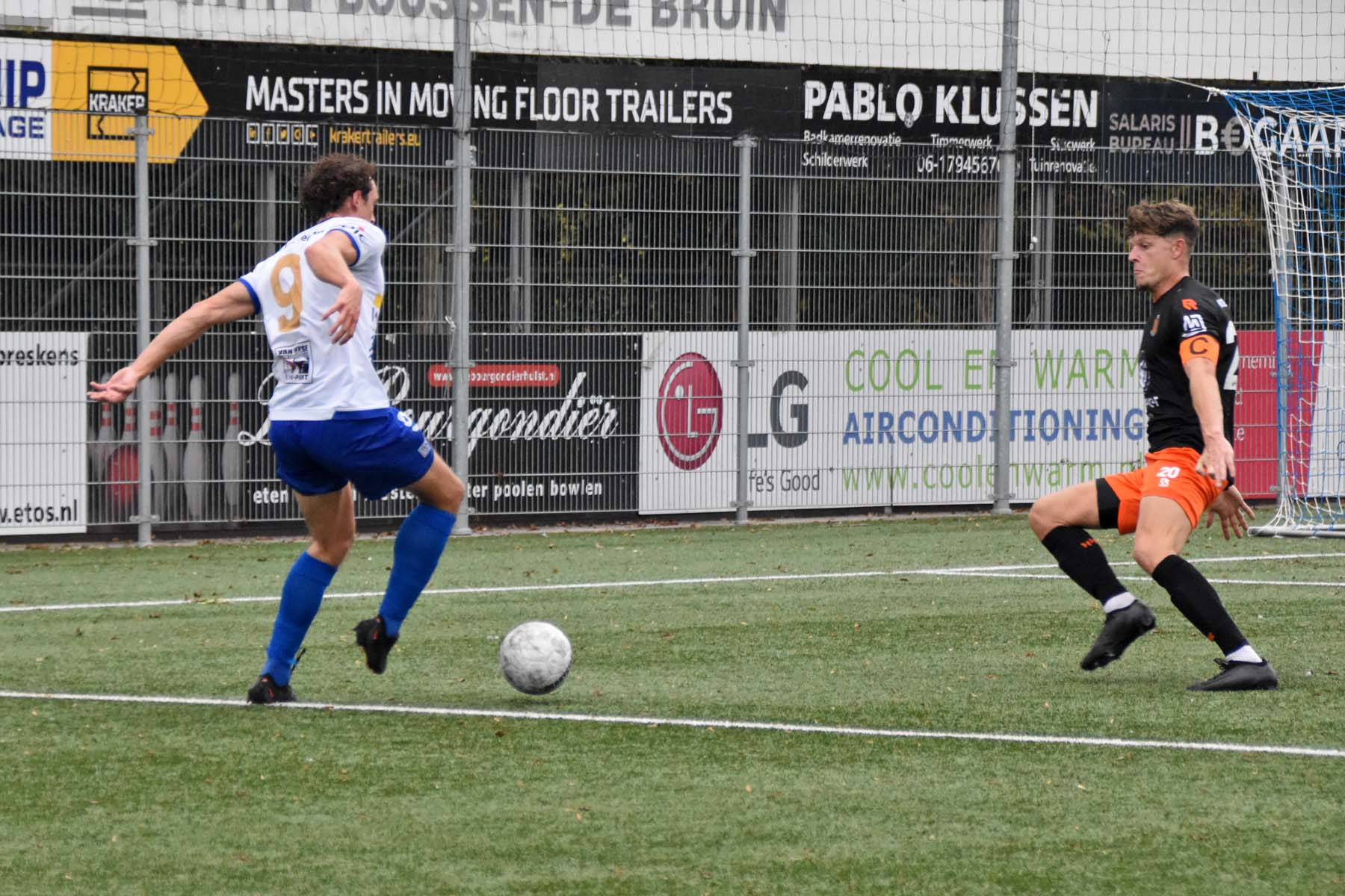 Robbie van Hauter. GertJan Martens zoekt zijn plek weer op voor het doel. Robbie van Hauter geeft voor..