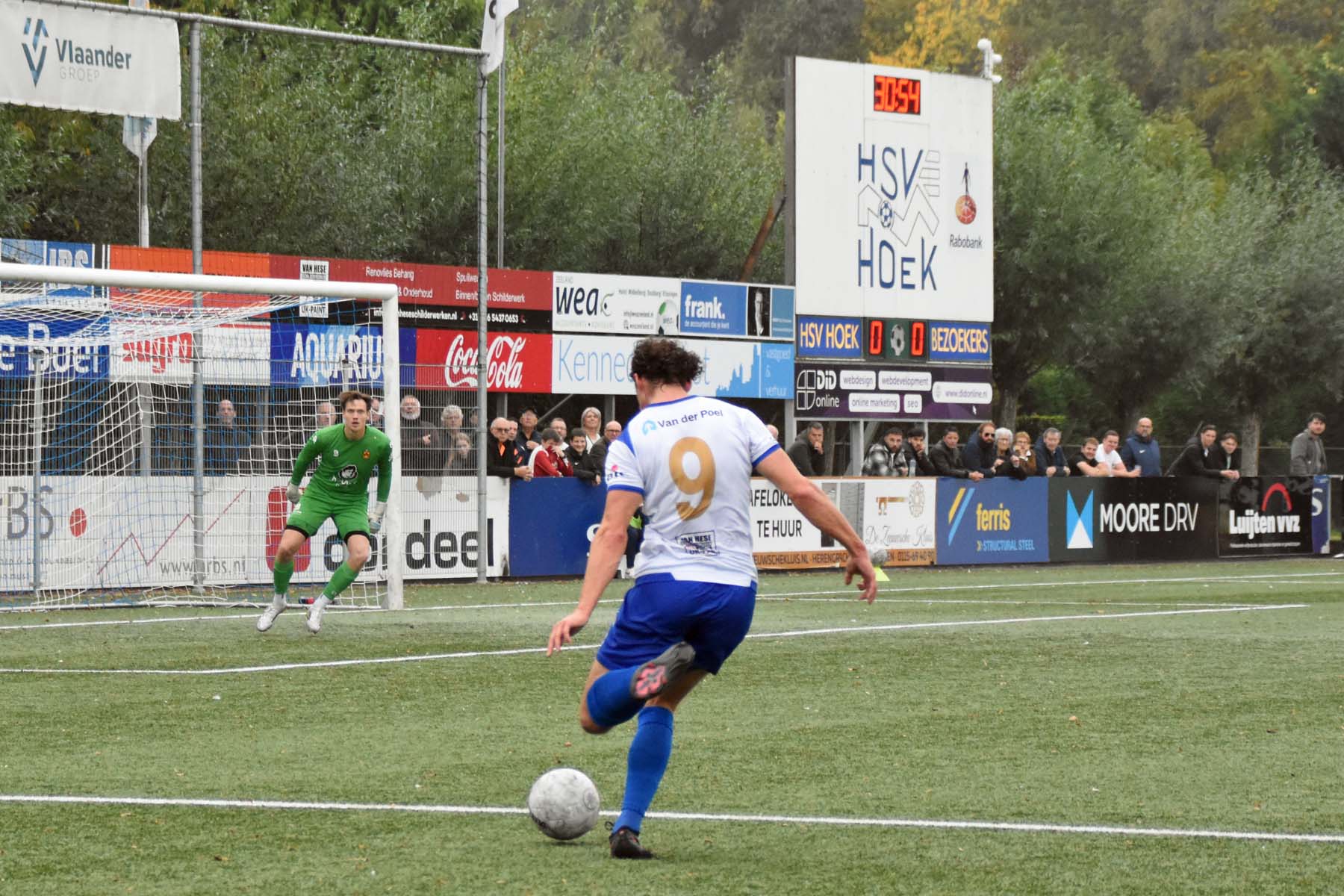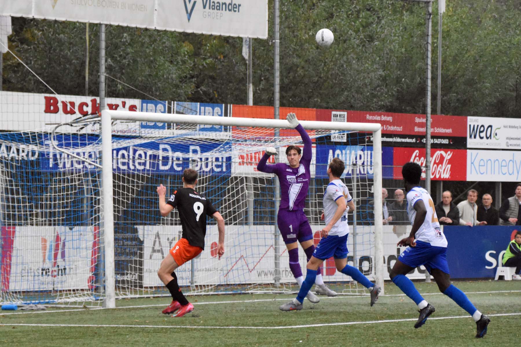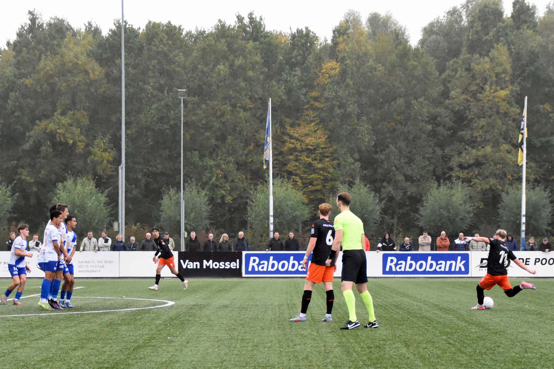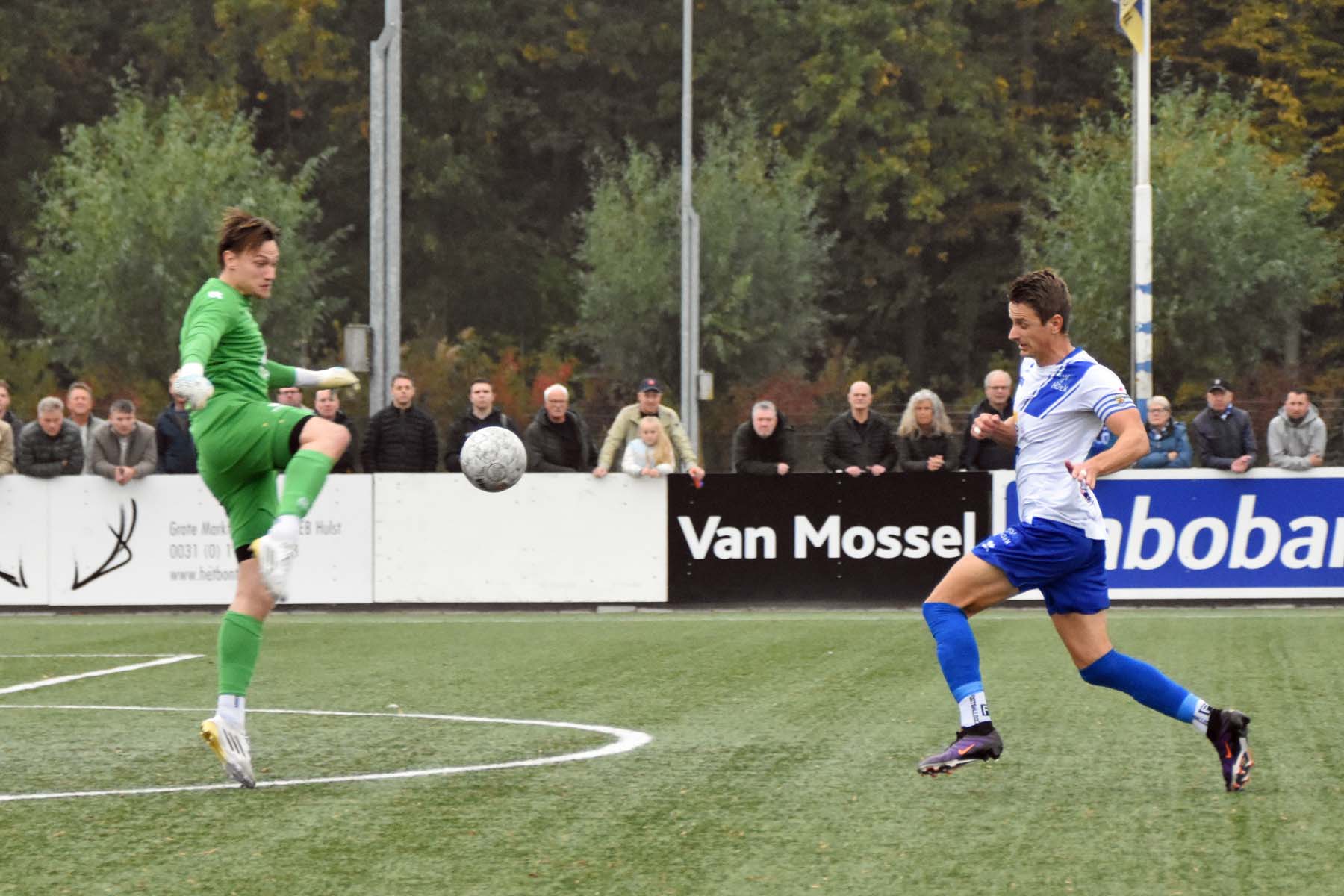 Robbie van Hauter. GertJan Martens zoekt zijn plek weer op voor het doel. Robbie van Hauter geeft voor..