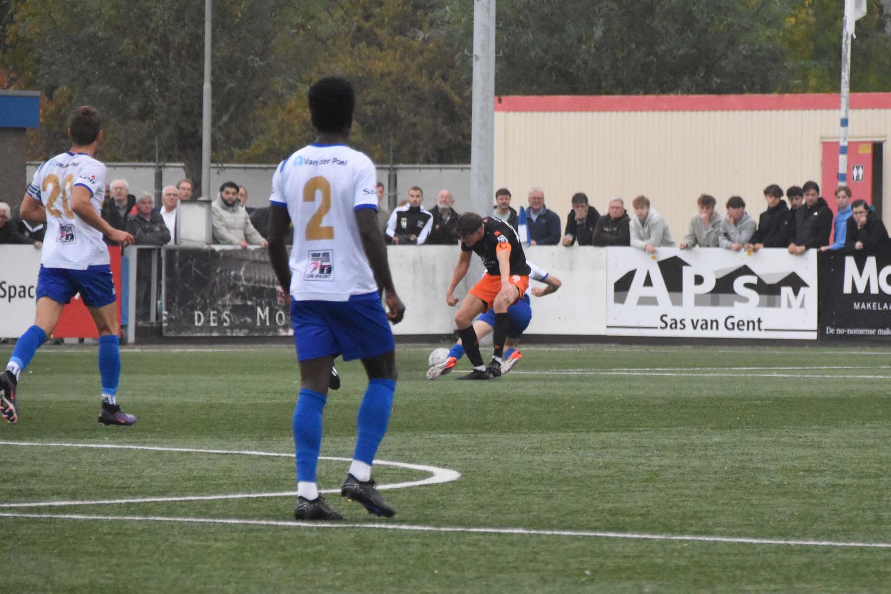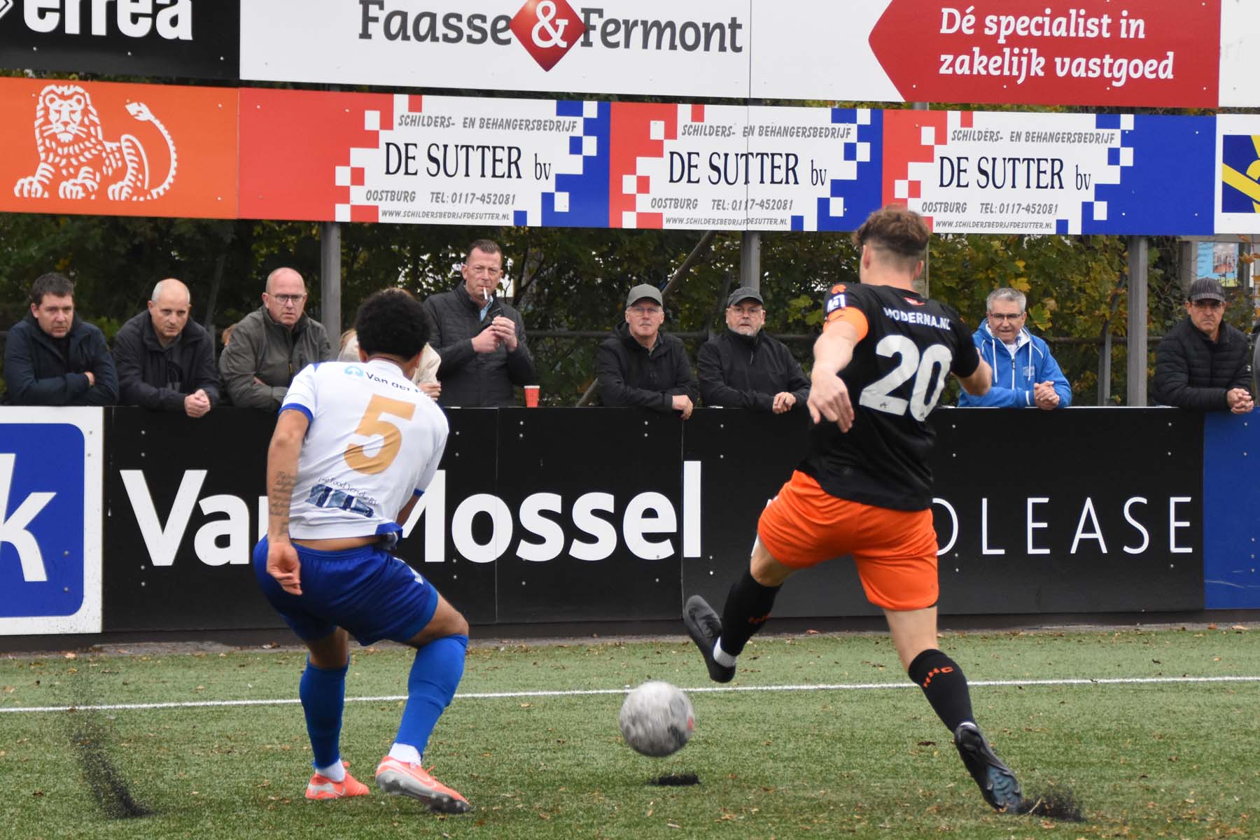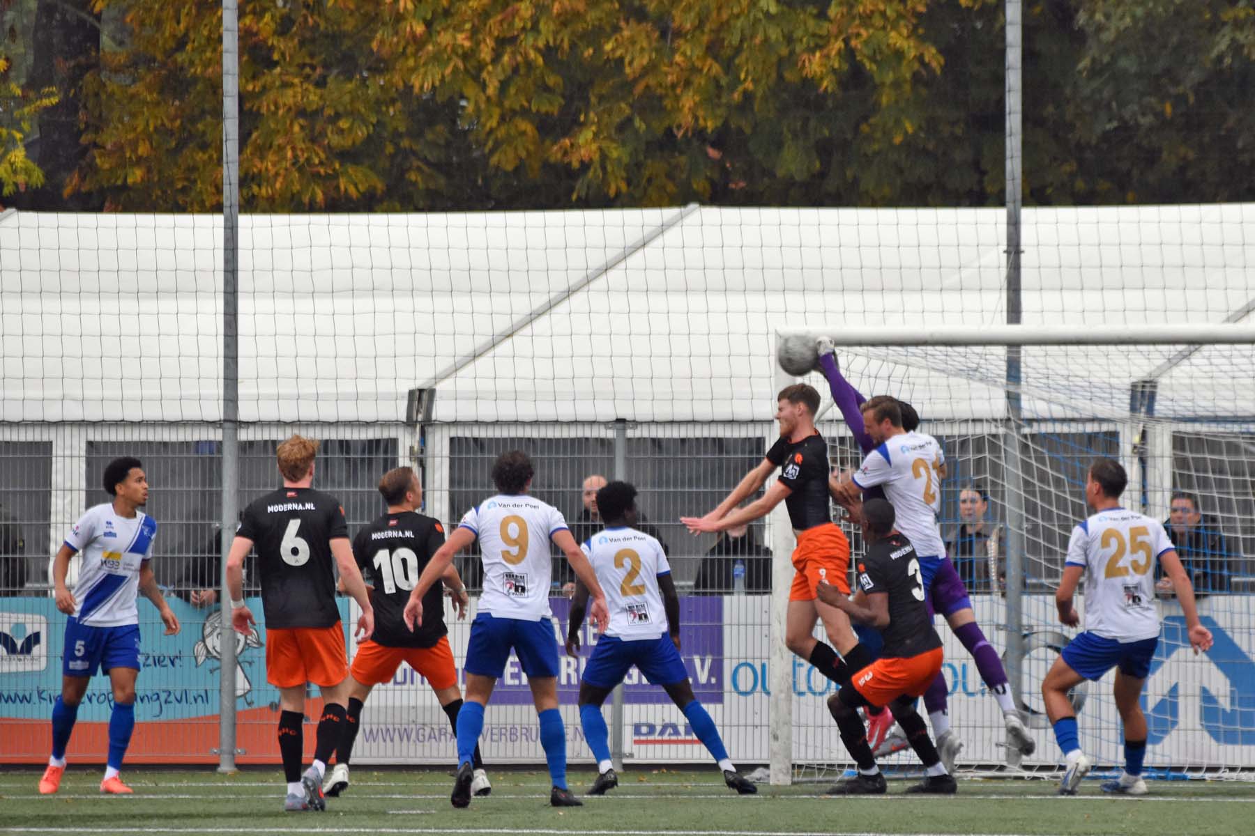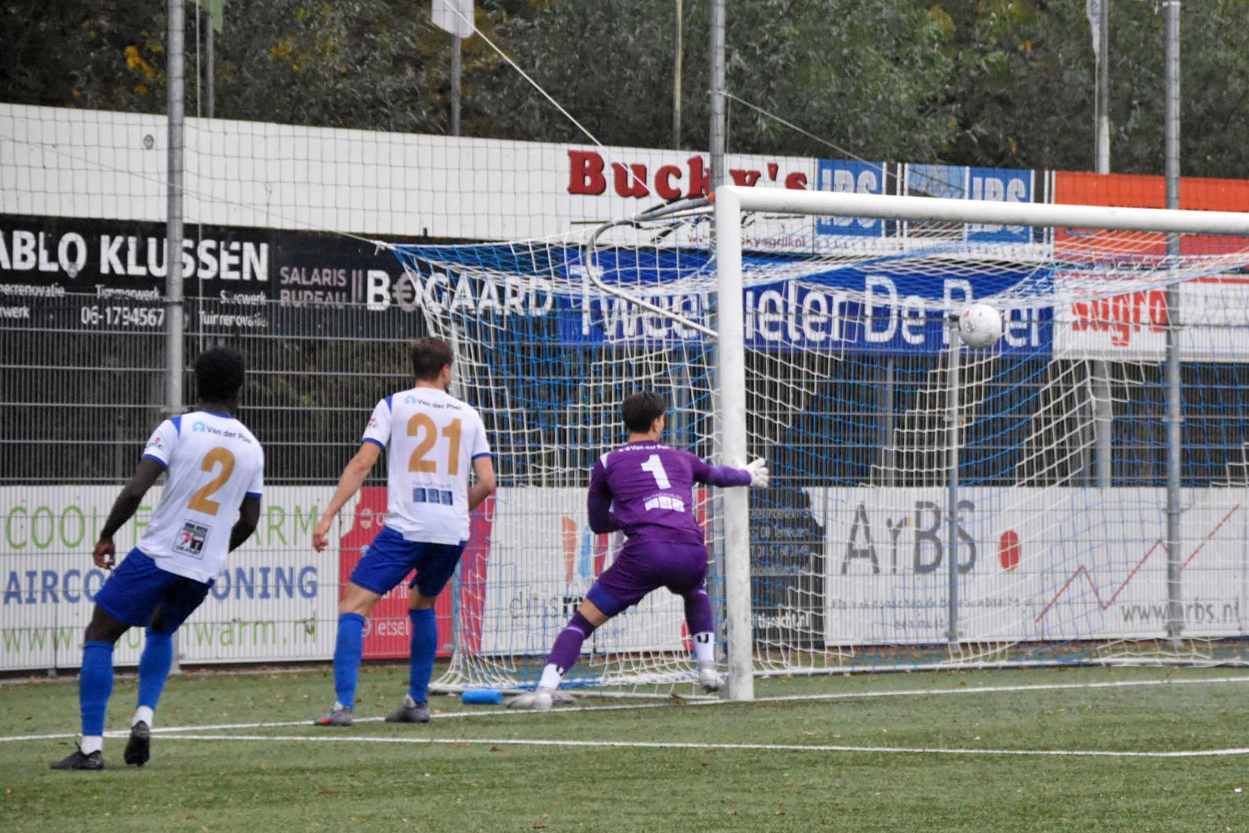 Robbie van Hauter. GertJan Martens zoekt zijn plek weer op voor het doel. Robbie van Hauter geeft voor..