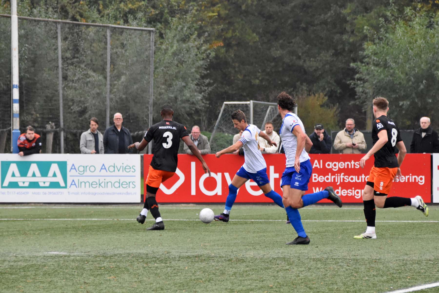 Vrije trap voor HHC Hardenberg. Finn Murre kan de bal gemakkelijk oprapen, kiest er voor de bal niet tot keepersbal te laten lopen, pakt snel de bal en geeft hem een poeier naar voren...