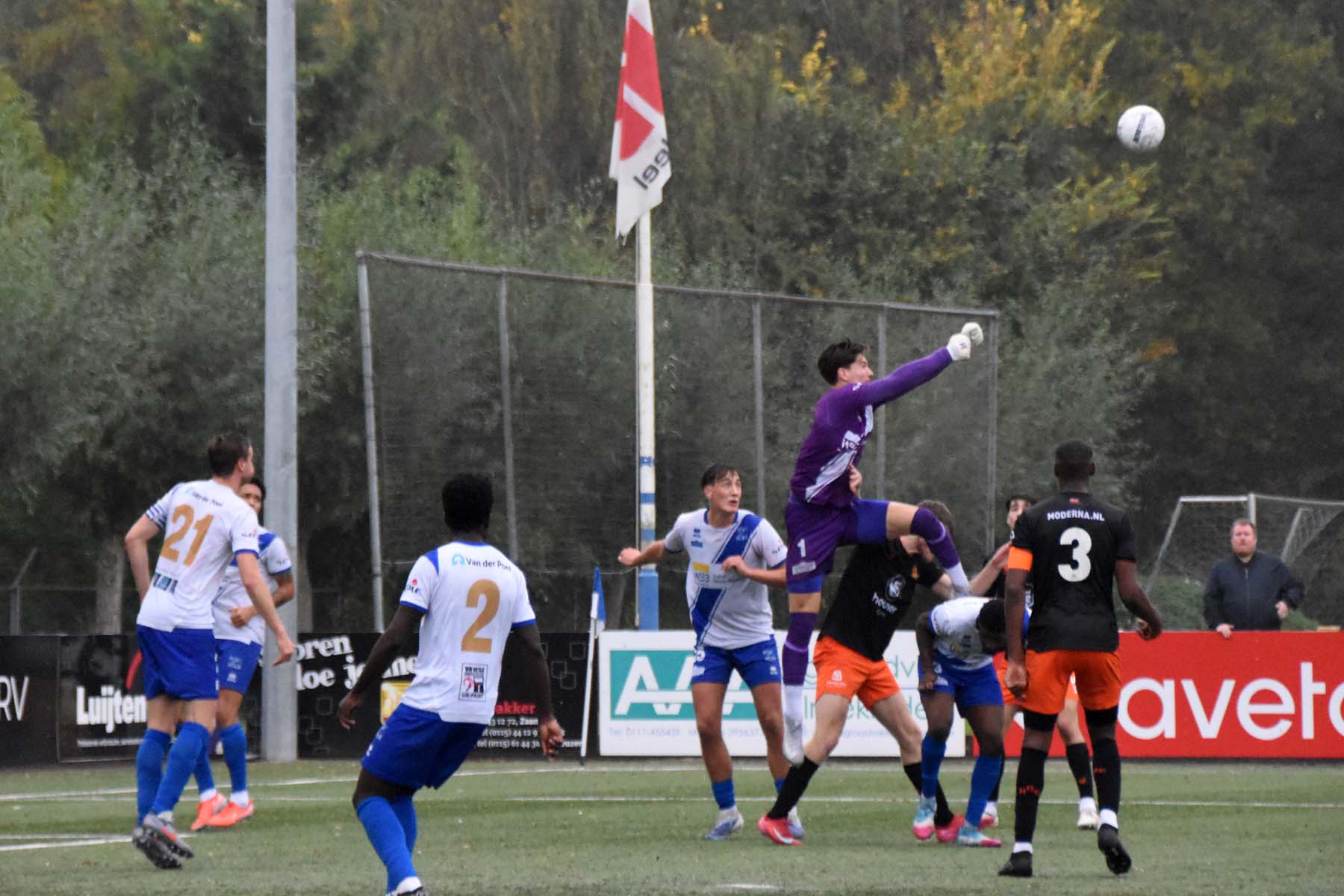 corner voor HHC Hardenberg. Keeper Finn Murre staat goed op te letten..