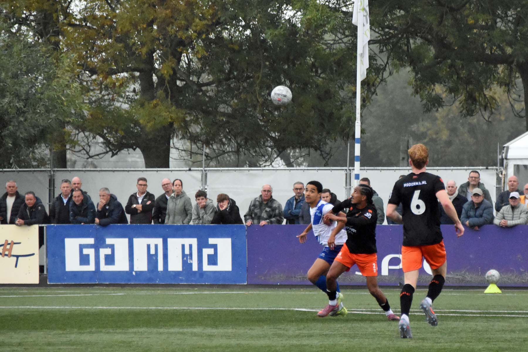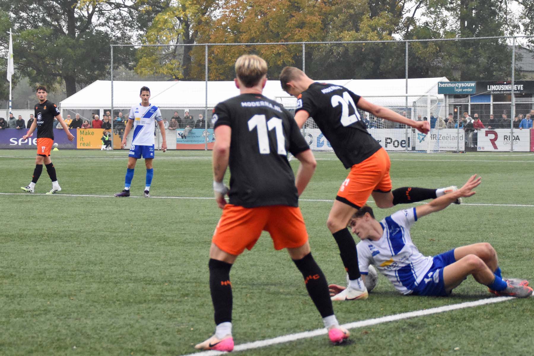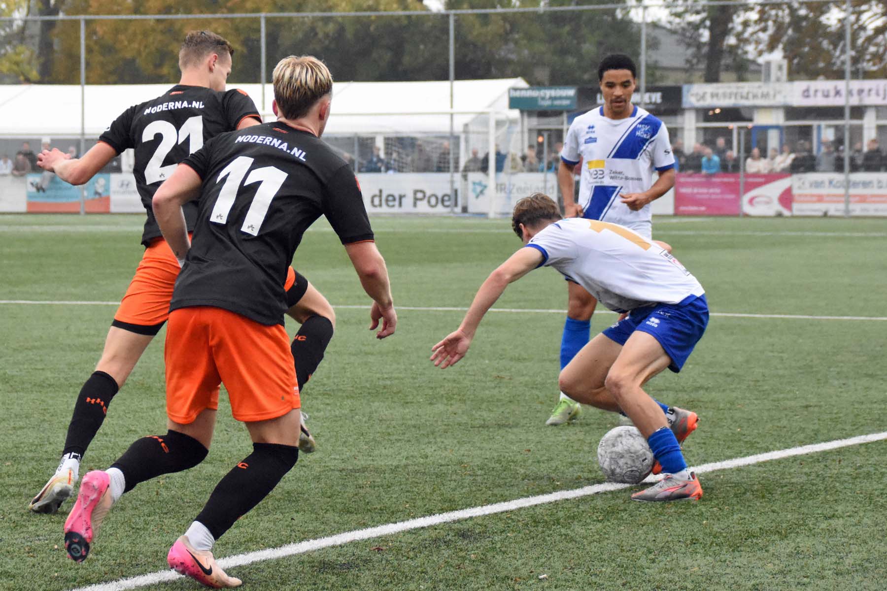 door het vroeg druk zetten van HSV Hoek raken ze bij HHC Hardenberg in paniek. De verdediger van HHC schiet de bal over de zijlijn..