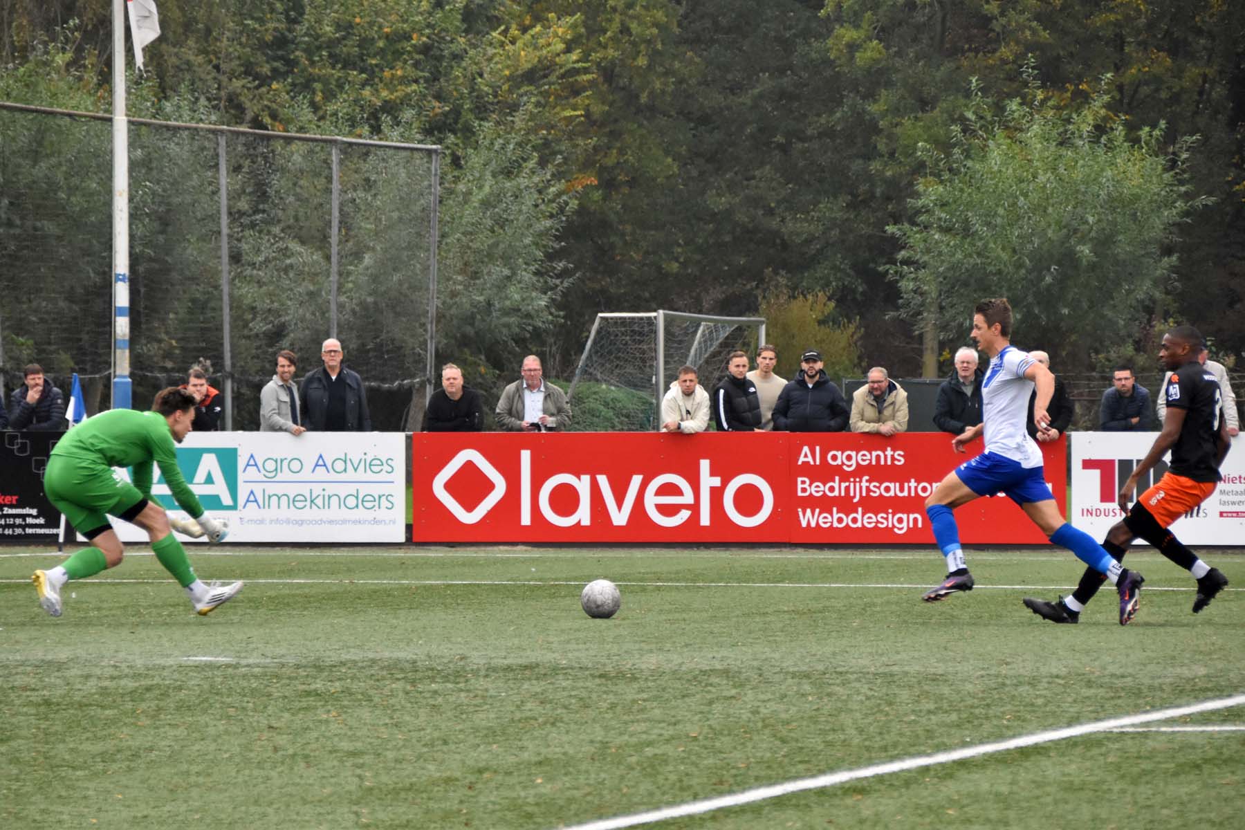 de keeper van HHC Hardenberg komt ver zijn doel uit, schot van Steve Schalkwijk gaat net naast.