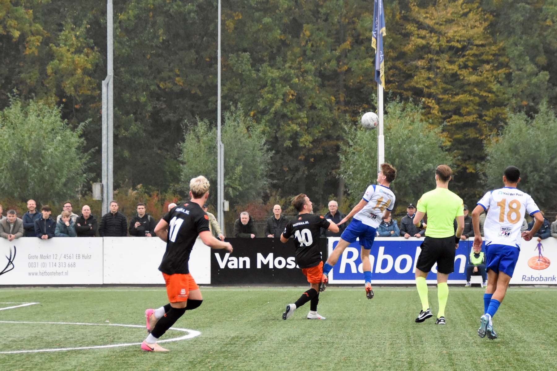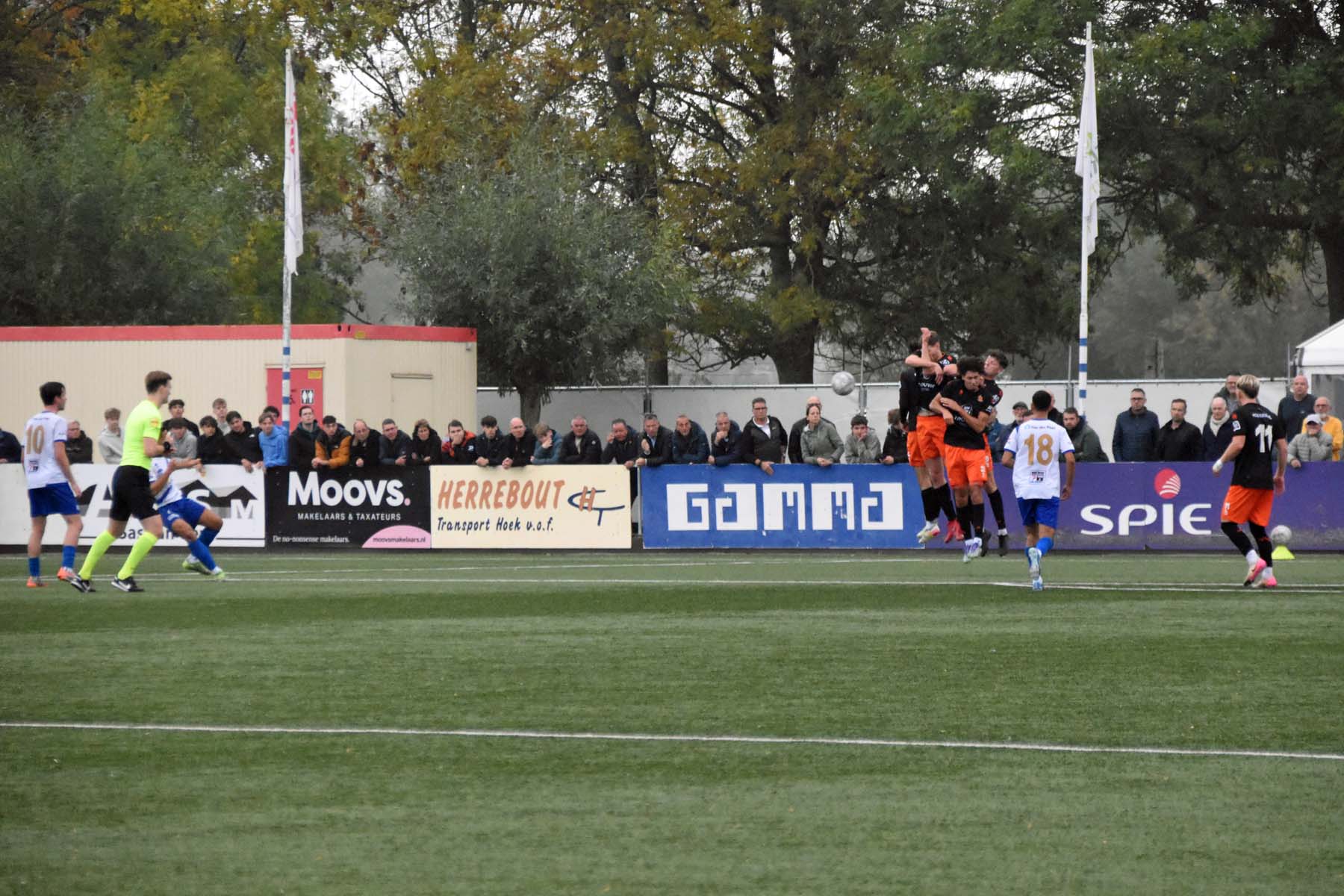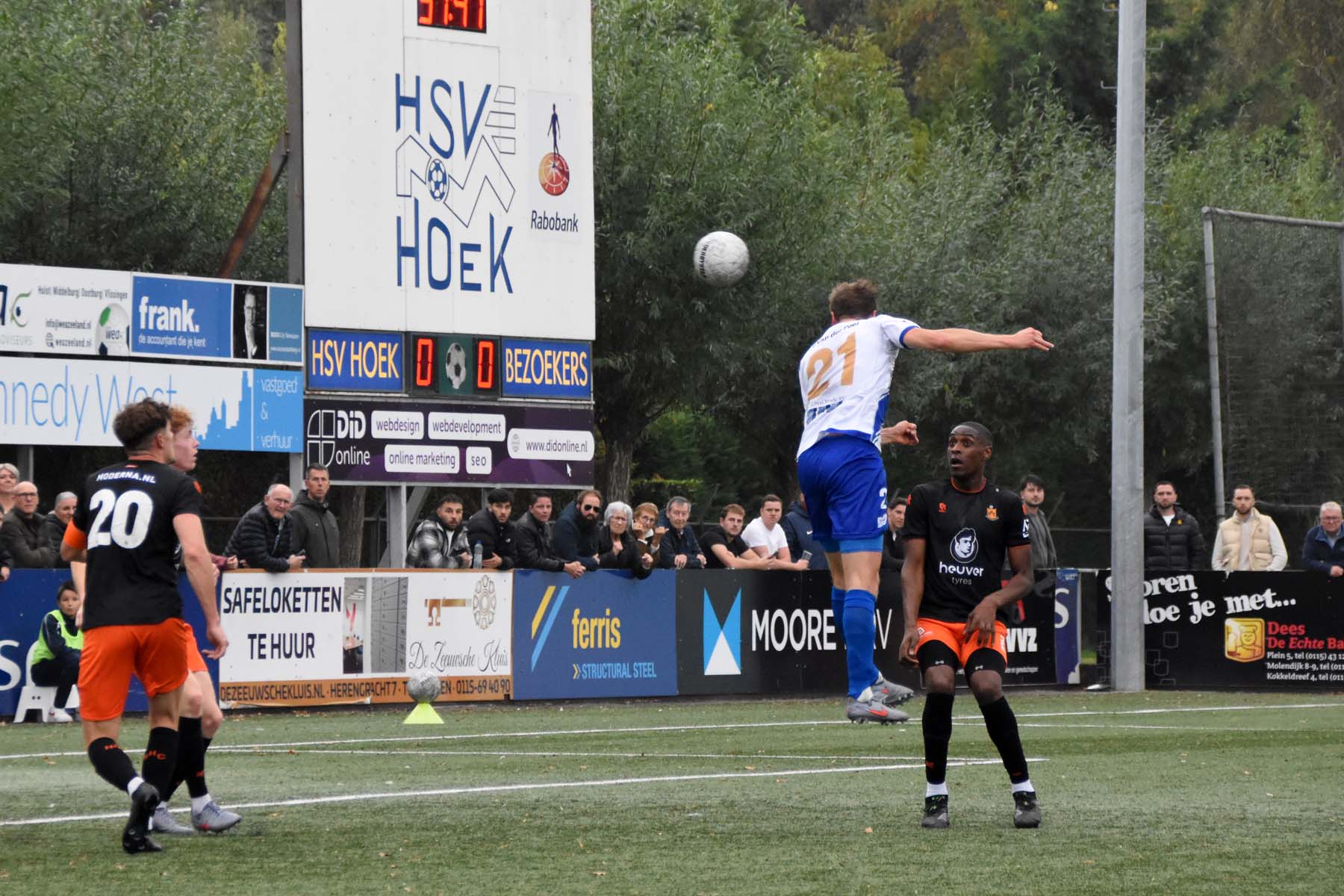 Alle hens aan dek bij HSV Hoek. Wout den Engelmans kopt weg.