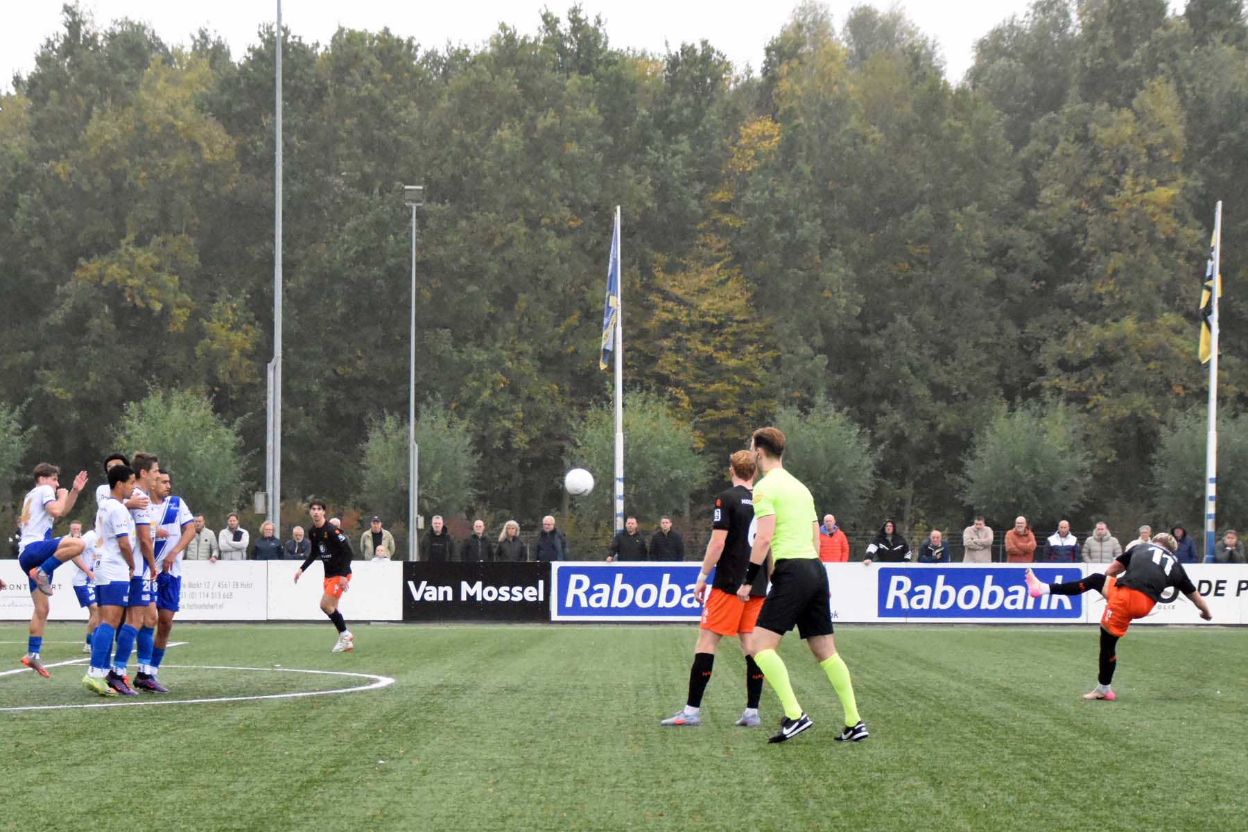 bij HHC Hardenberg vinden ze dat de scheidsrechter had moeten fluiten omdat een speler in de muur hard werd geraakt en de vraag is stond Gertjan Martens niet buitenspel? Bij HSV Hoek hebben ze daar maling aan 1-0 Gertjan Martens..