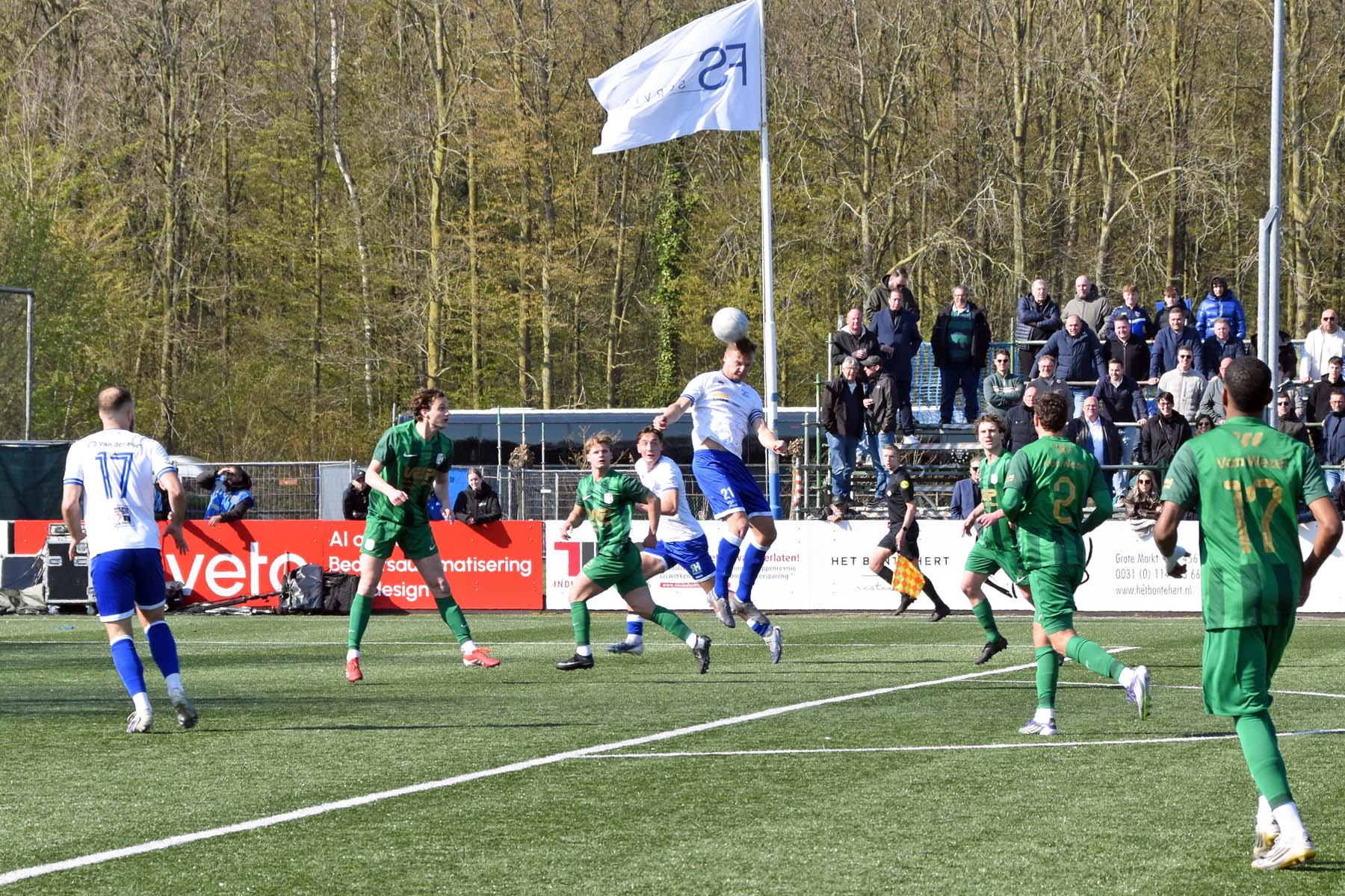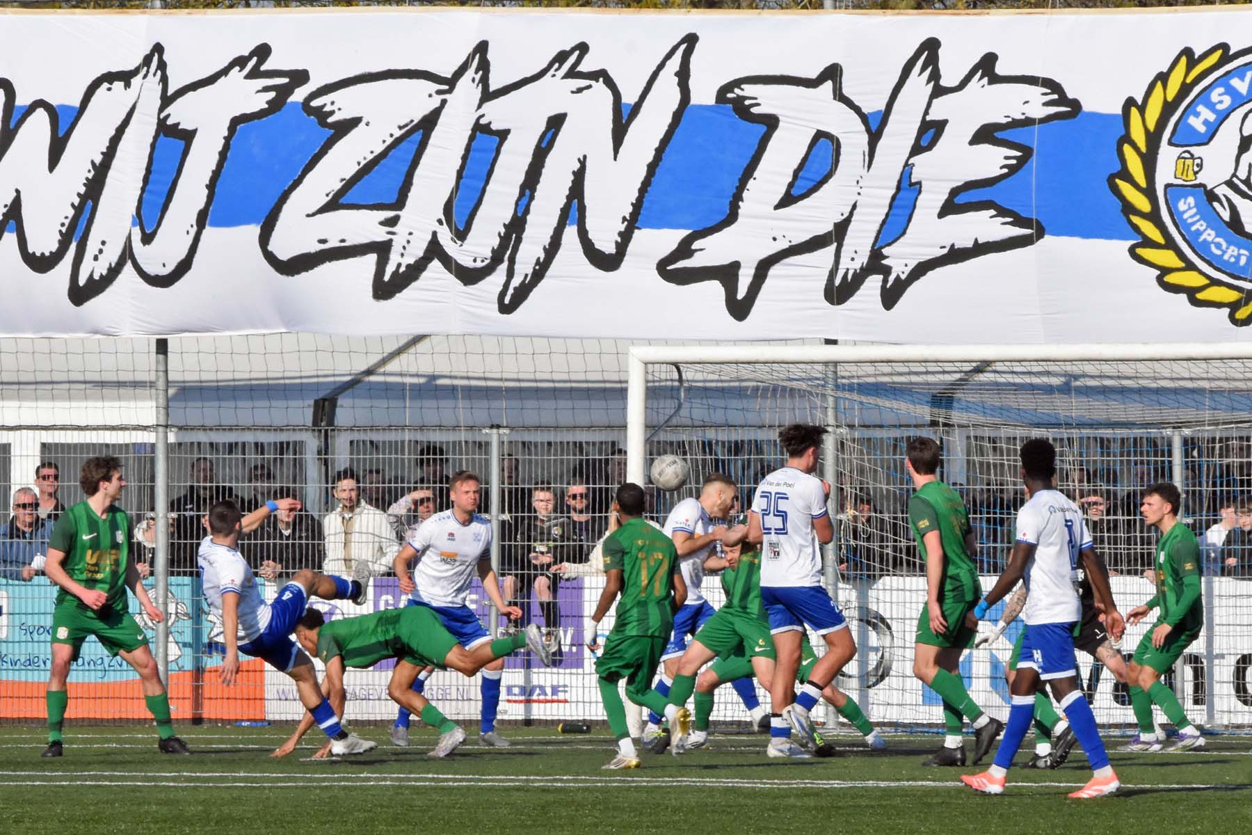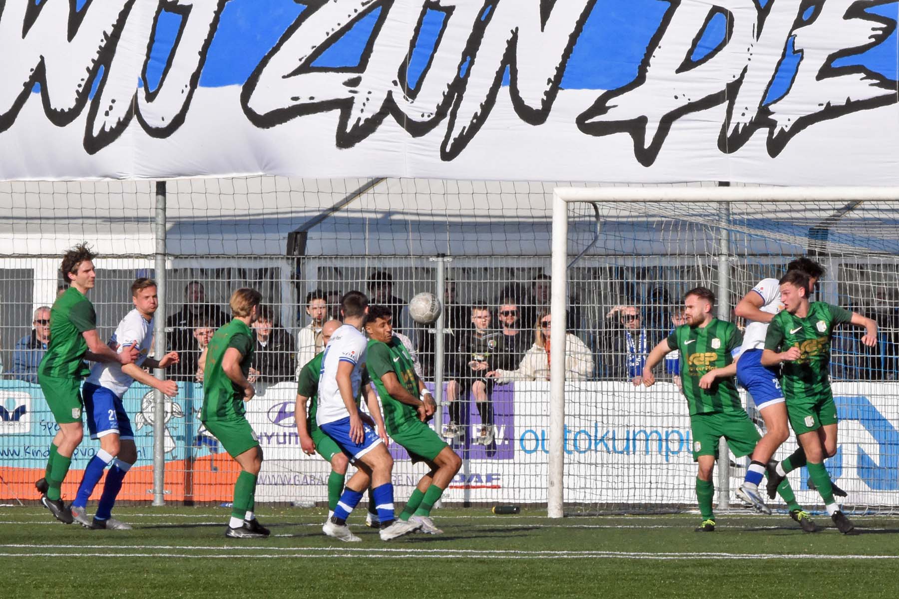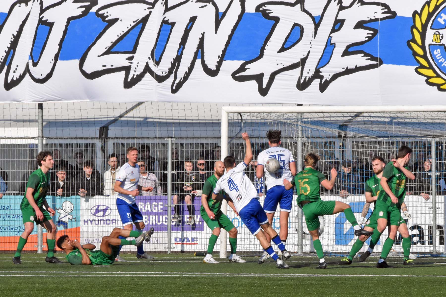 vrije trap voor HSV Hoek. Gertjan Martens probeert de bal te koppen..