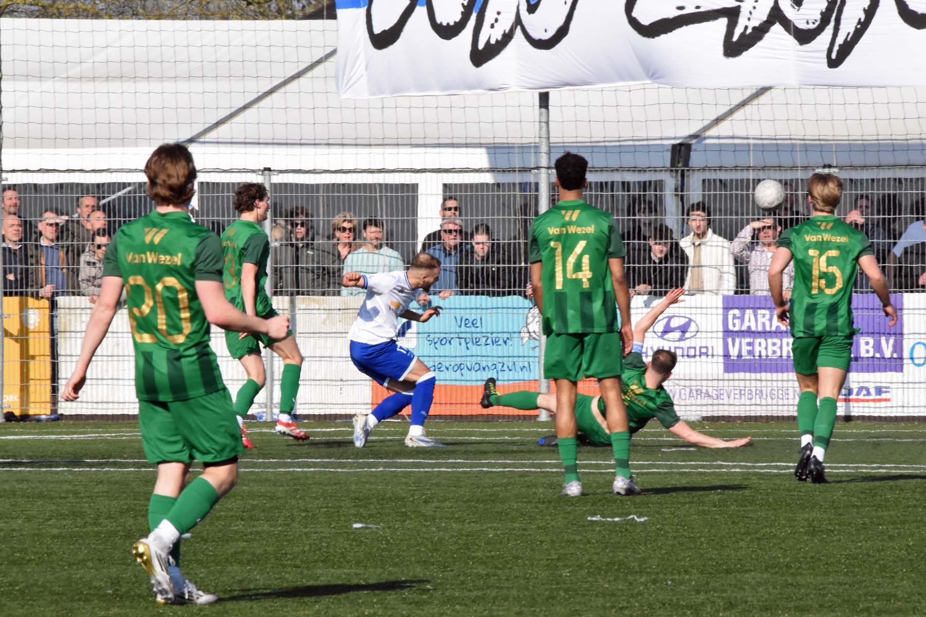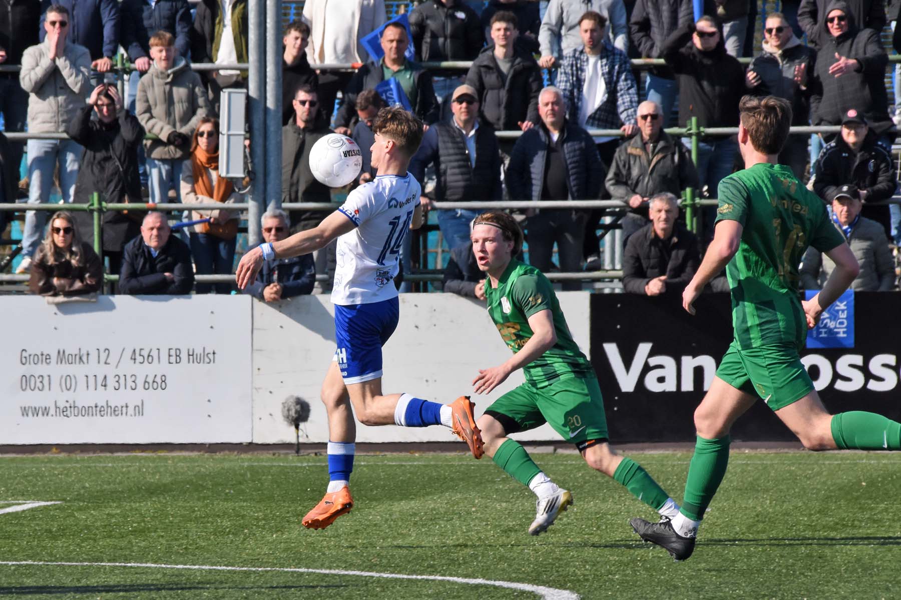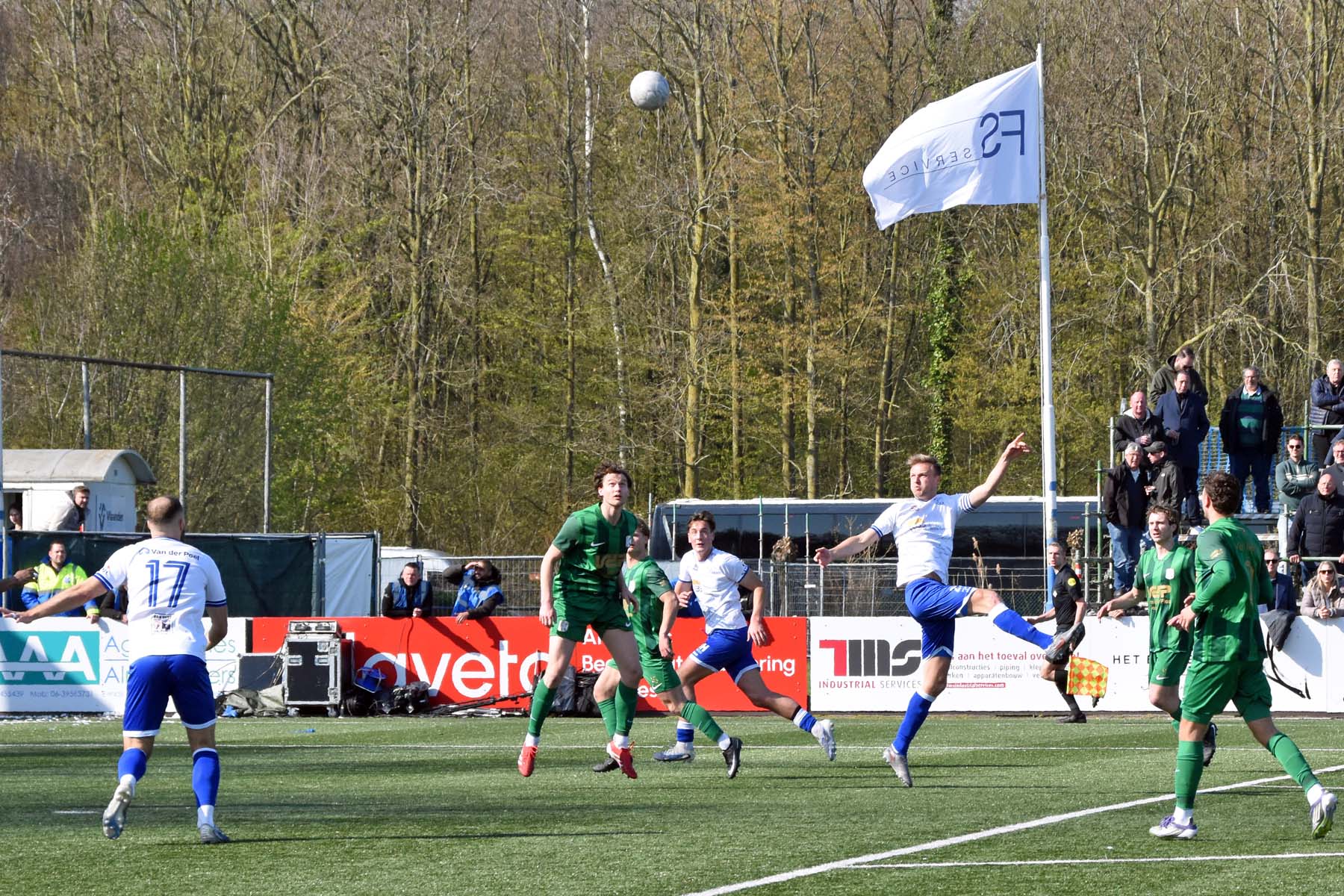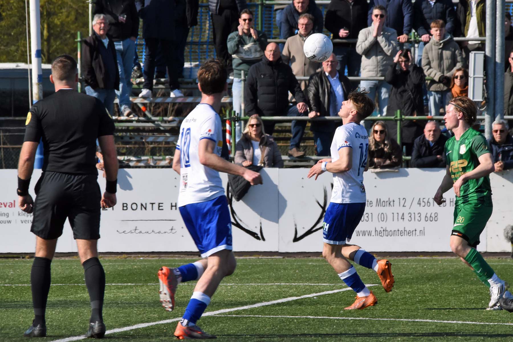 vrije trap voor HSV Hoek. Gertjan Martens probeert de bal te koppen..