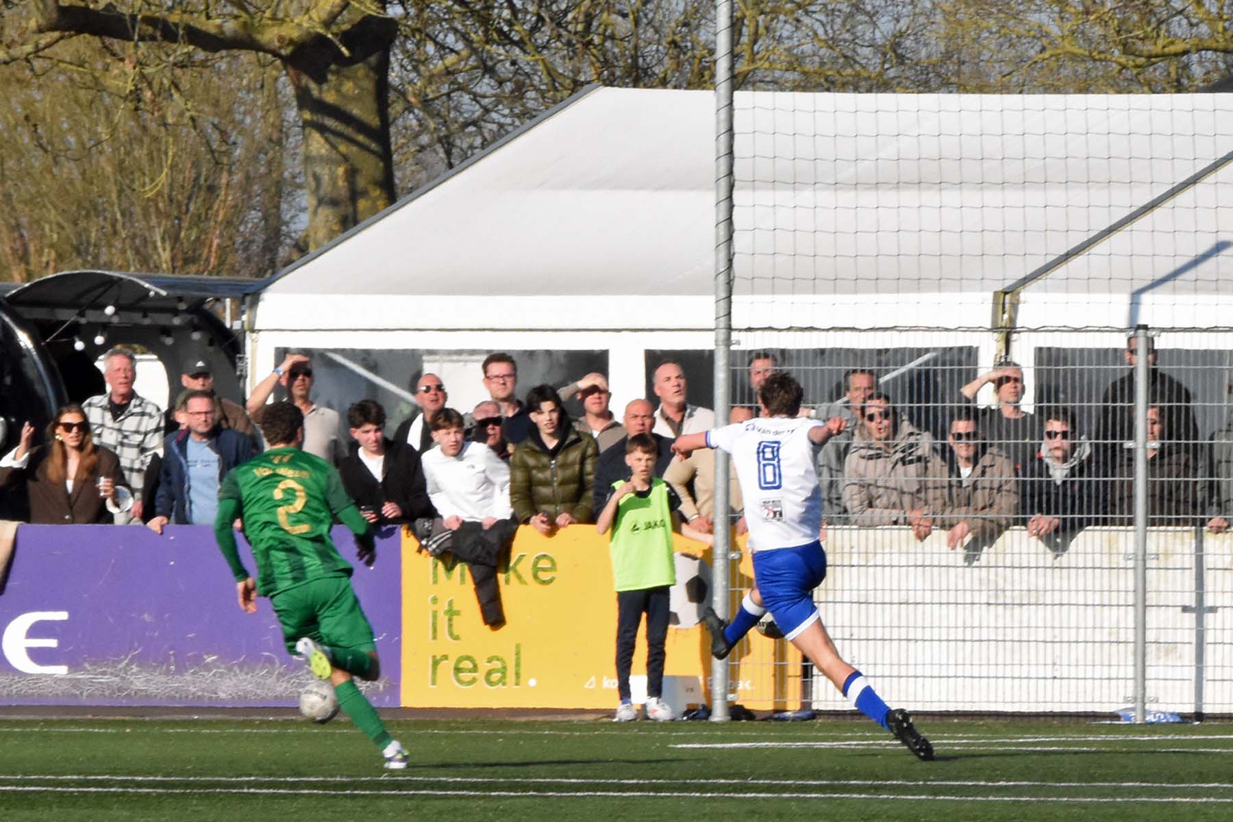 de bal komt voor de voeten van Jarno Lion. Jarno Lion aarzelt niet en haalt uit..