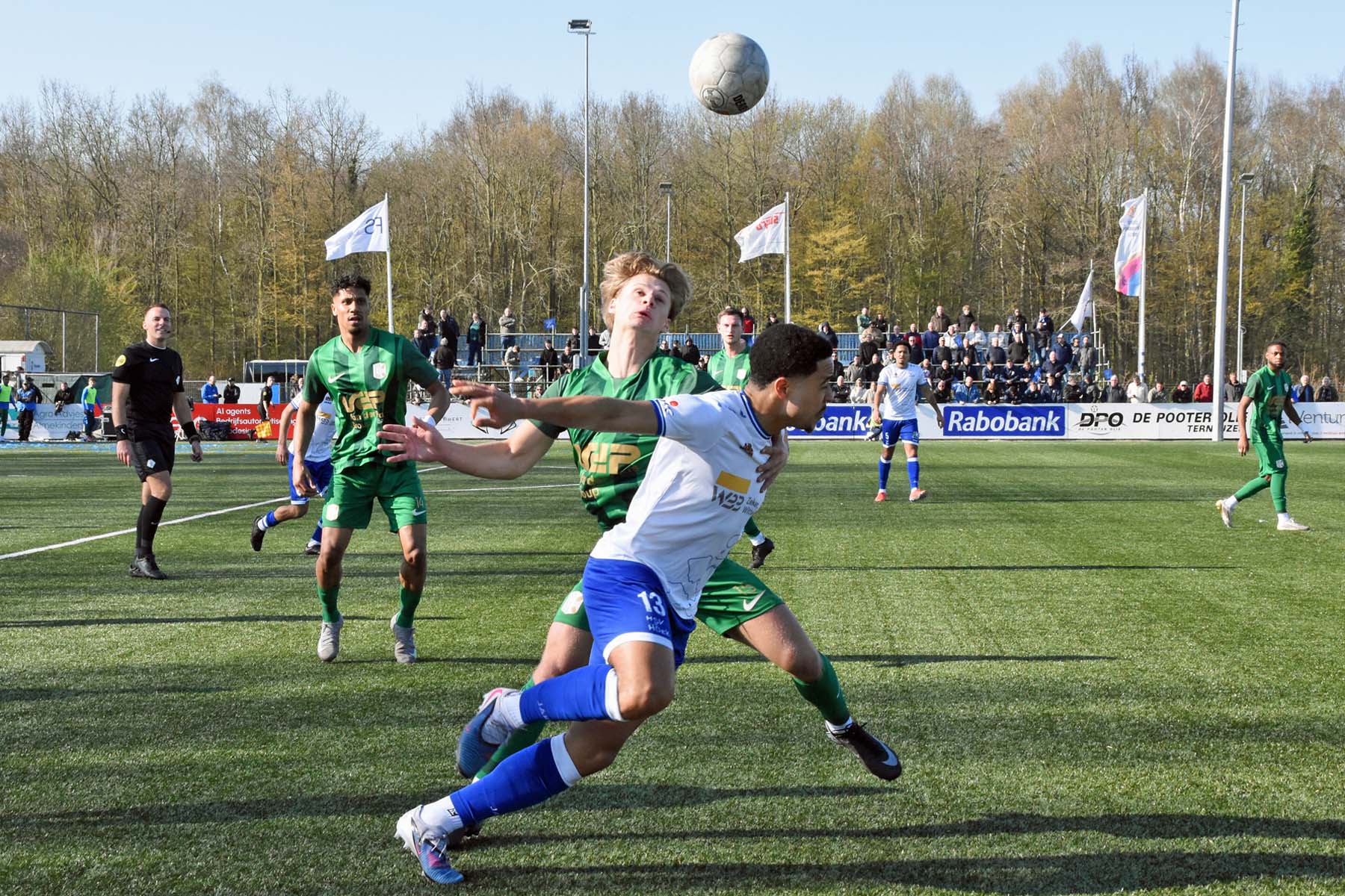 Rousseau De Poorter blijft naar de bal kijken, geeft zijn directe tegenstander een klein beetje ruimte..