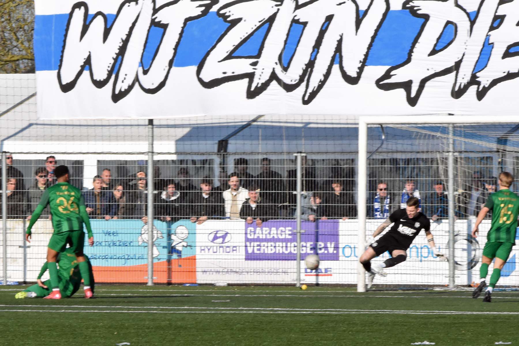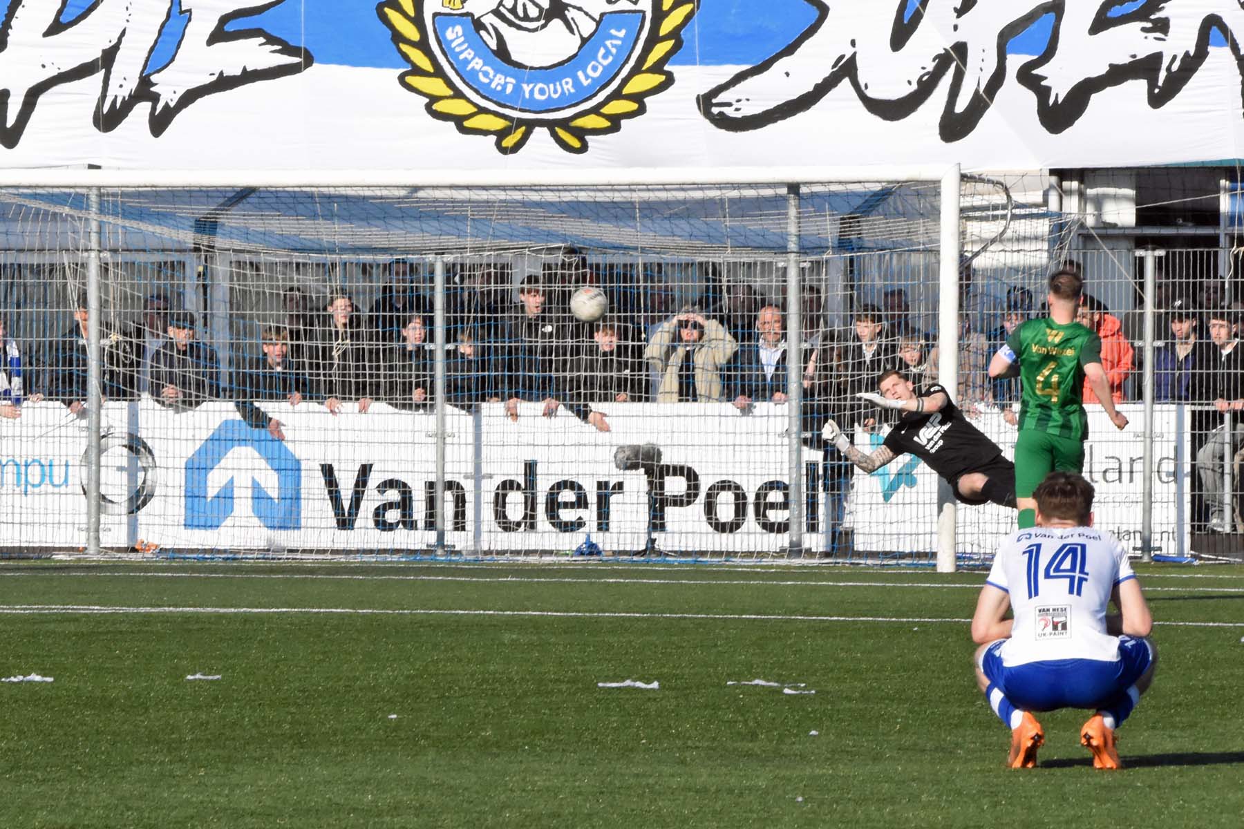 keeper Jansen van Quick Boys staat uitstekend te keepen.