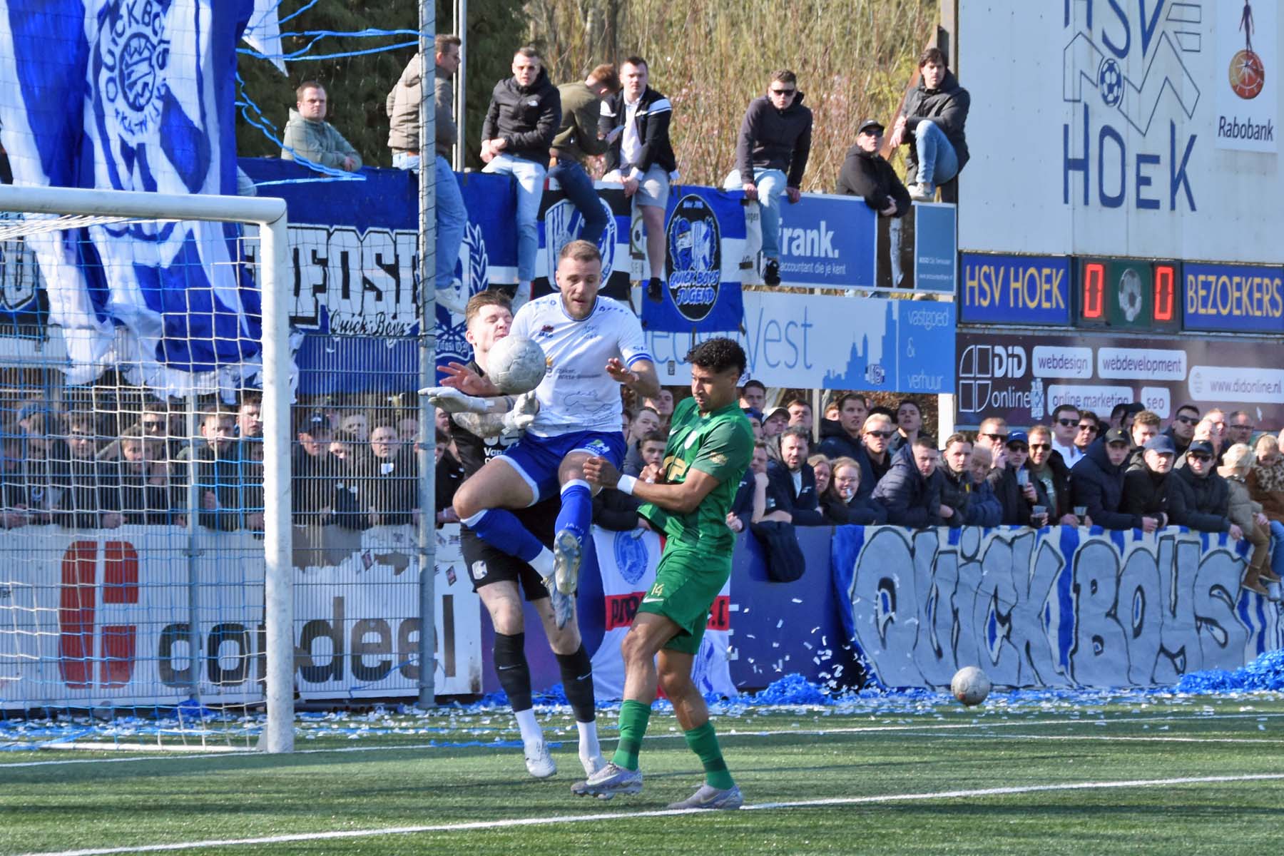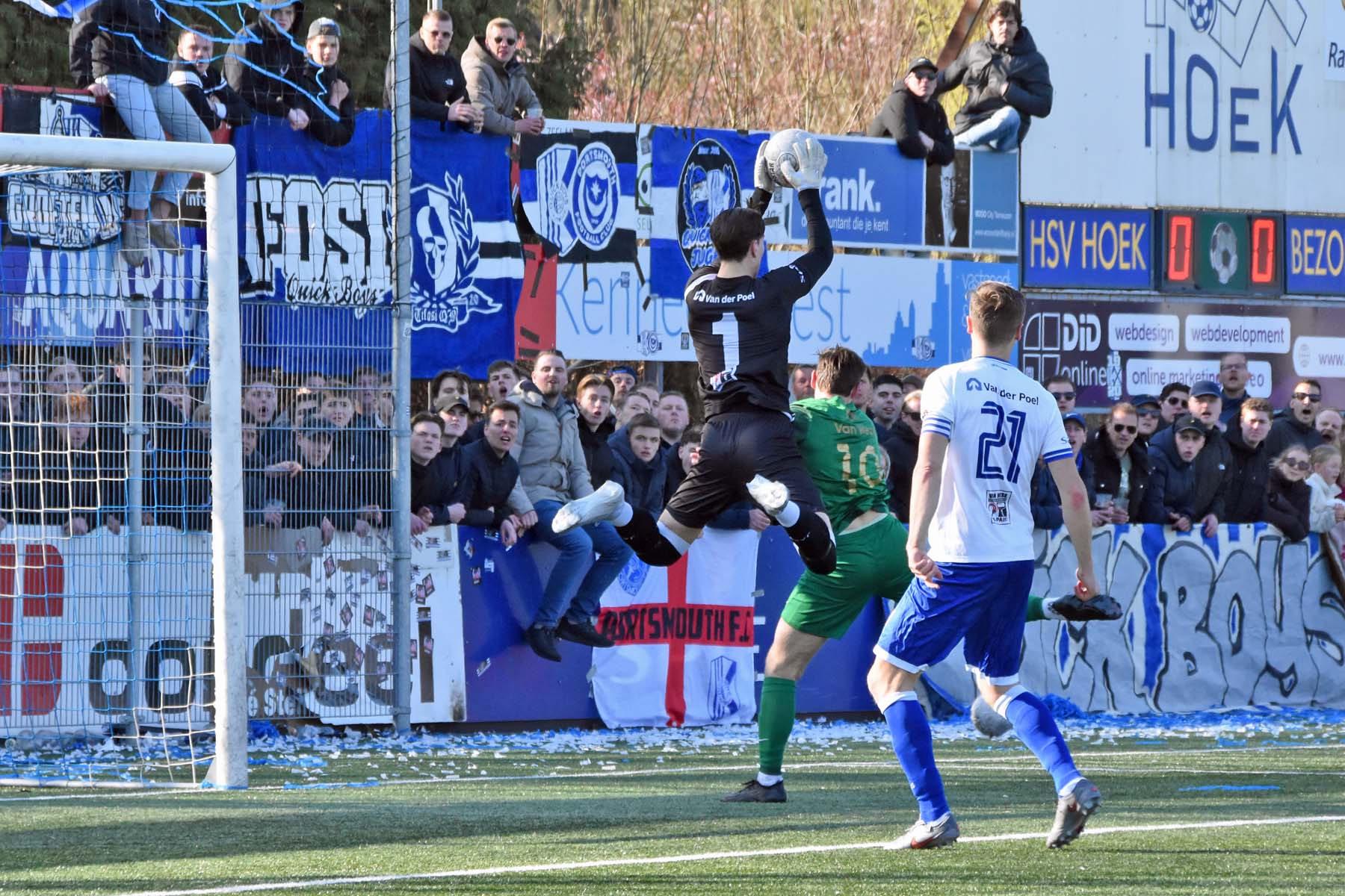 de keeper van Quick Boys staat voortreffelijk te keepen...