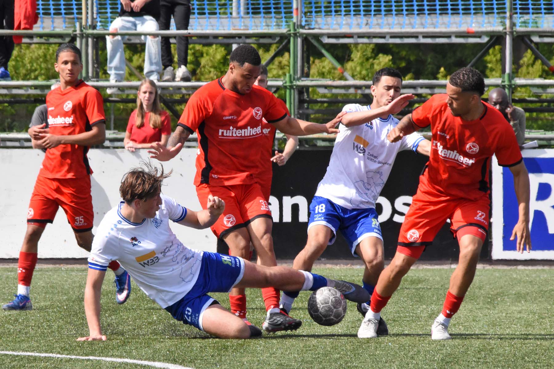 HSV Hoek heeft zaterdagmiddag in eigen huis Jong Almere City met 4-0 verslagen. De ploeg van trainer Gérard de Nooijer was de hele wedstrijd de betere partij en liep in de slotfase definitief weg bij de Almeerse beloften. Hoek blijft tweede in de Tweede Divisie.