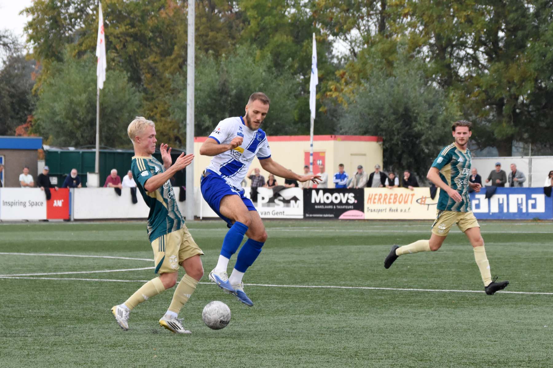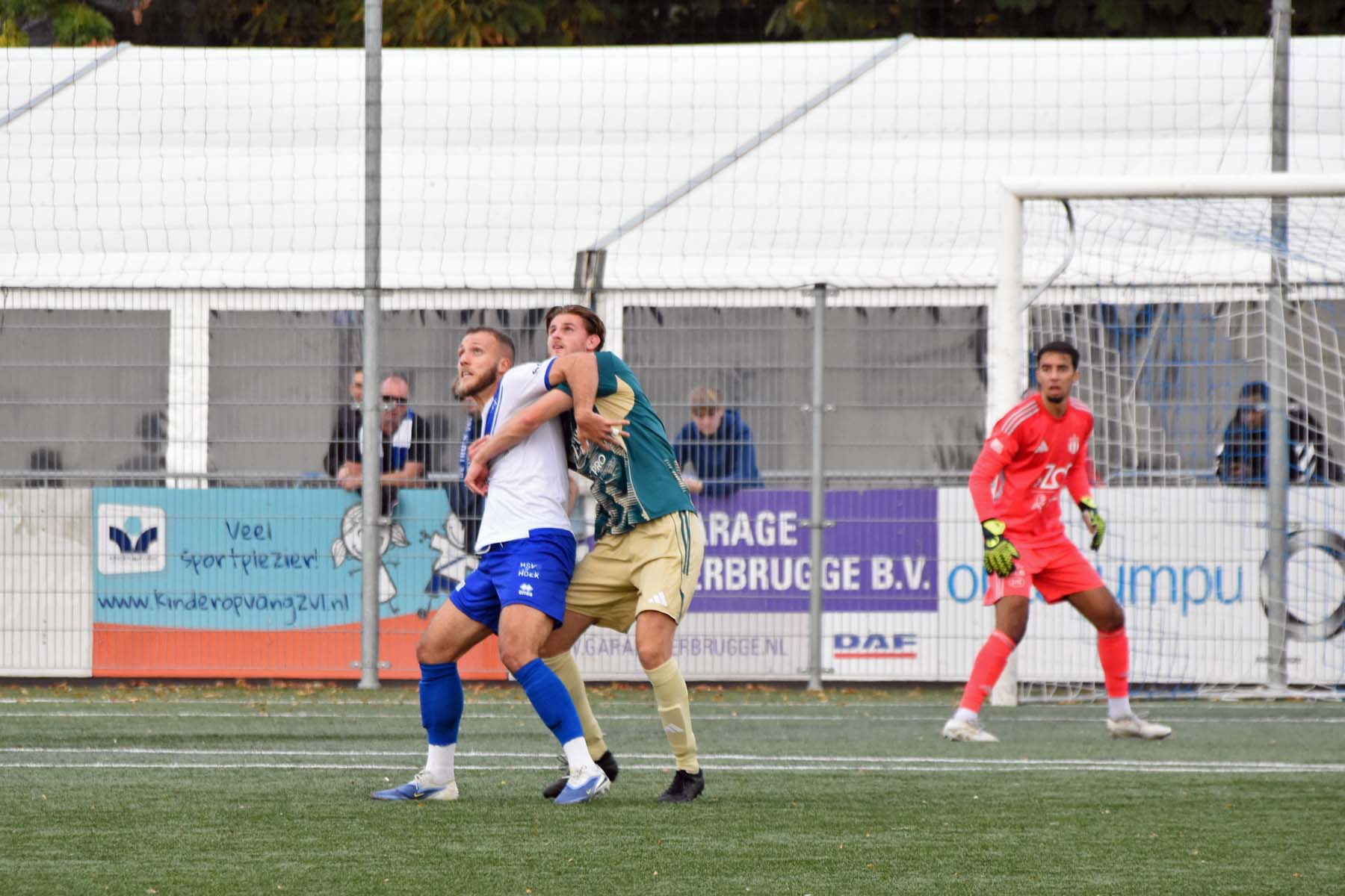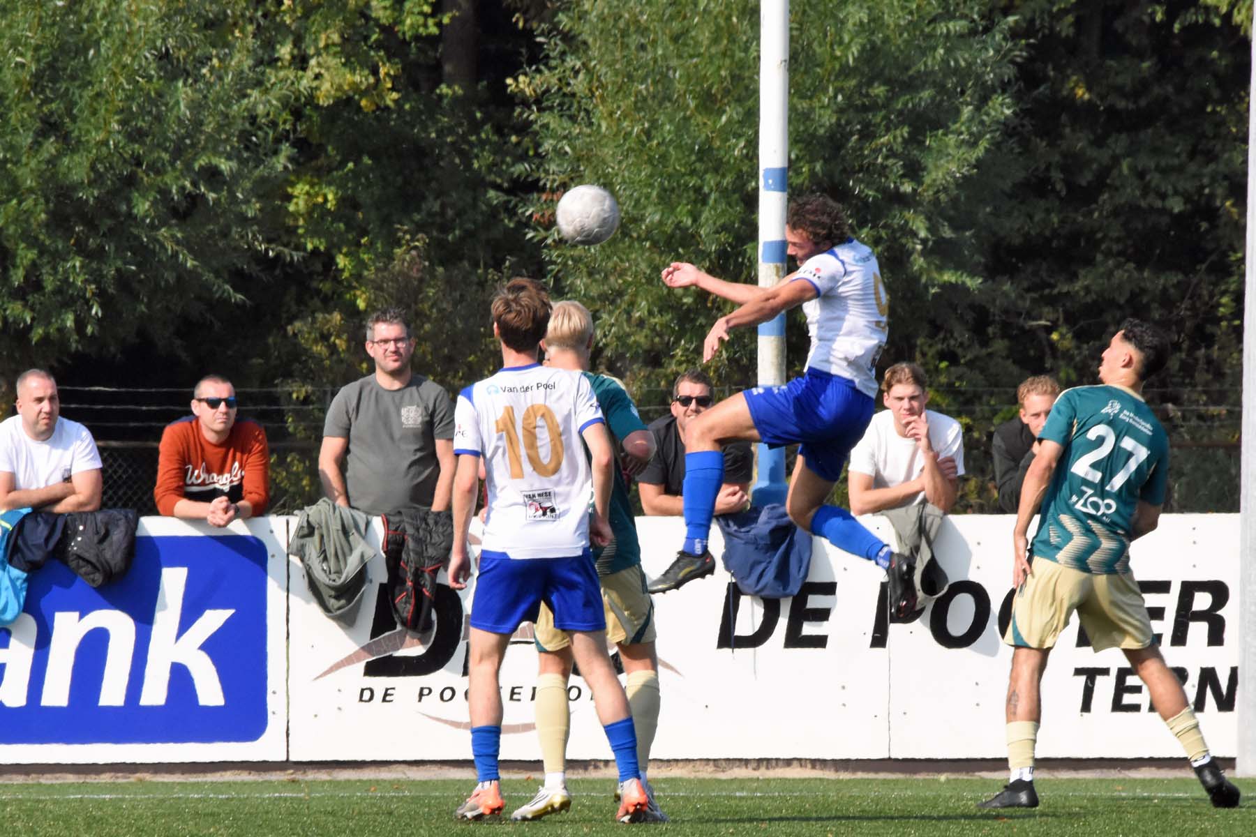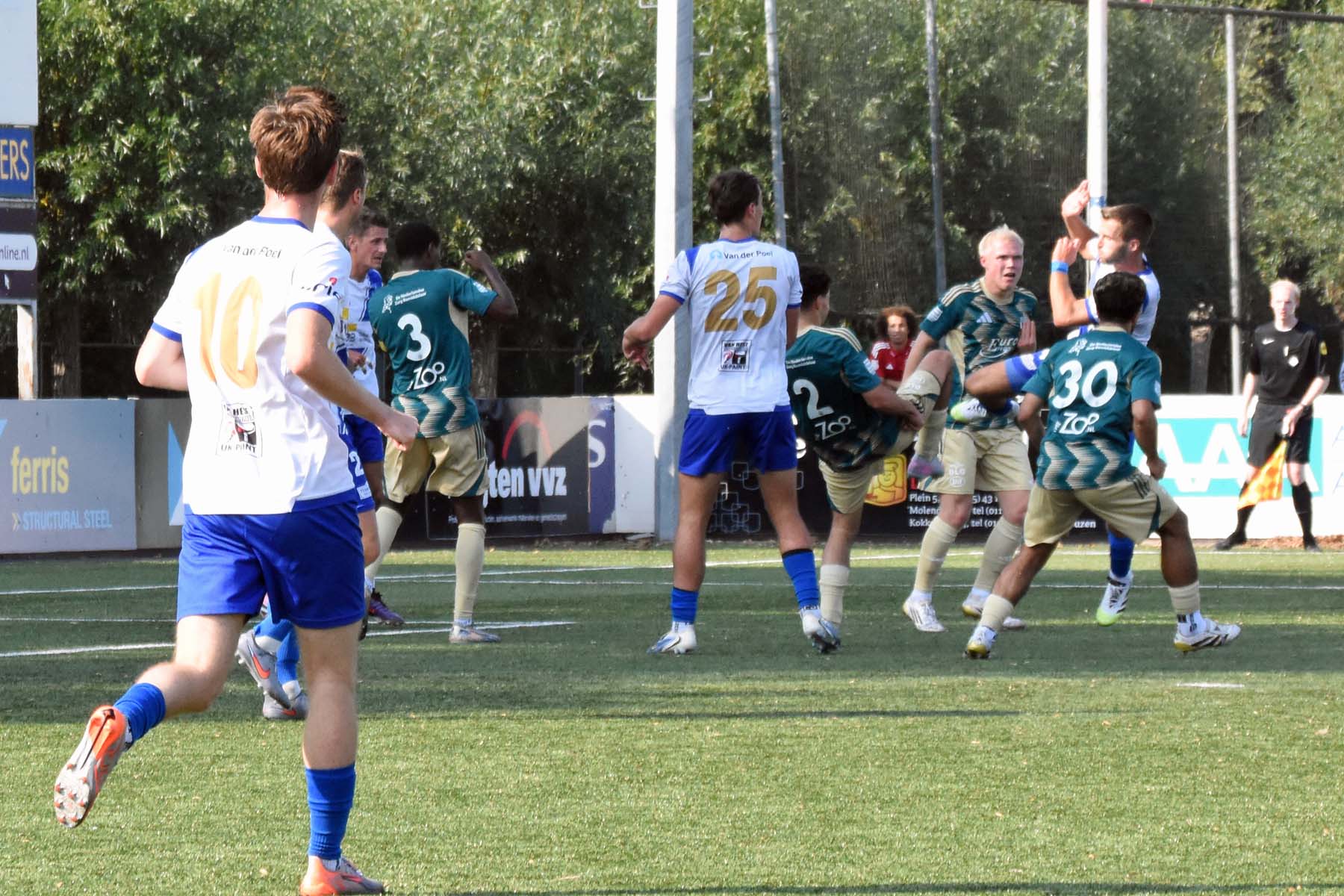 Corner voor Excelsior Maassluis. Wout den Engelsman gooit zich voor zijn directe tegenstander en kopt de bal weg.