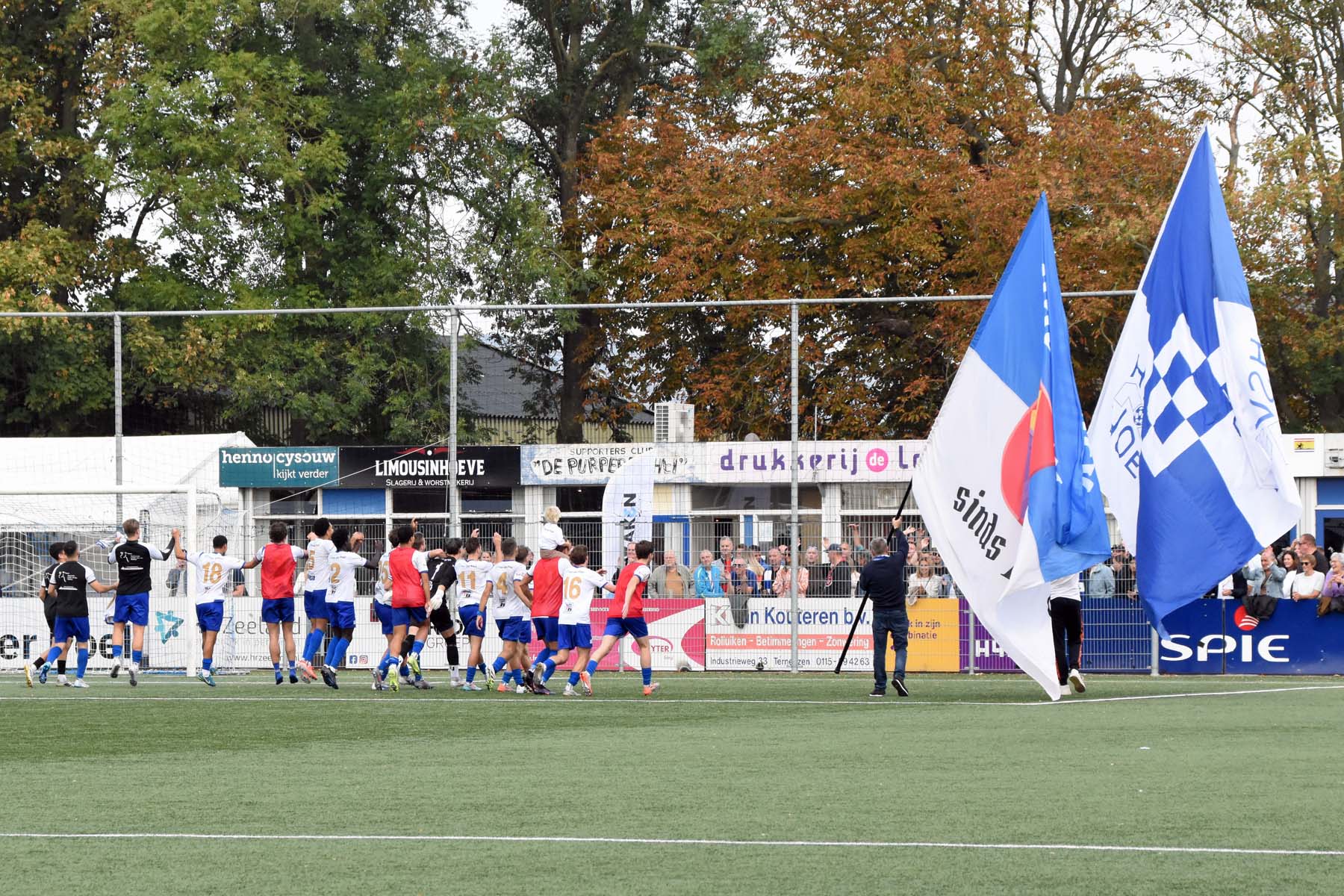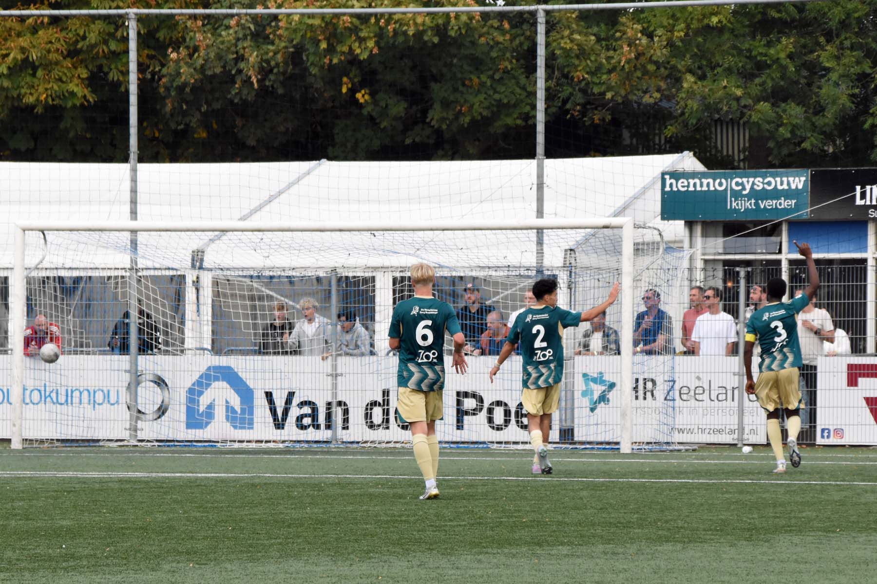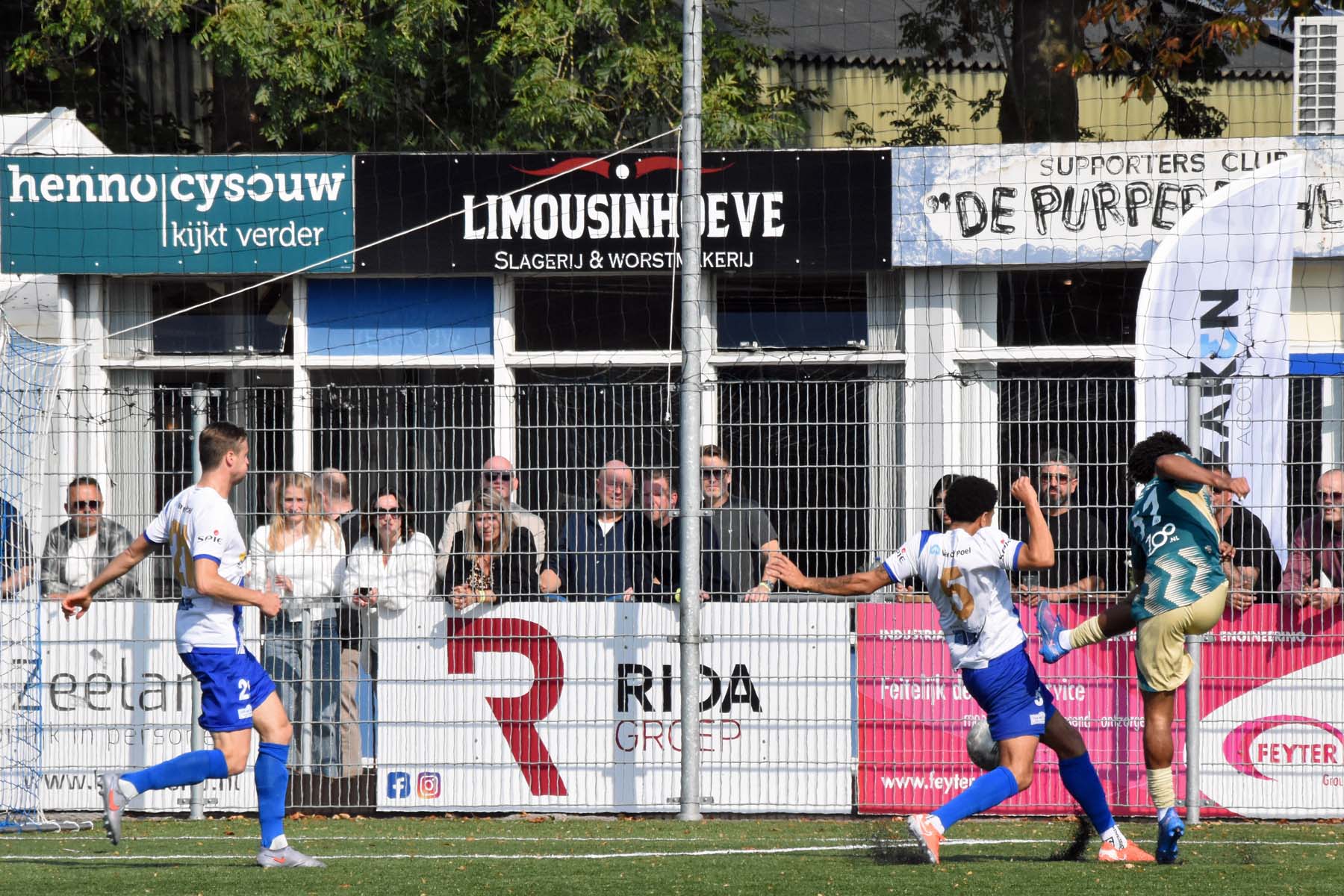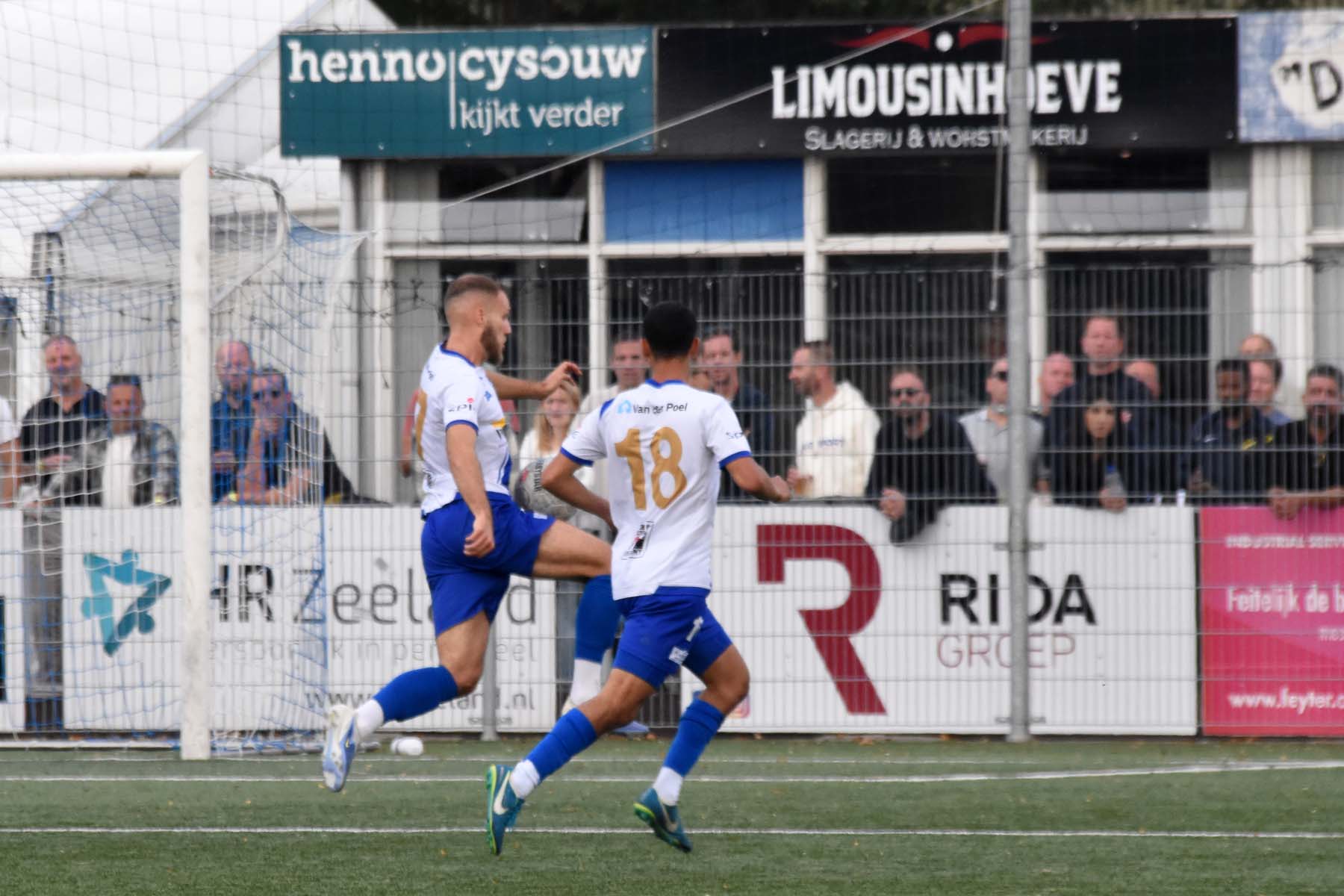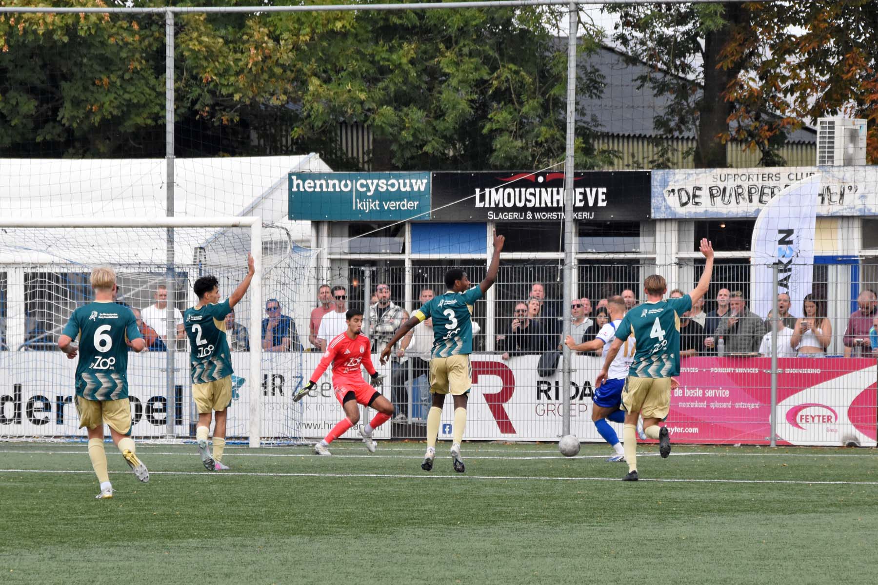 Corner voor Excelsior Maassluis. Wout den Engelsman gooit zich voor zijn directe tegenstander en kopt de bal weg.