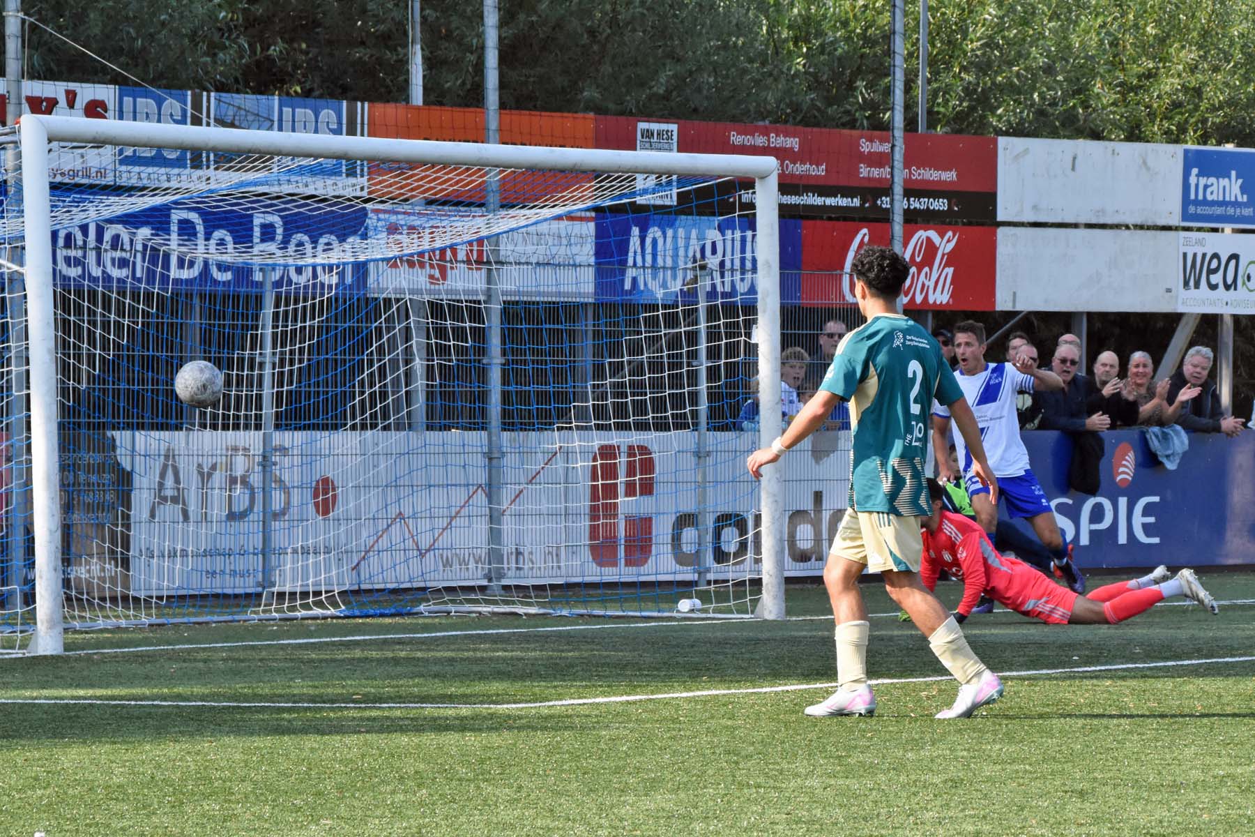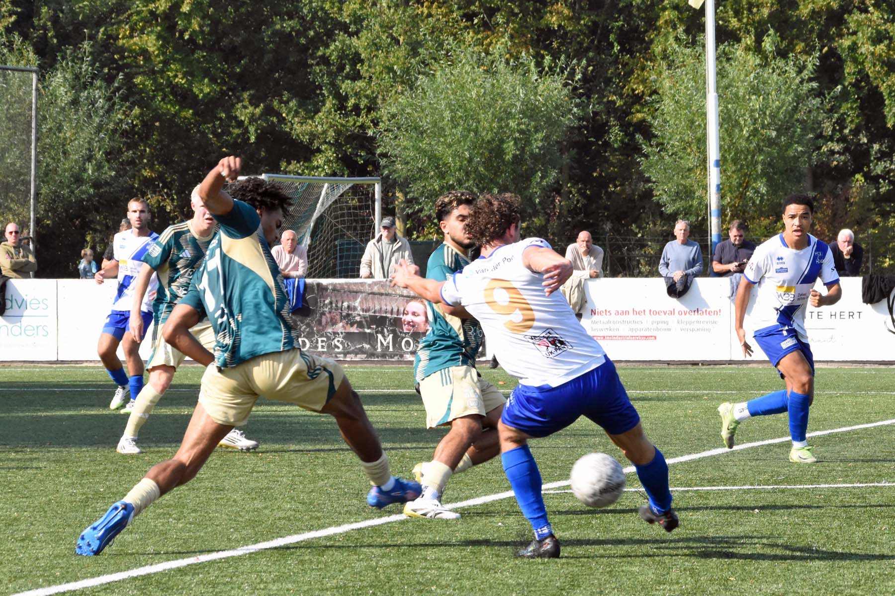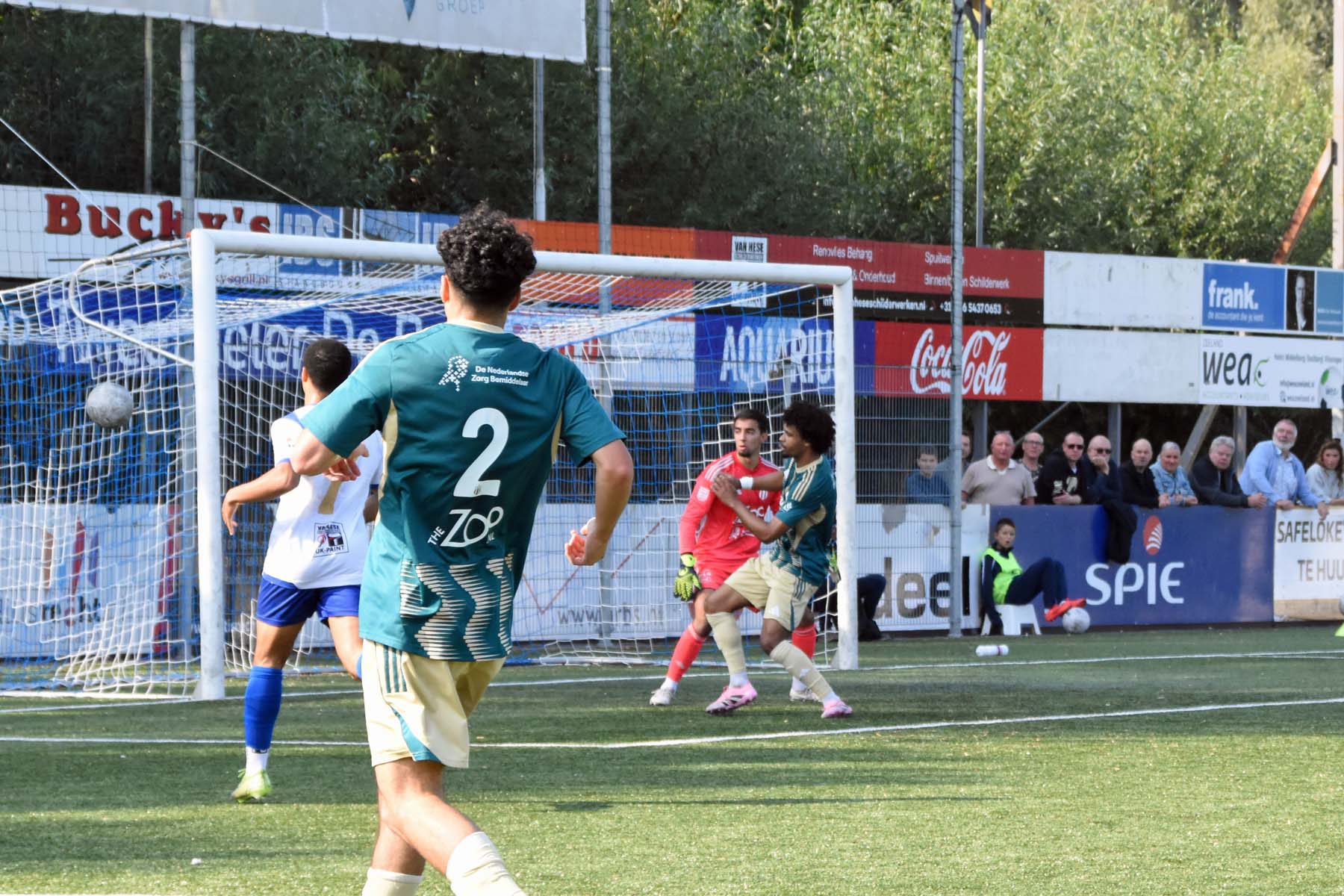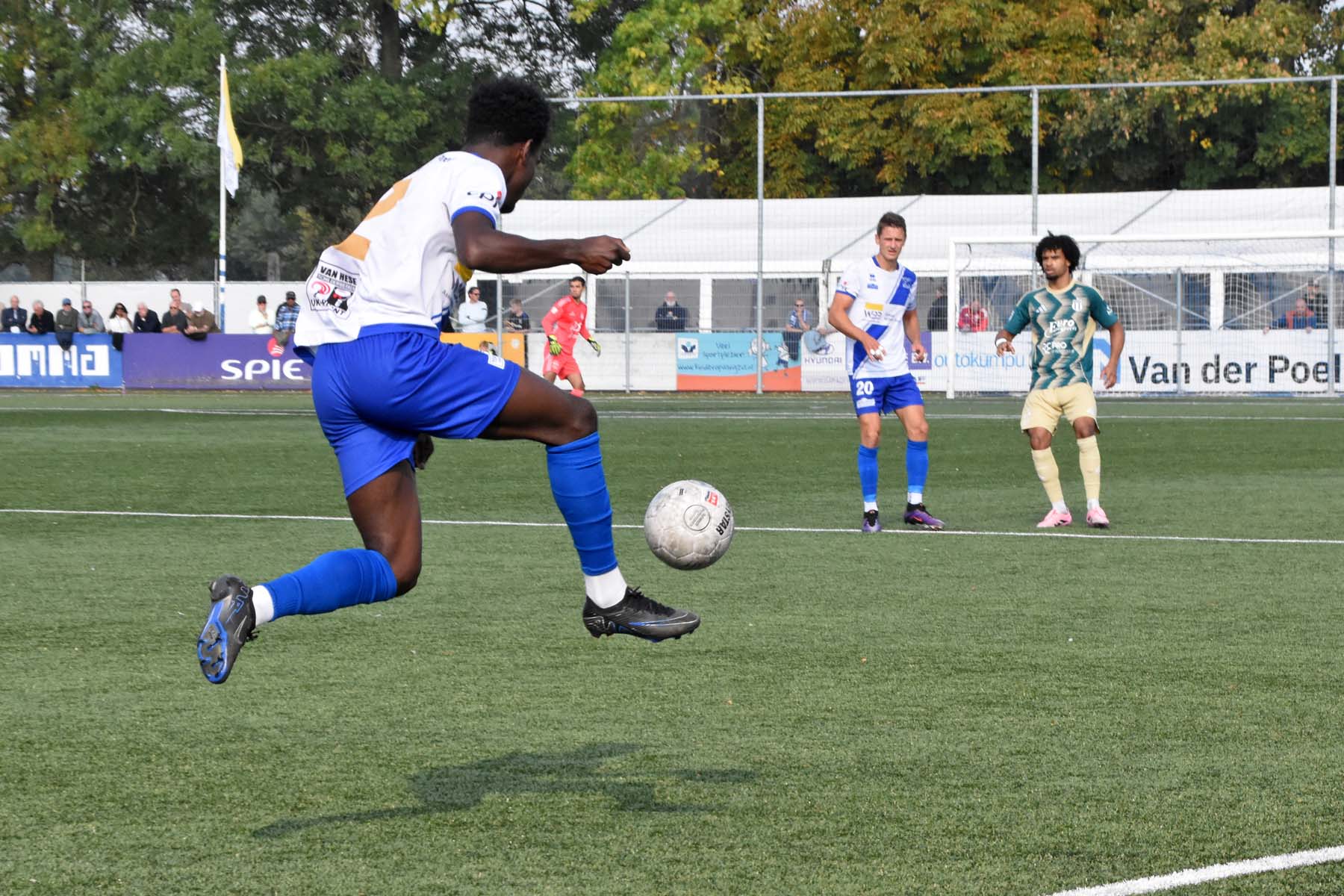 Sylvio Hage probeert het van een afstandje, de bal wordt nog aangeraakt..