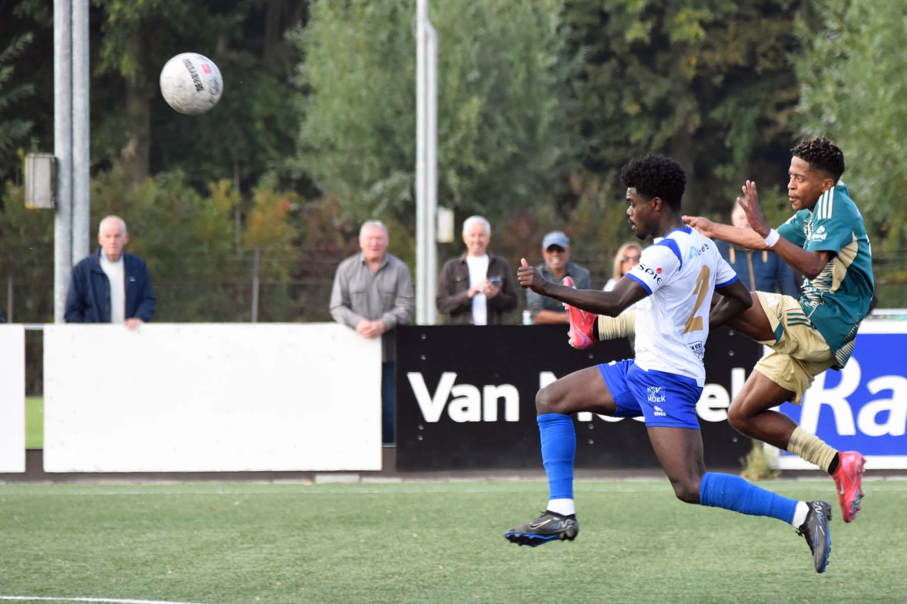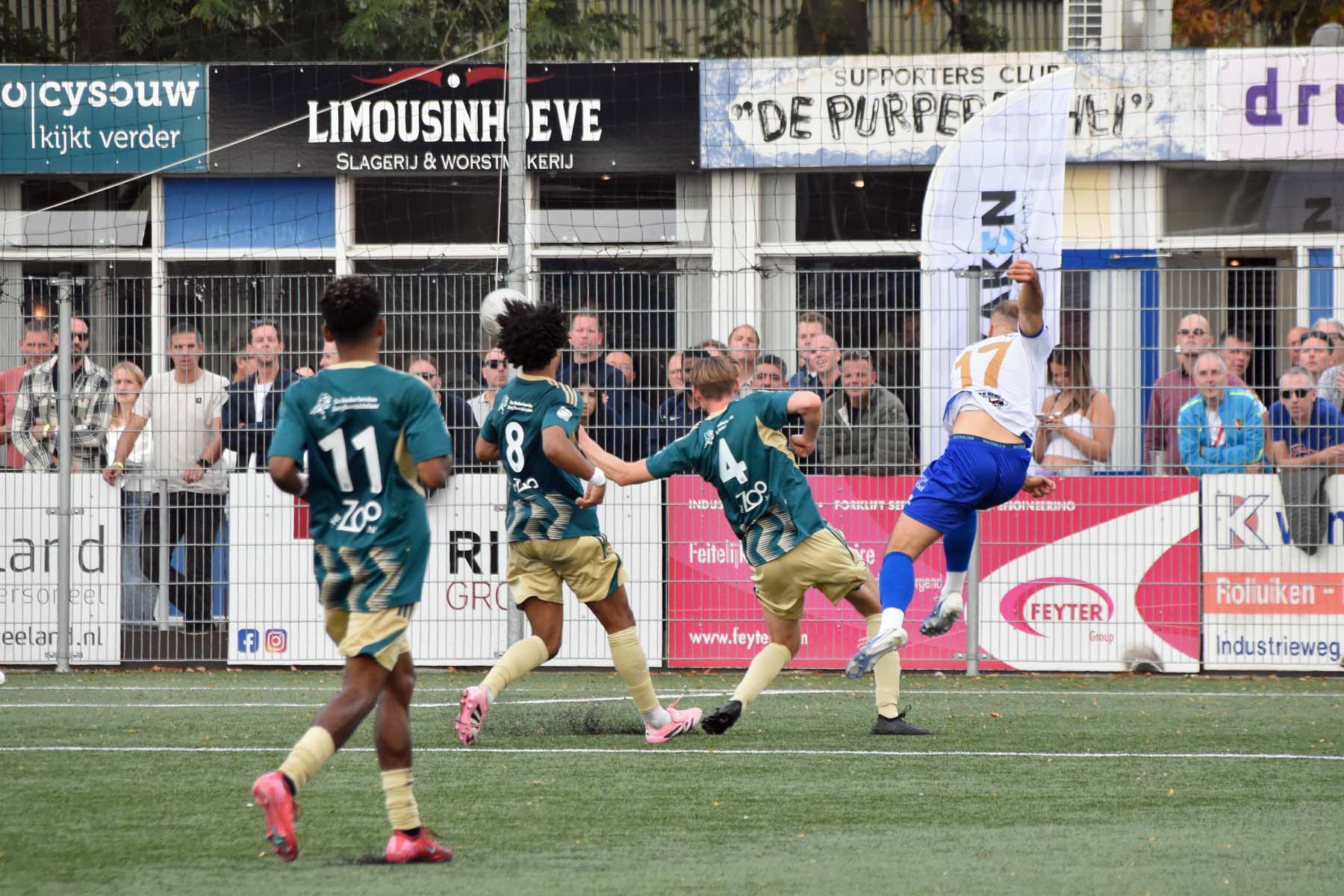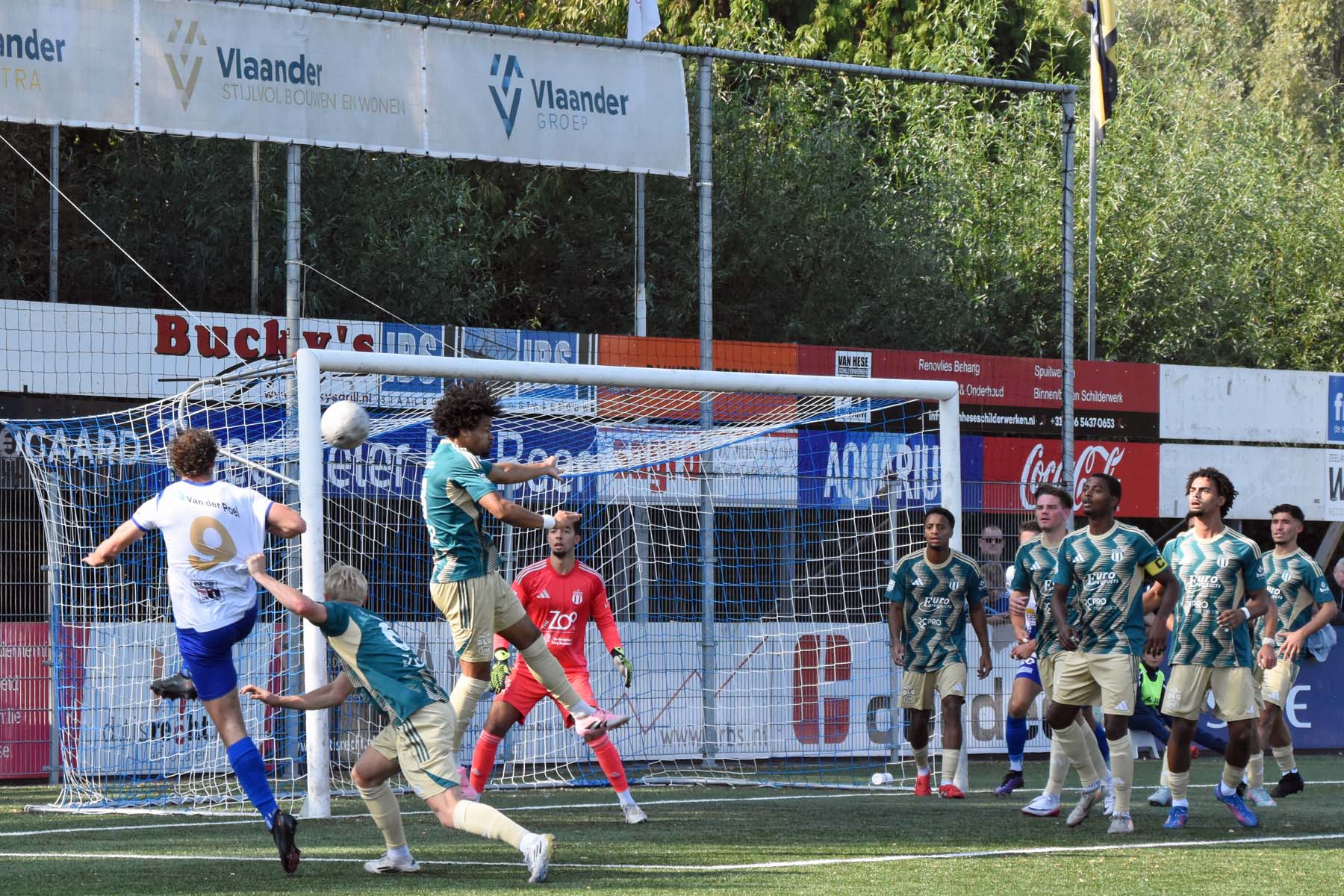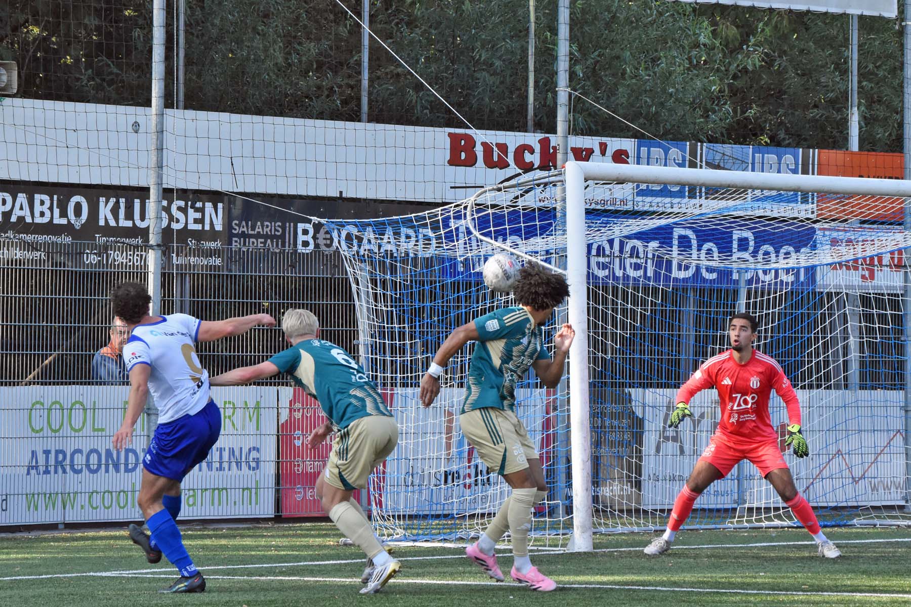 Wout den Engelsman kopt weg voordat Excelsior Maassluis gevaarlijk kan worden.