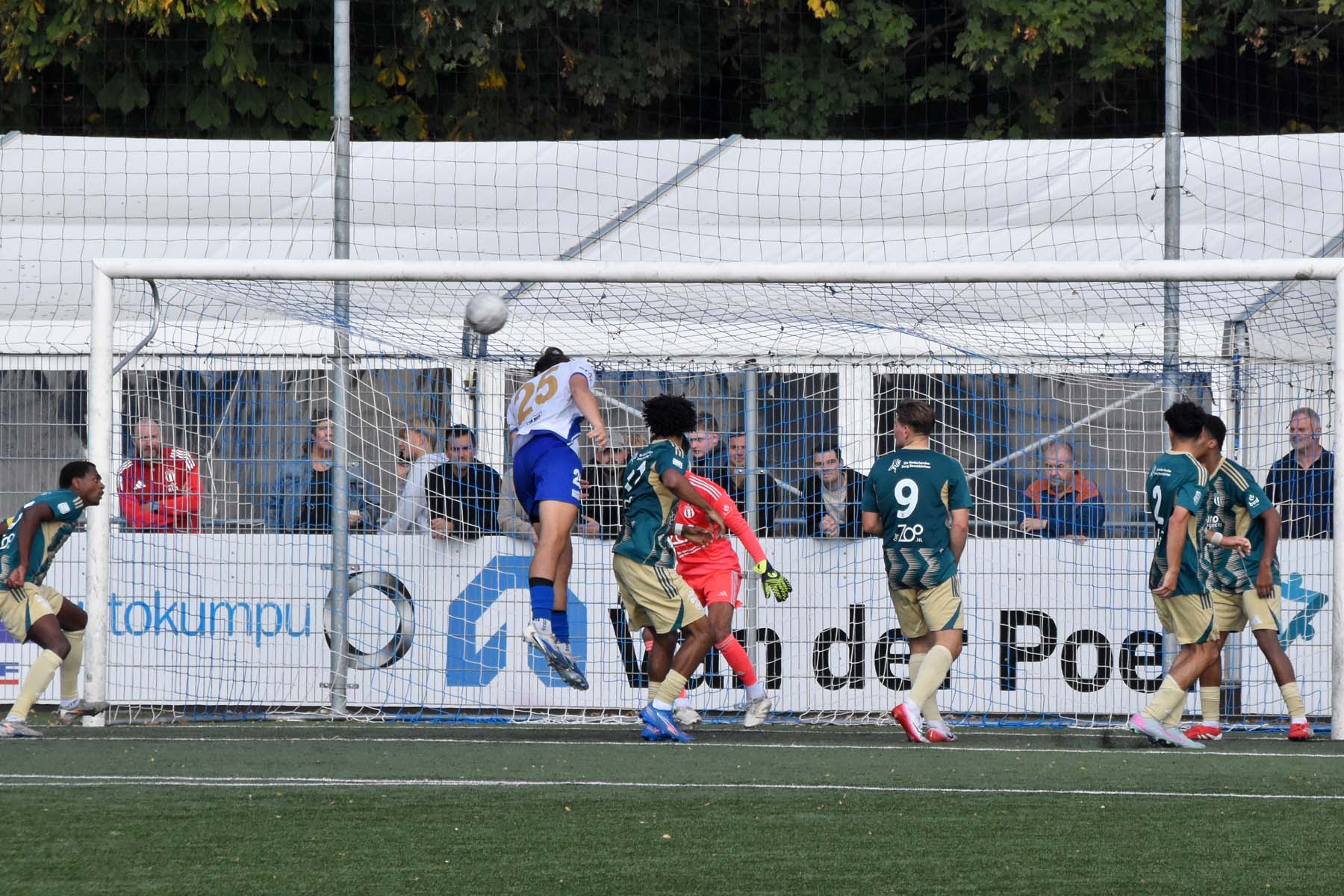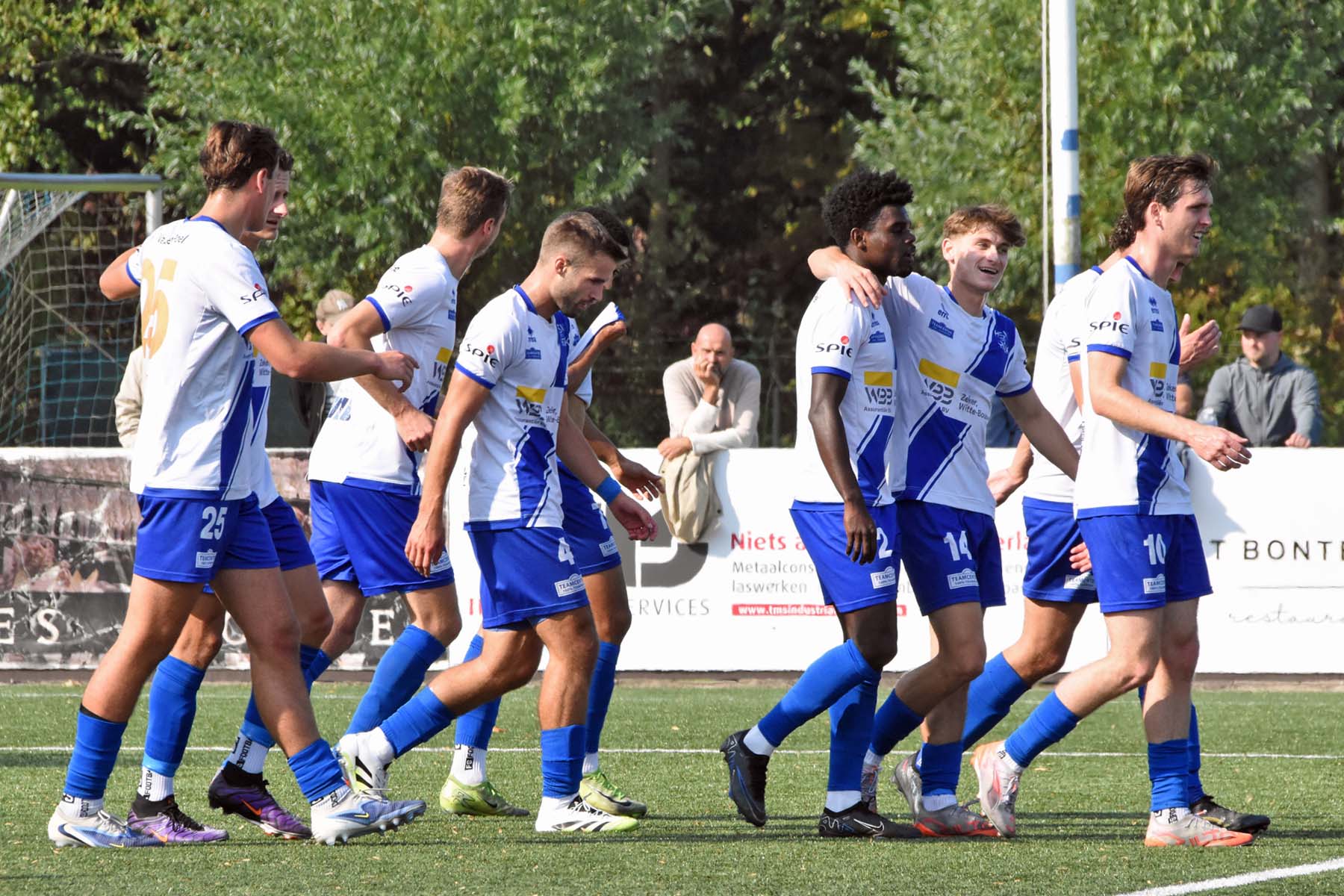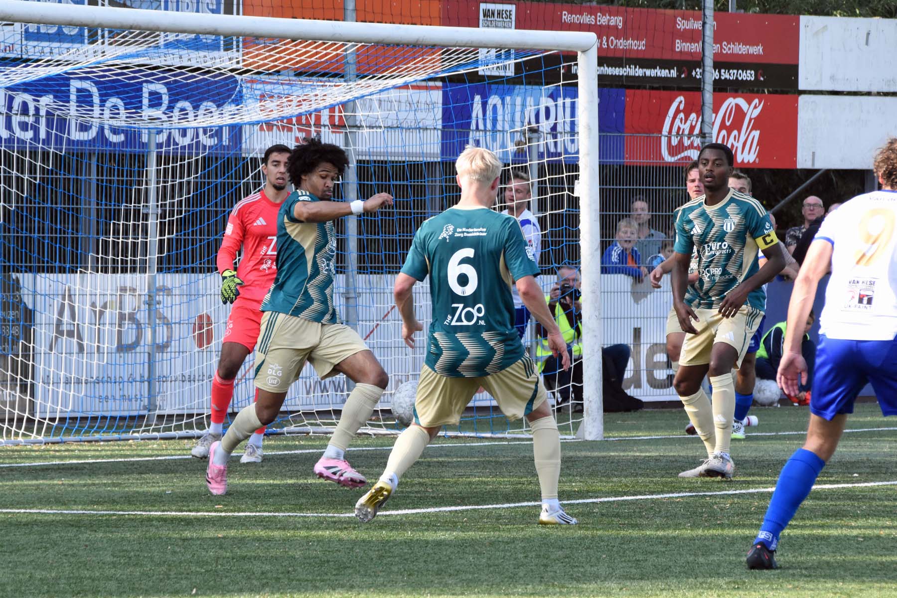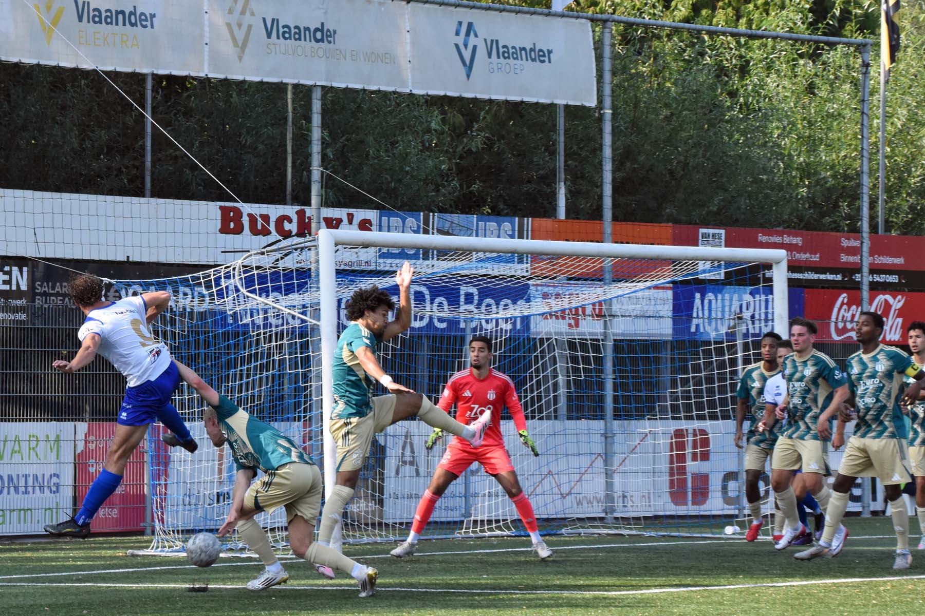 Wout den Engelsman kopt weg voordat Excelsior Maassluis gevaarlijk kan worden.