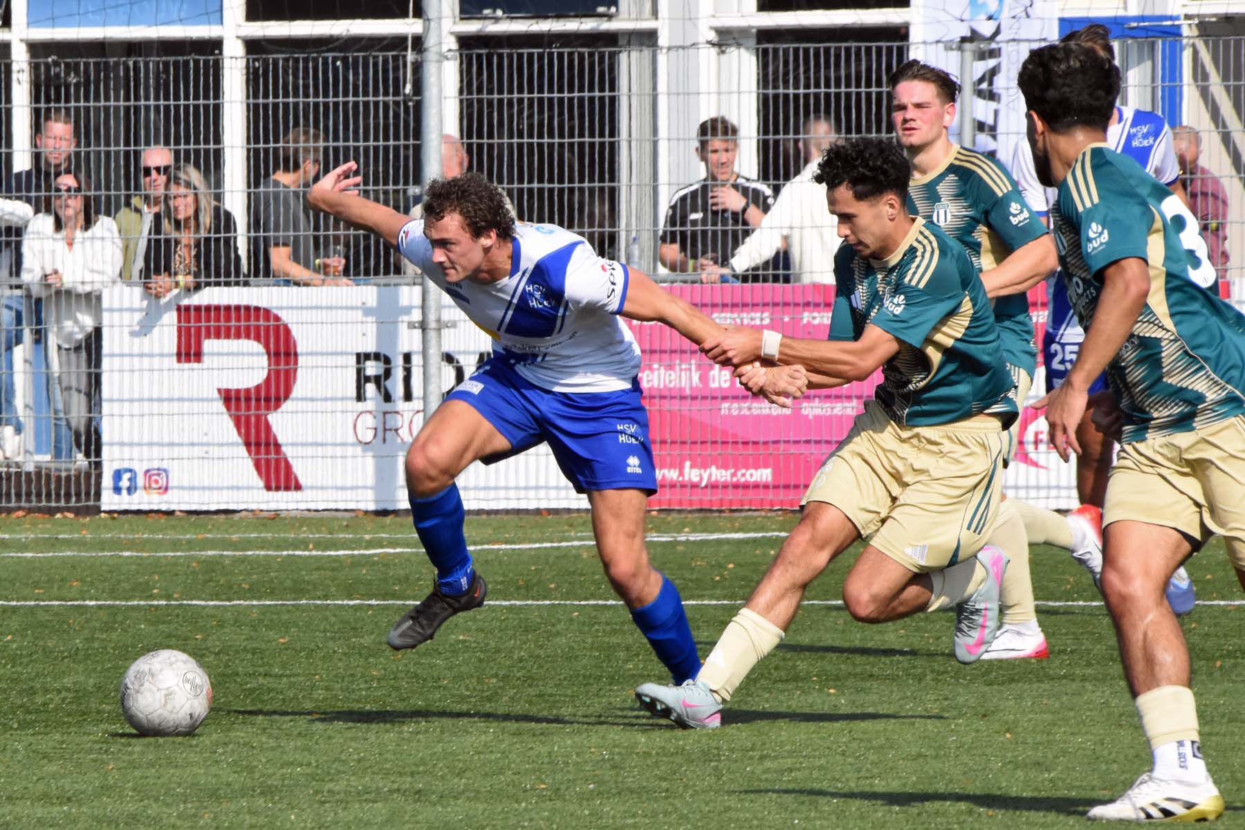 de verdediger van Excelsior Maassluis schiet de bal in eigen doel, corner rest voor HSV Hoek...