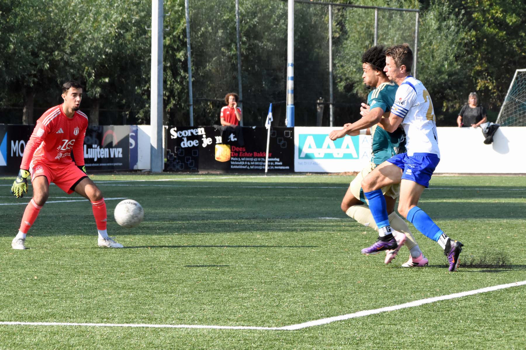 Eerste waarschuwing van Excelsior Maassluis. Tussen Wout den Engelsman en Gertjan Martens probeert de spits toch over Finn Murre te krijgen..